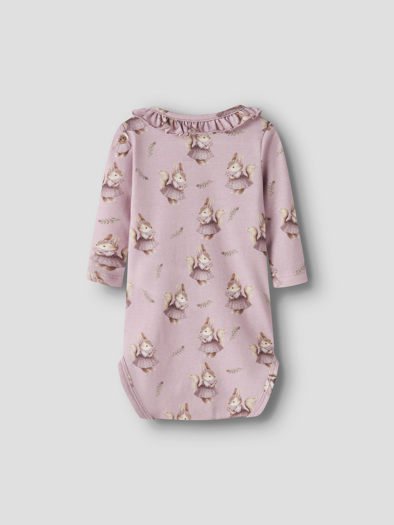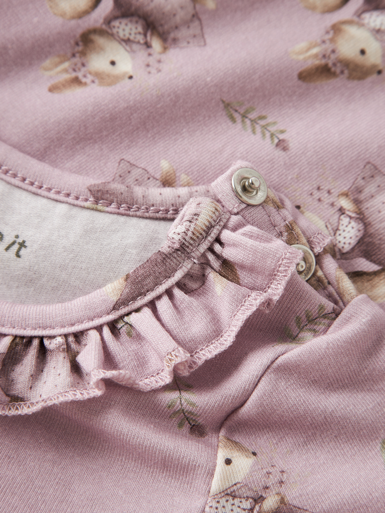 Den sødeste body fra name it. Den er i en skøn farve og med et fint dyre motiv på, og en sød flæsekant ved halsen.