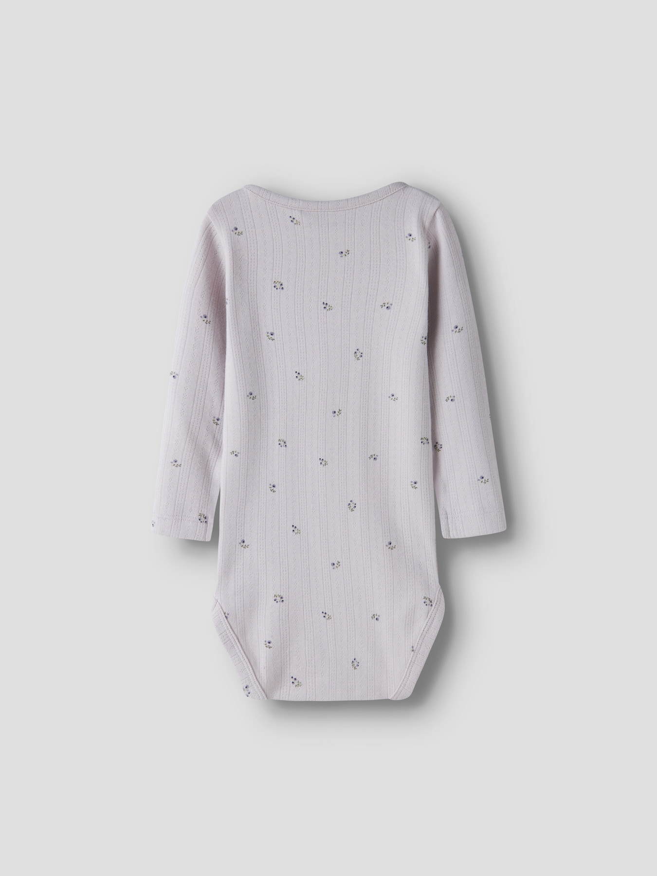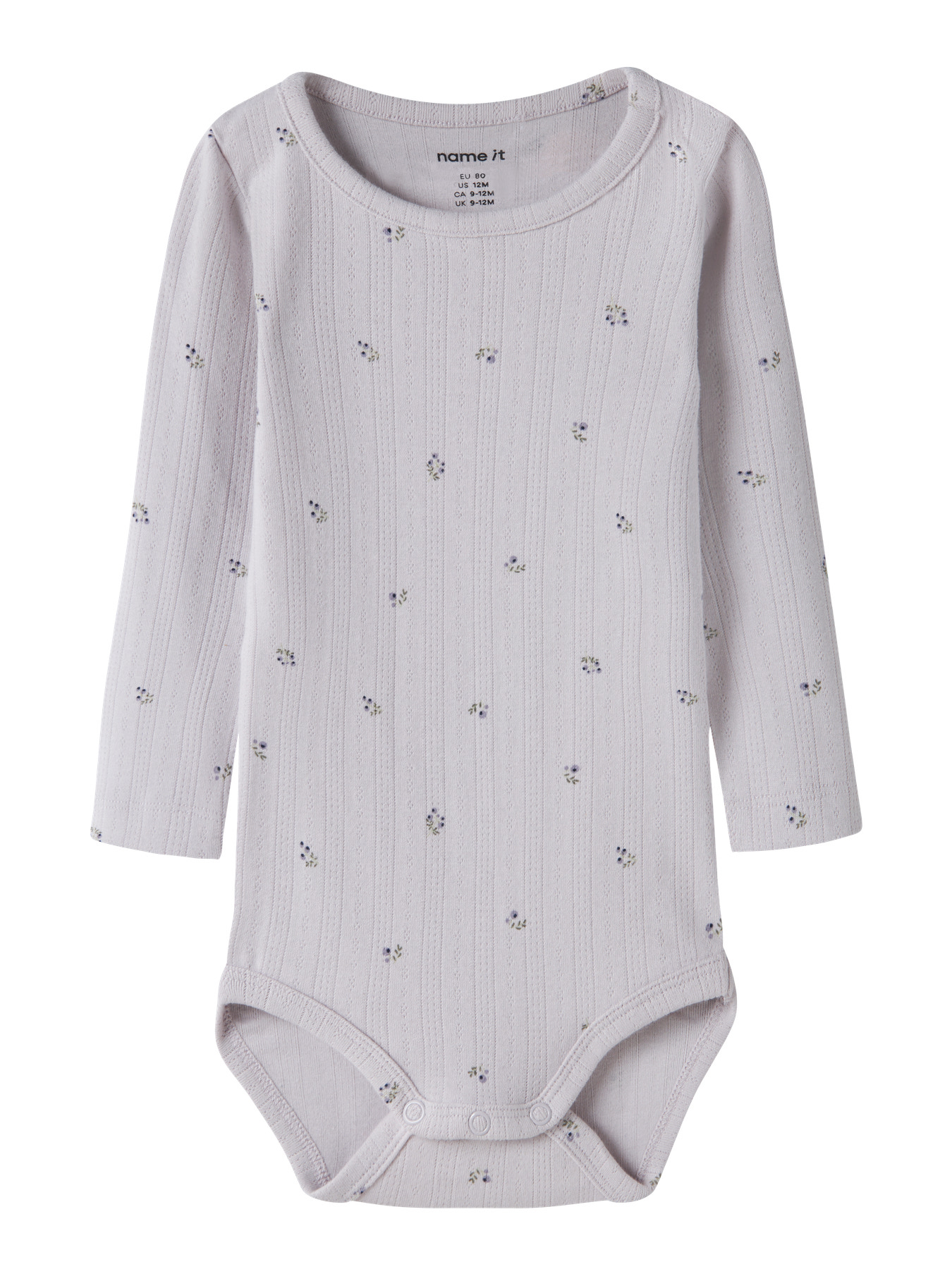 En yndig body med lange ærmer fra Name it i en helt lys beige farve og med bærprint. Blusen er i det smukkeste hulmønster.