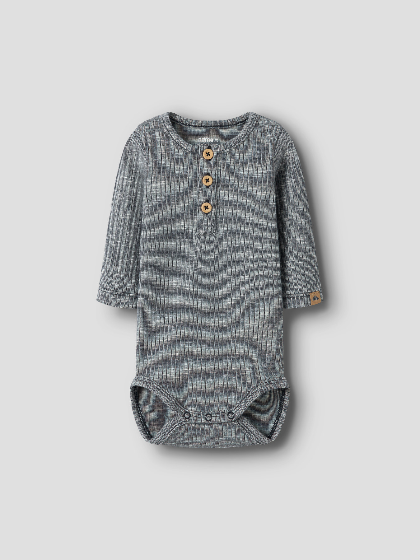 Opdater dit barns garderobe med den blødeste og praktiske body fra Name It. Den har rund hals, lange ærmer, knapper foran ved brystet og mellem benene samt et lille badge som sød detalje. Perfekt til brug hele året.