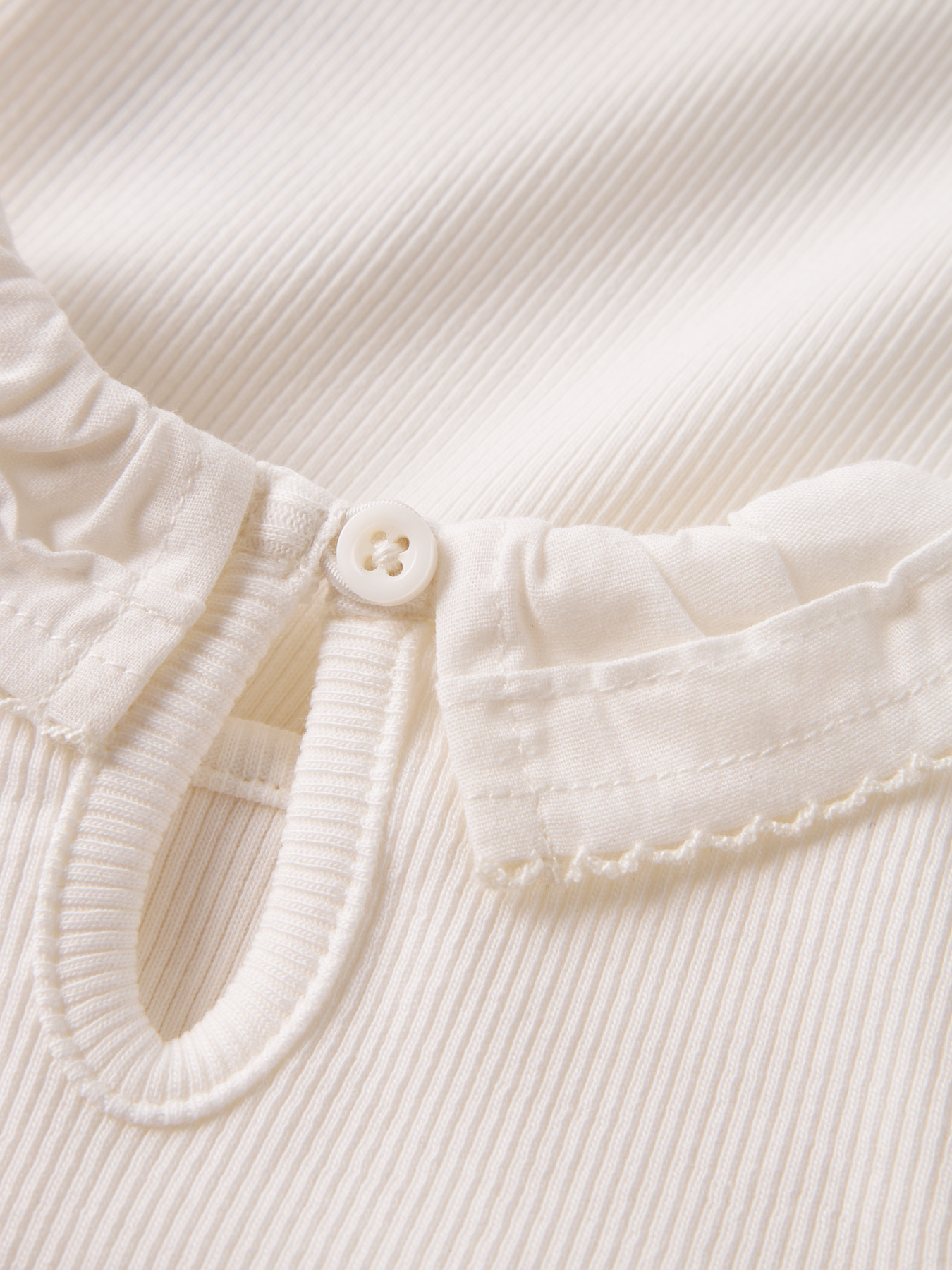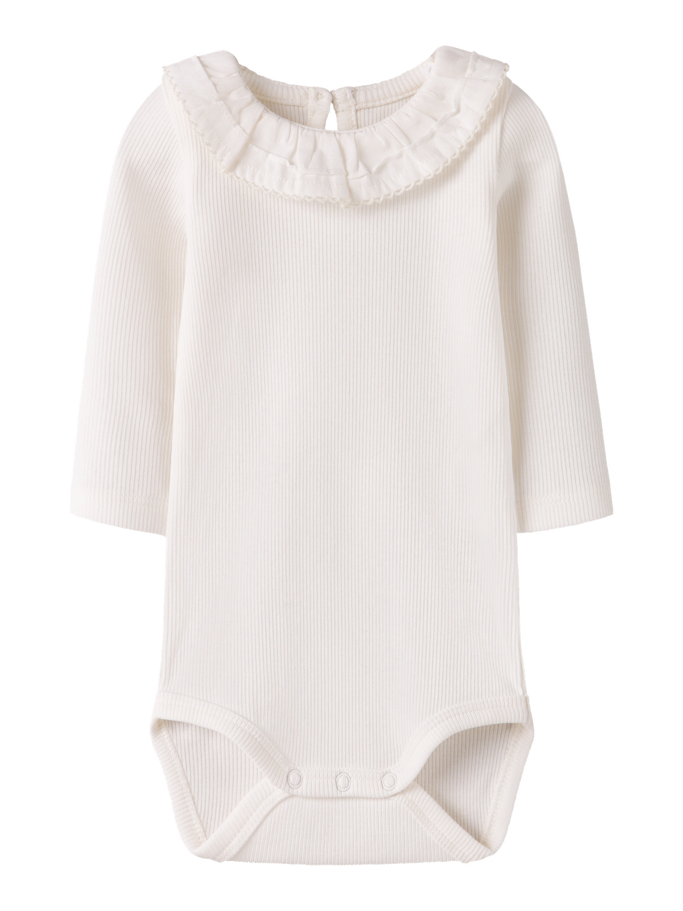 Body fra name it, den er fremstillet i ribstrik med lodret, stribet struktur og god elasticitet, der sikrer en komfortabel pasform og et tidløst udtryk. Den har rund hals og lange ærmer samt knap- og strop-lukning ved halsen og trykknapper i skridtet, som gør af- og påklædning nem og hurtig.