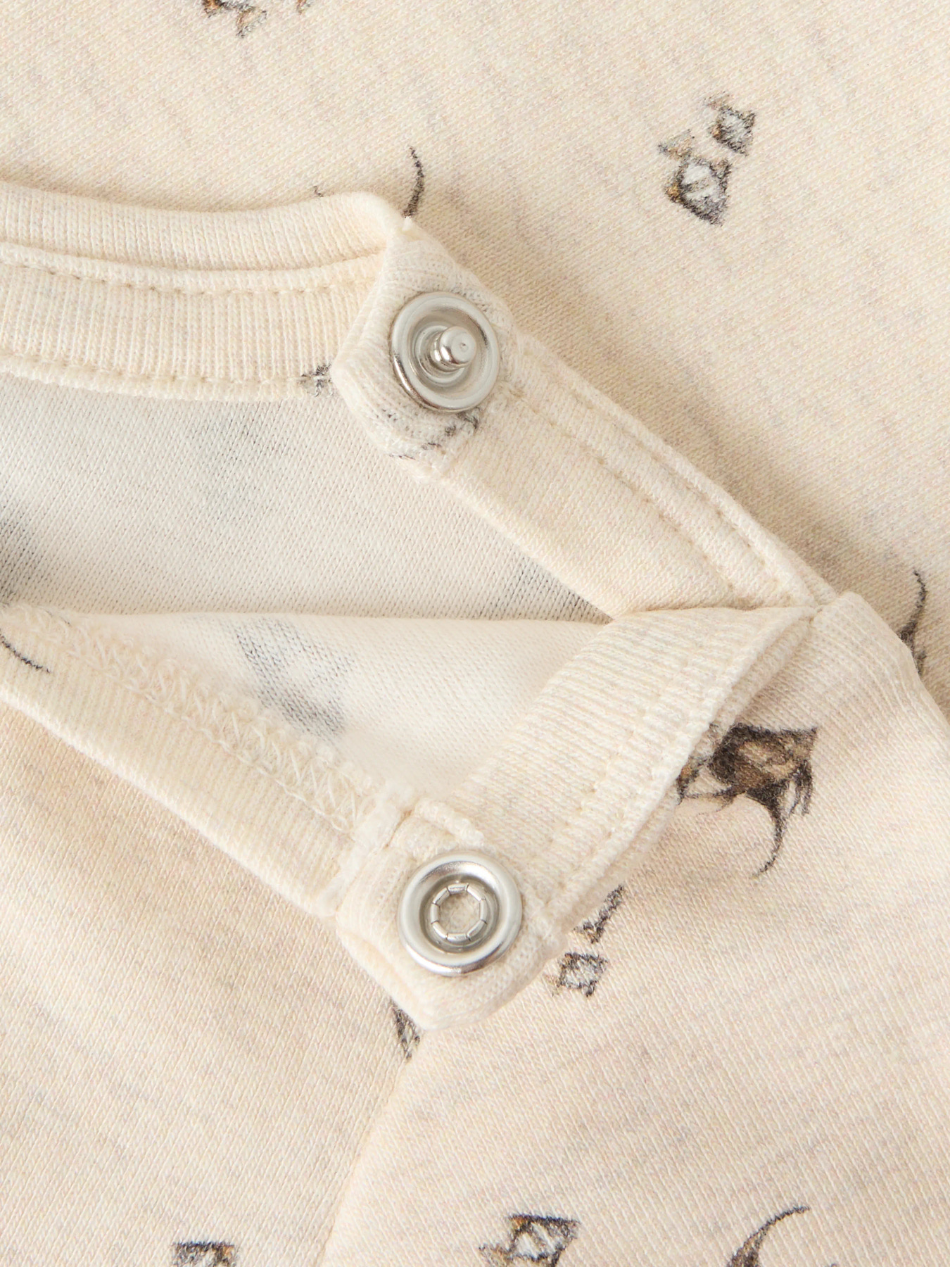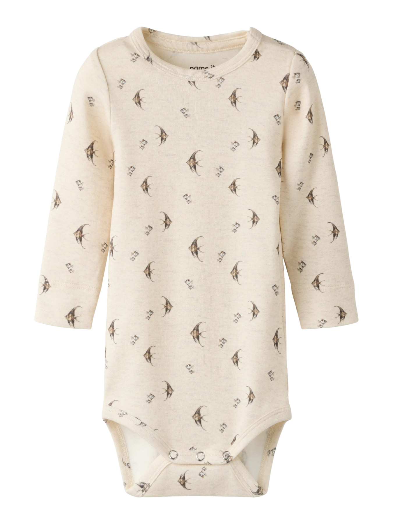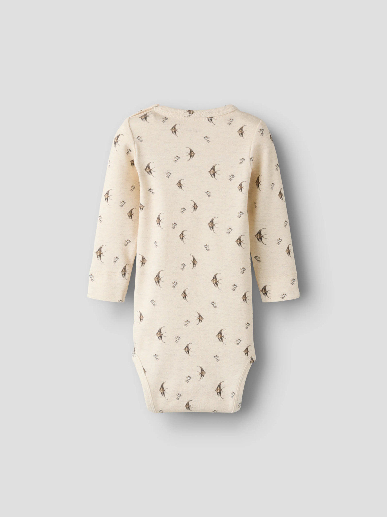 Blød og praktisk bodystocking med lange ærmer og rund hals, ideel til brug året rundt. Den er lavet i ribstrik, som sikrer en komfortabel og fleksibel pasform. Trykknapper ved skulder gør den nem at få af og på, mens det gennemgående print giver et moderne udtryk.