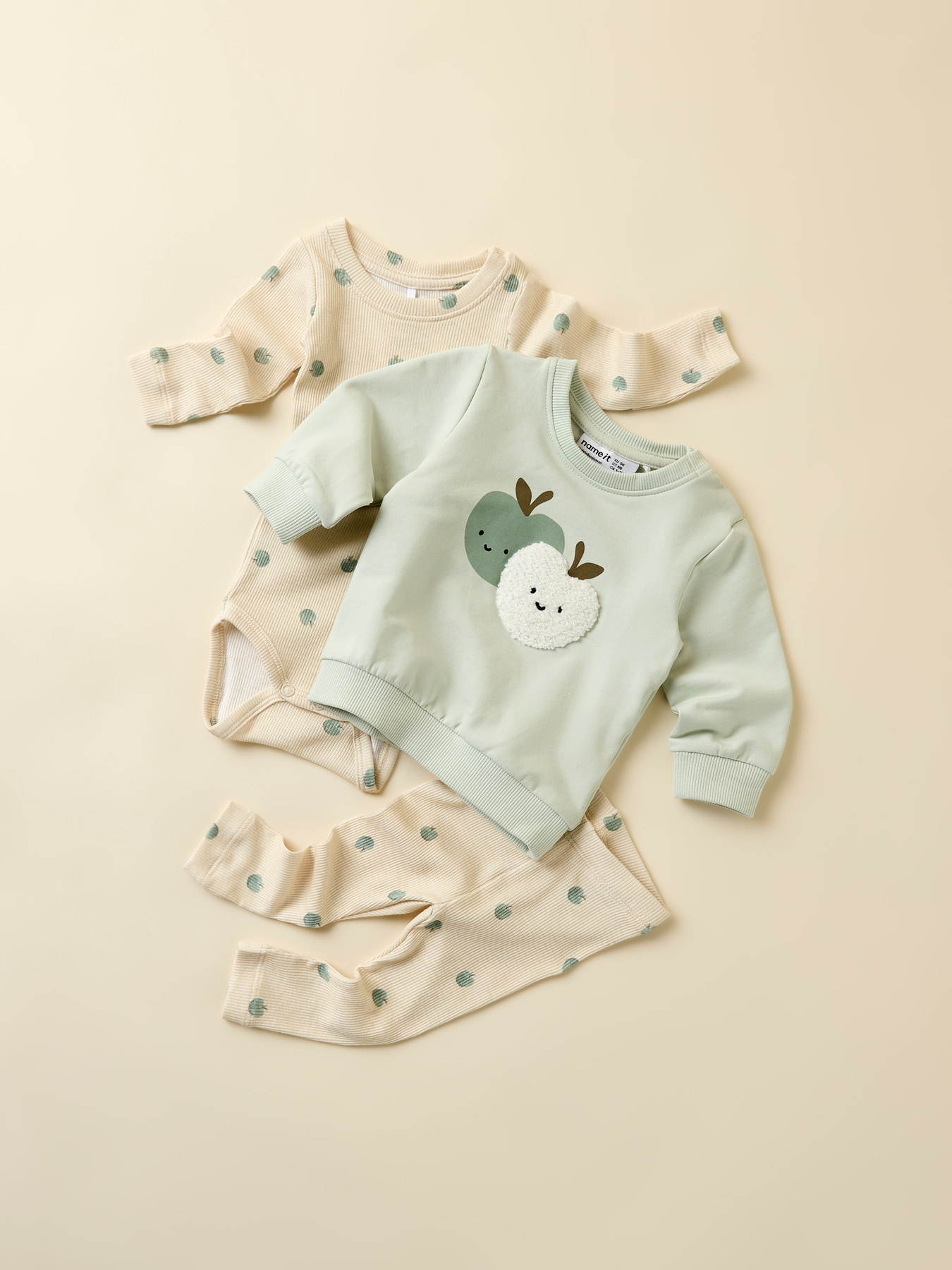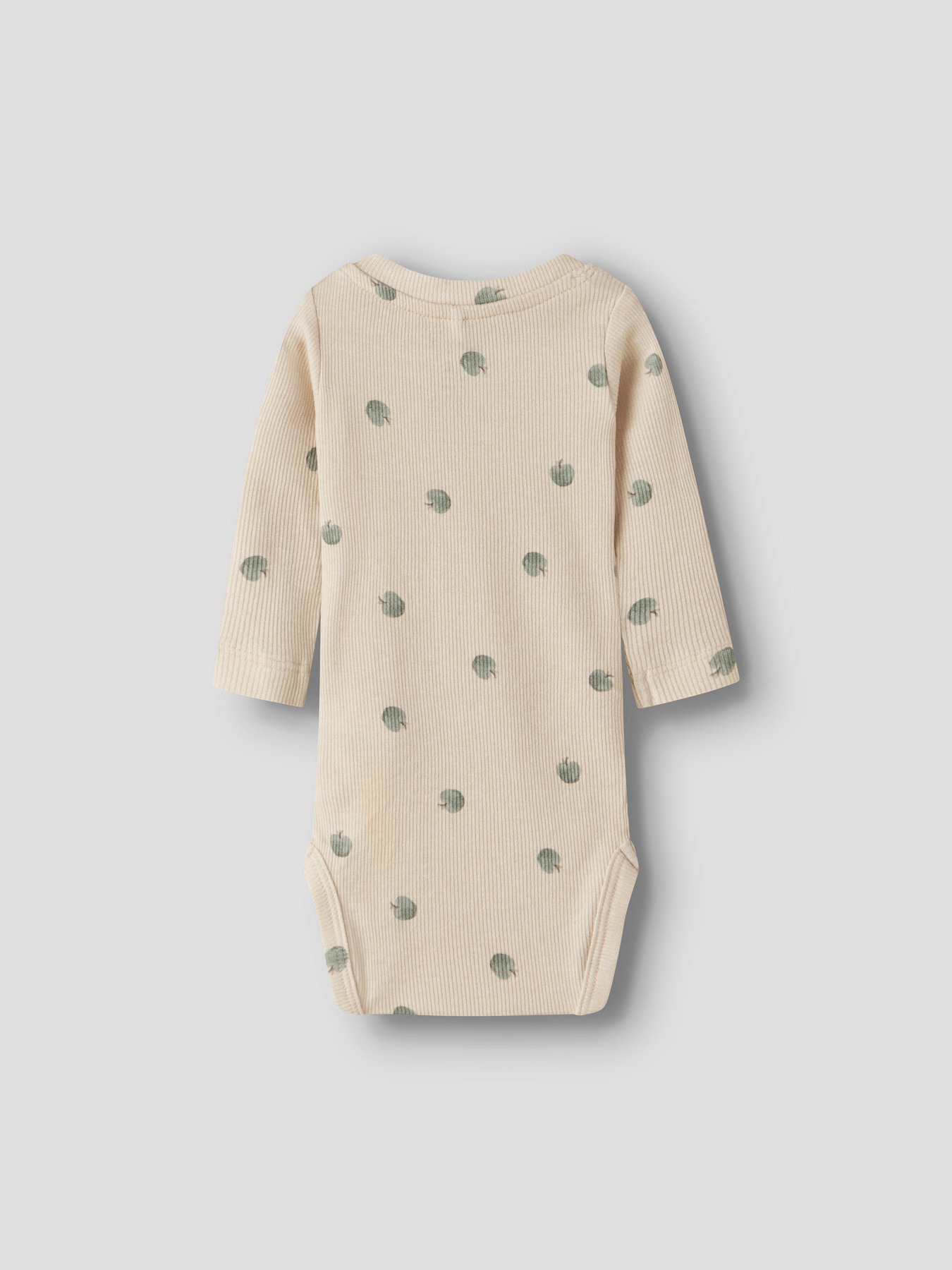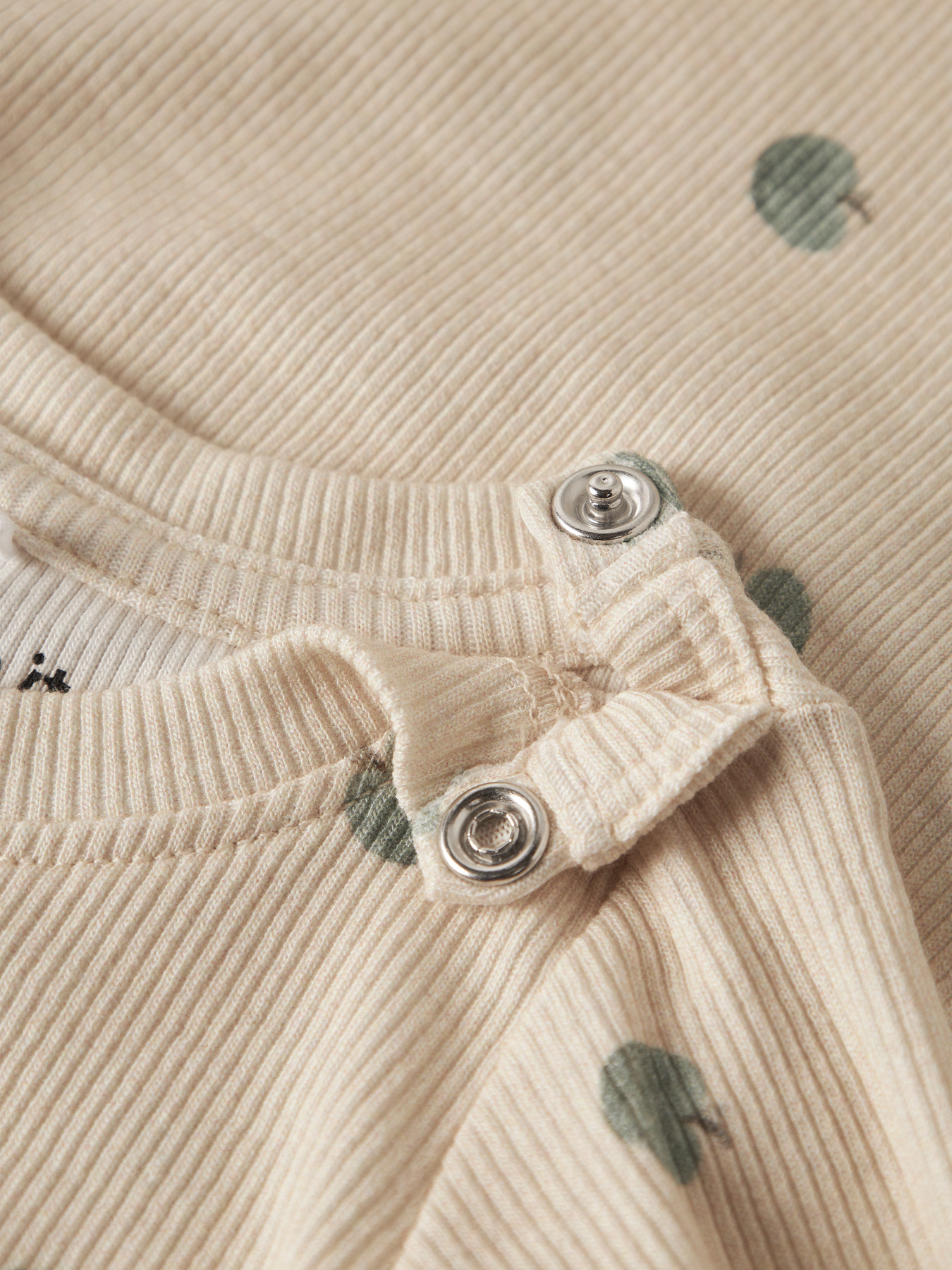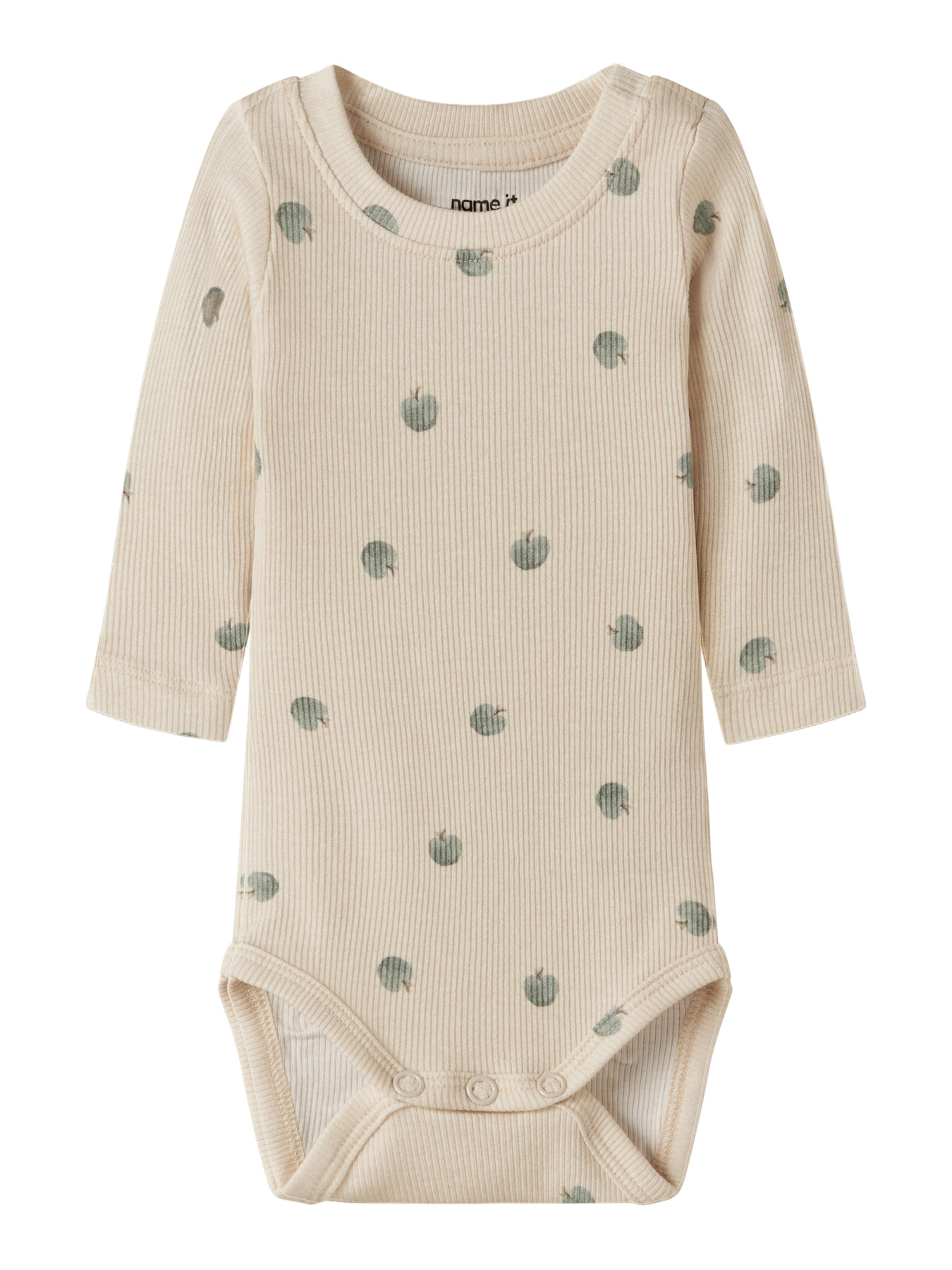 Body der har et ribstrikkede materiale har en let stribet struktur og god elasticitet, som sikrer en behagelig pasform og et tidløst look. Bodystockingen har rund hals, lange ærmer samt trykknapper.