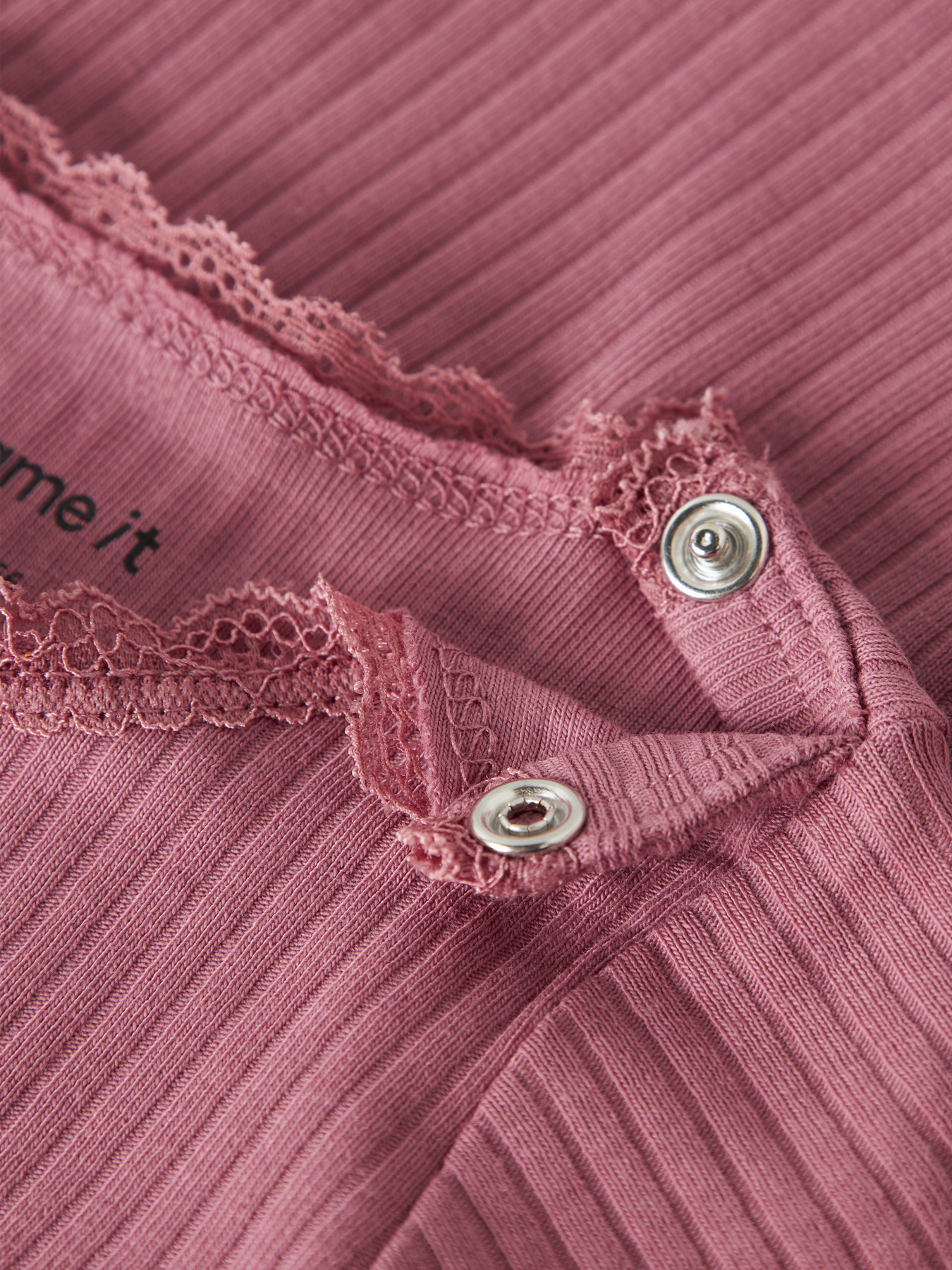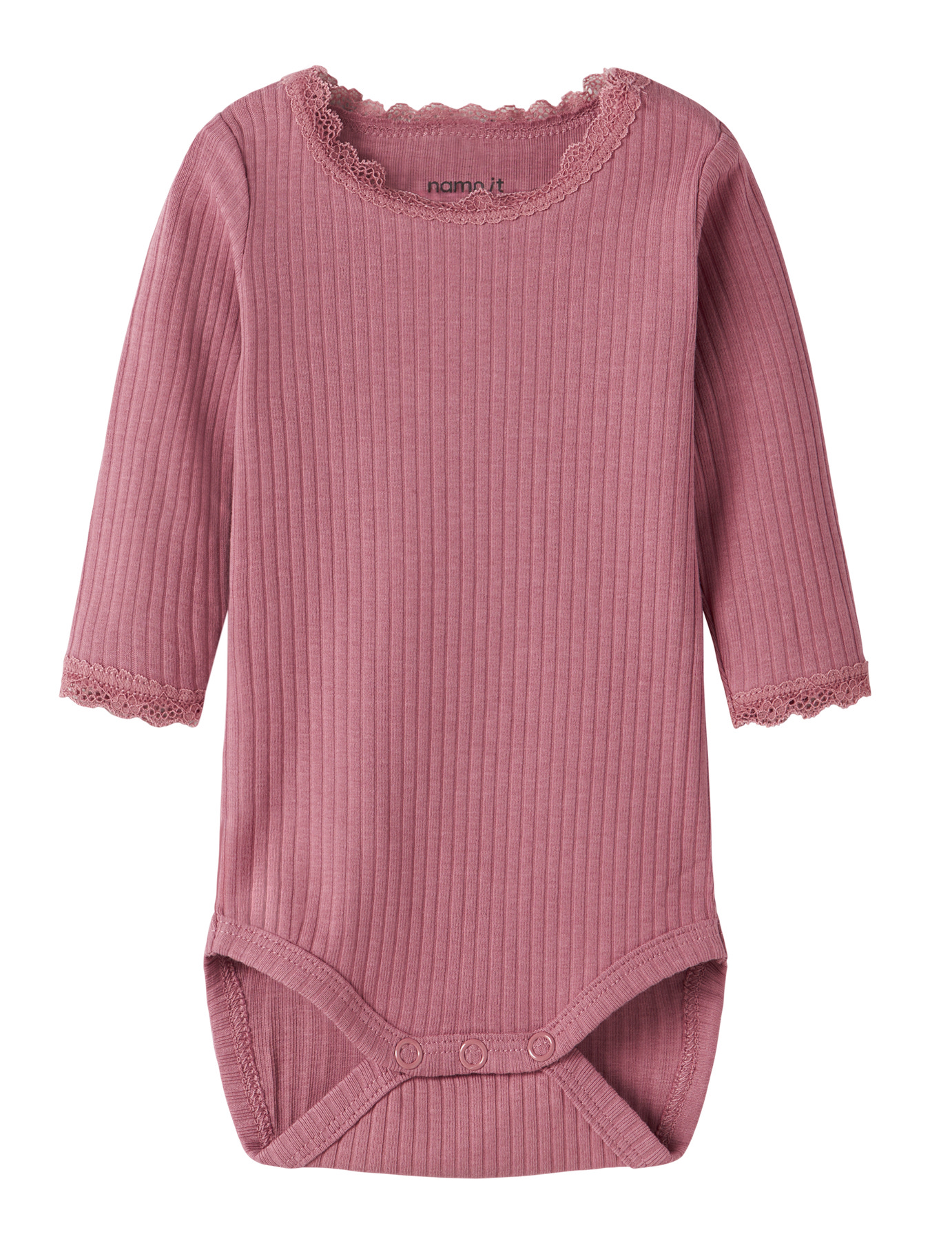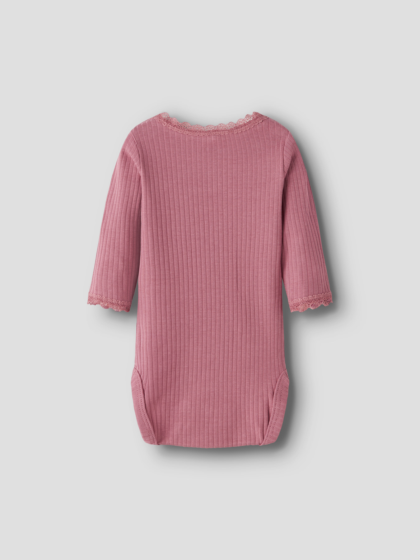 Bløde og praktiske body, perfekt til brug året rundt. Den er lavet i ribstrik med en lodret, stribet struktur og god elasticitet, som giver en behagelig pasform og et tidløst udtryk. Bodyen har rund hals, lange ærmer samt fine blondedetaljer ved manchetterne og som ekstra pynt. Praktisk lukning med trykknapper i skridtet og ved skulderen gør den nem at tage af og på.