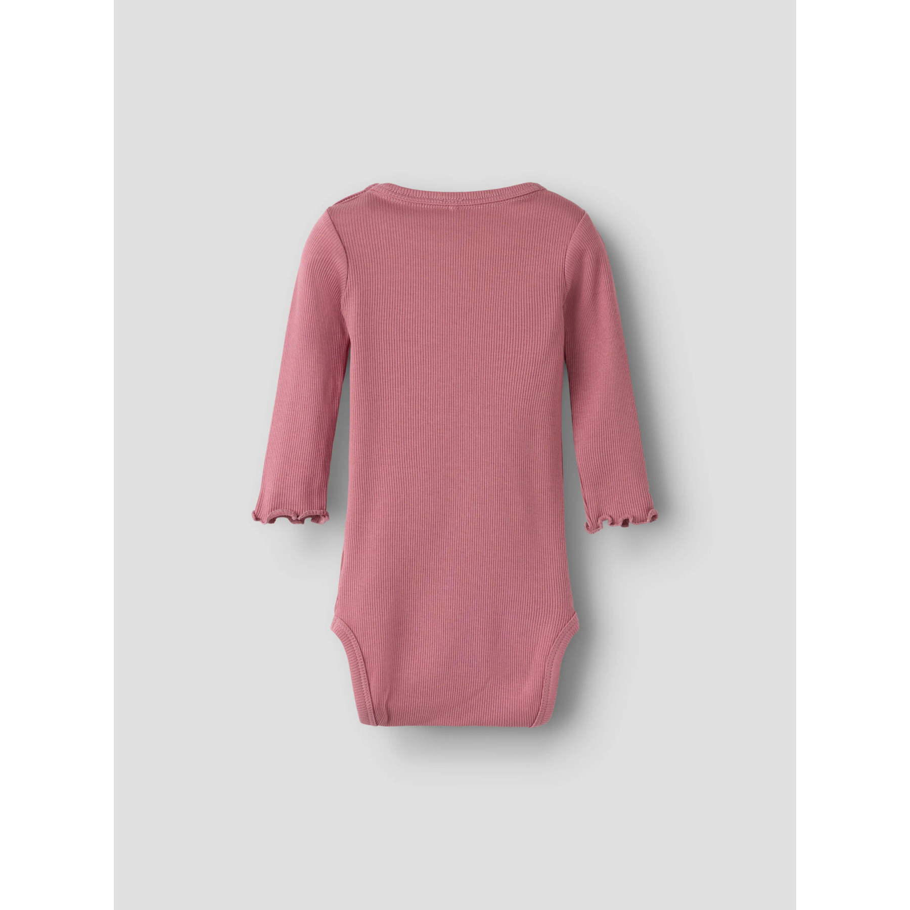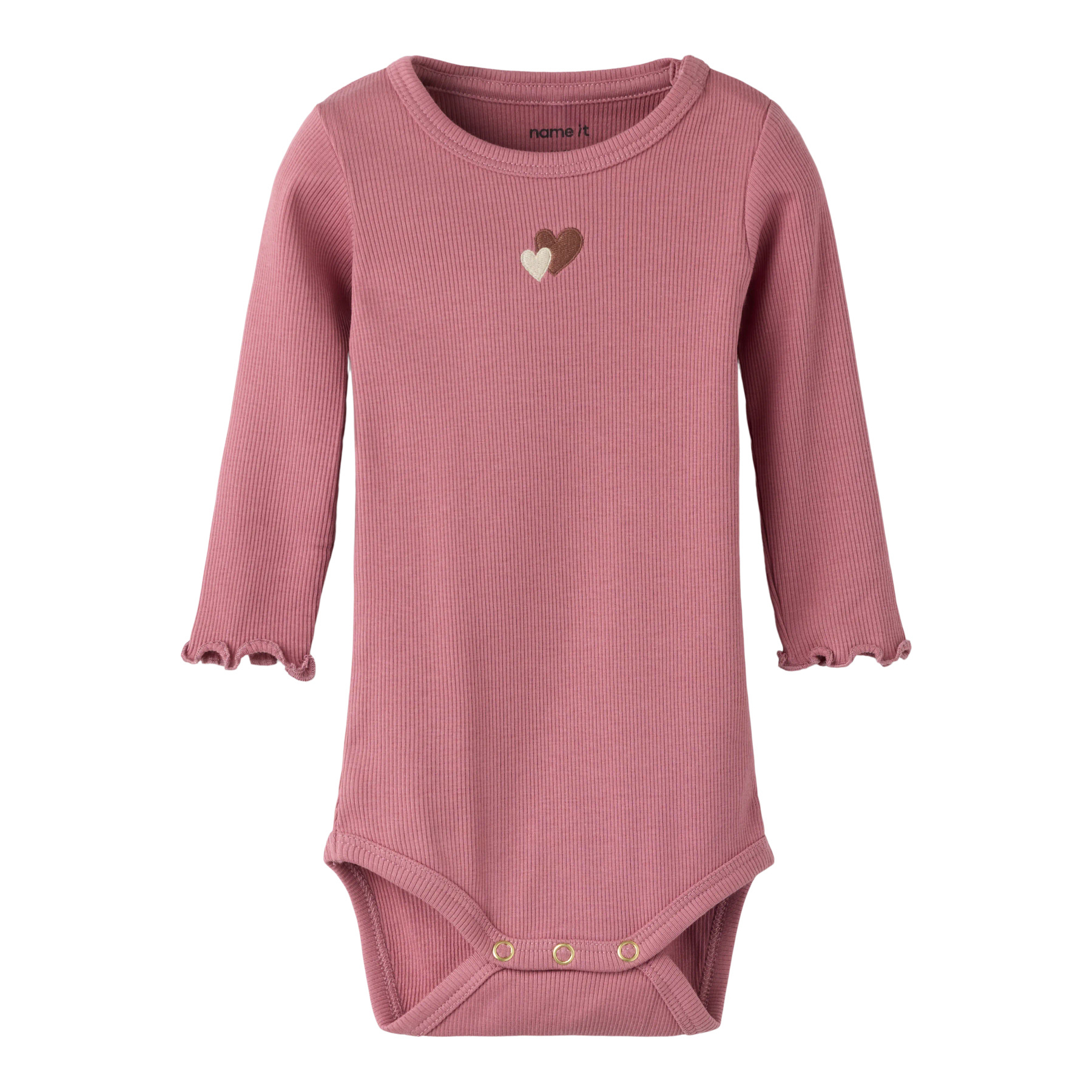 En blød ribstrikket body med lange ærmer og en rund halsudskæring. Den har to broderede hjerter på brystet og fine flæsekanter ved ærmerne. Trykknapper ved skulderen og i skridtet gør den nem at tage af og på, og den økologiske bomuldsblanding med stræk sikrer god komfort og bevægelsesfrihed.