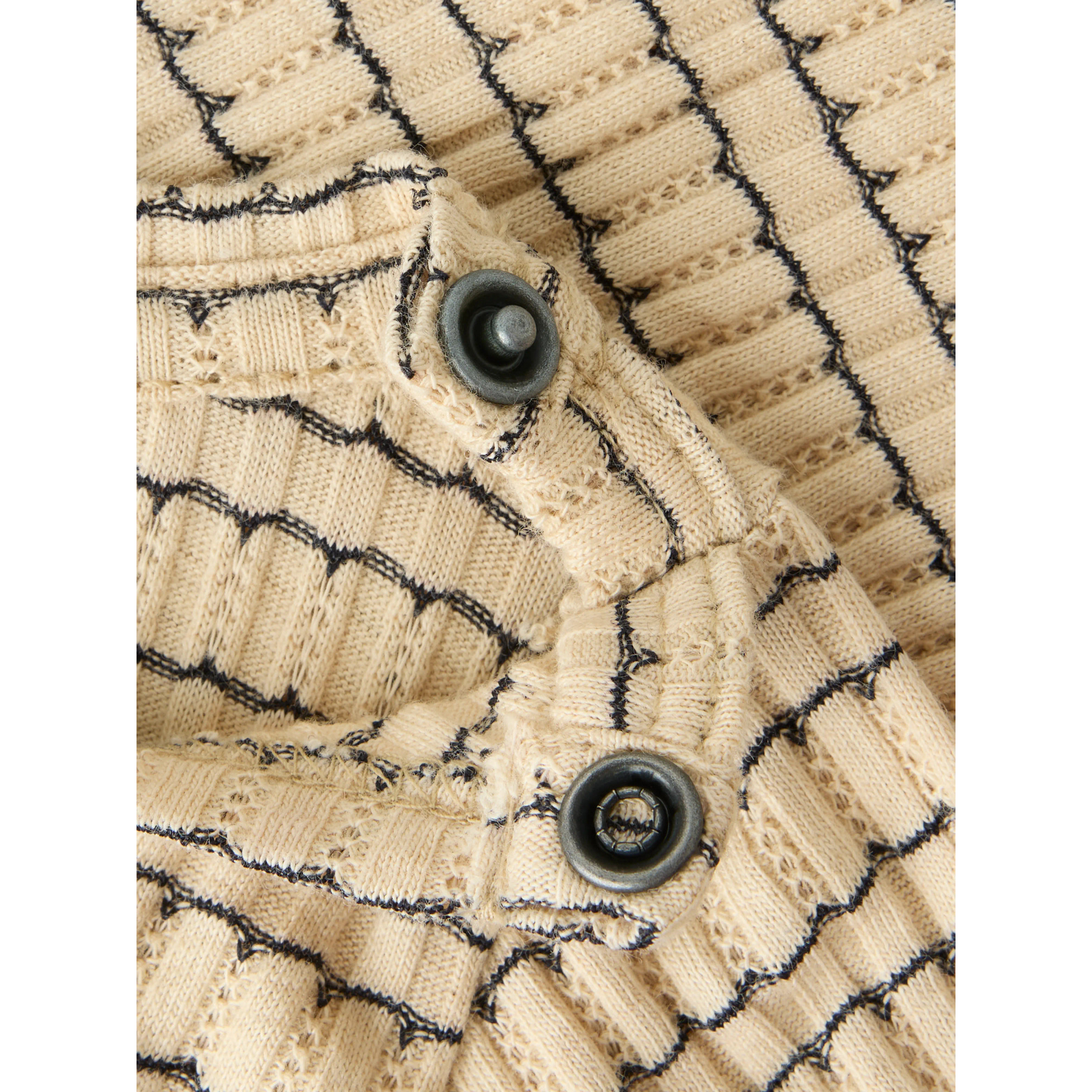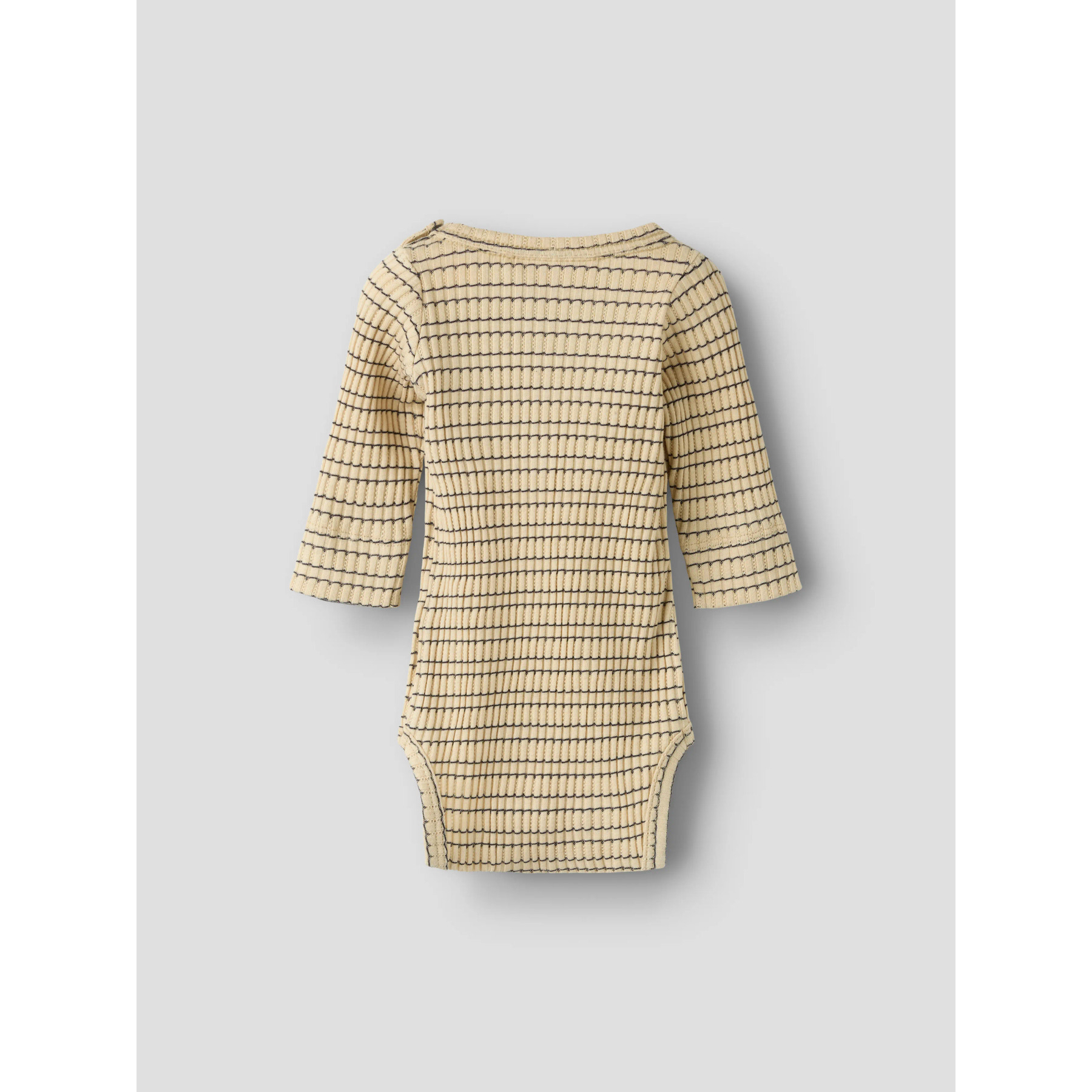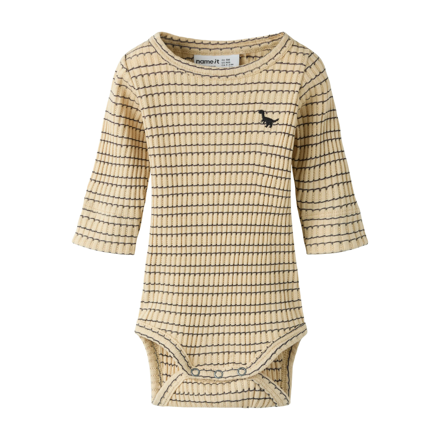 Ribstrikket body med lange ærmer og rund hals, designet med et stribet mønster og en lille broderet dinosaur på brystet. Den bløde ribkvalitet giver god elasticitet og komfort, mens trykknapper ved skulder og bleen gør den praktisk i hverdagen.
