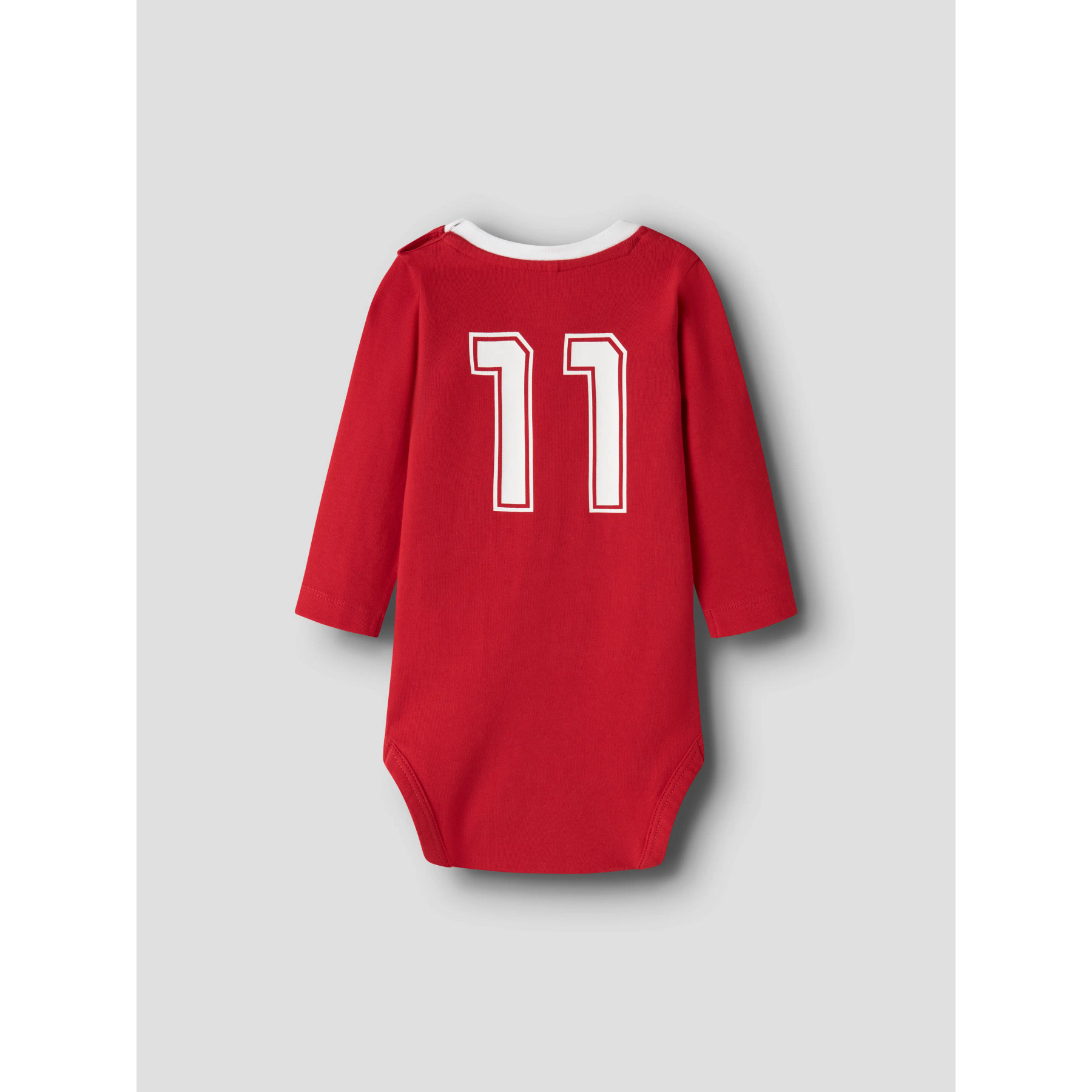 En blød bodysuit med lange ærmer og rund hals, prydet med et cool print af 'DANMARK' og tallet '11' på fronten. Den er designet med trykknapper i skulderen og i skridtet, hvilket gør den praktisk til hverdagsbrug. Fremstillet i en strækbar single jersey-kvalitet med økologisk og genanvendt bomuld.