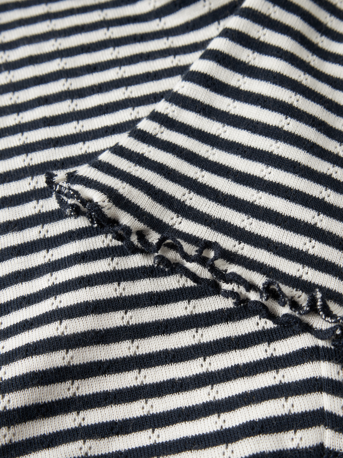 Et par virkelig søde leggings i hulmønster fra Name it med striber i sort og hvid. Nederst er der en fin bølgekant og buksebenene er brede i bunden. Blød elastik i taljen.