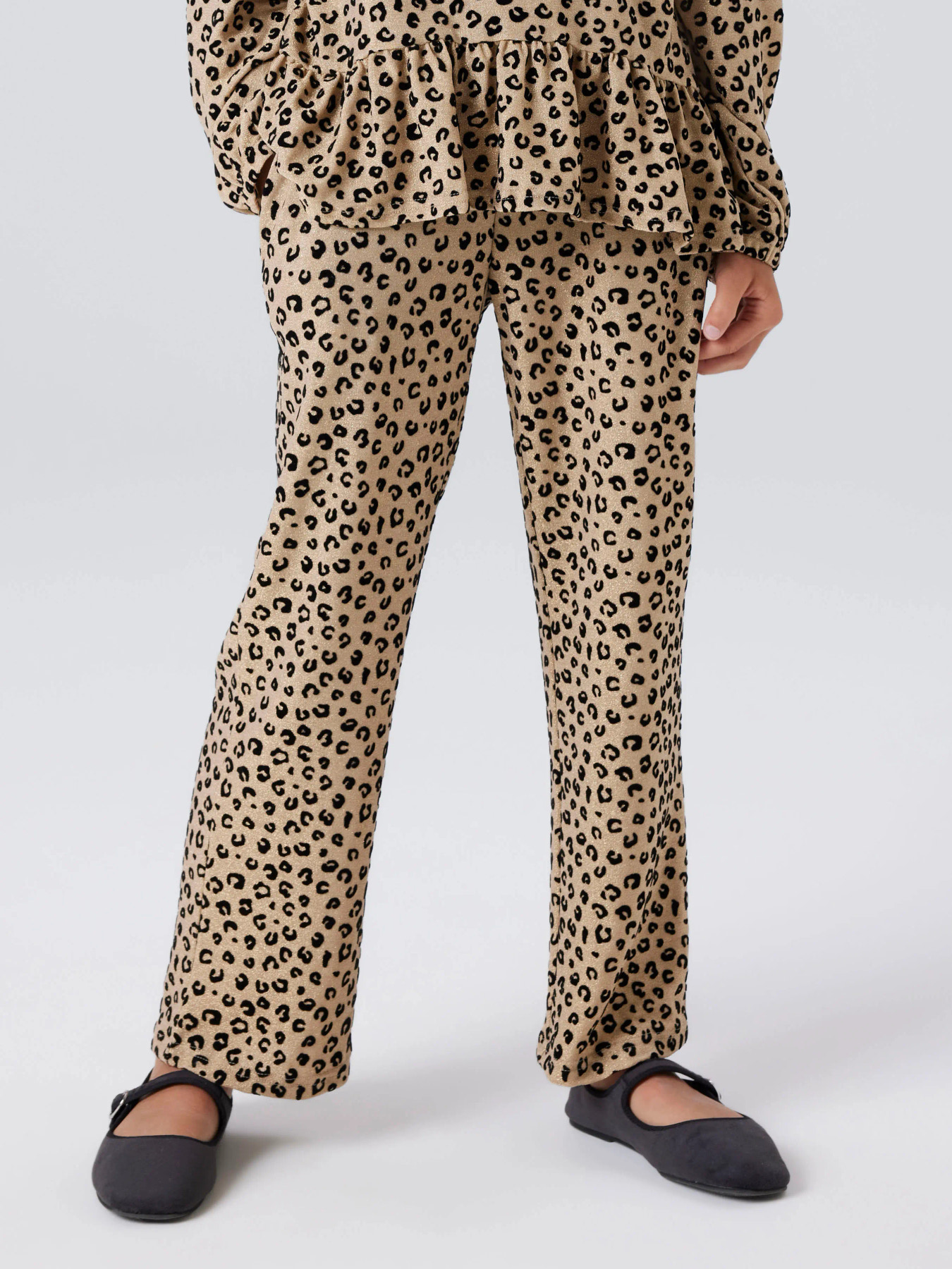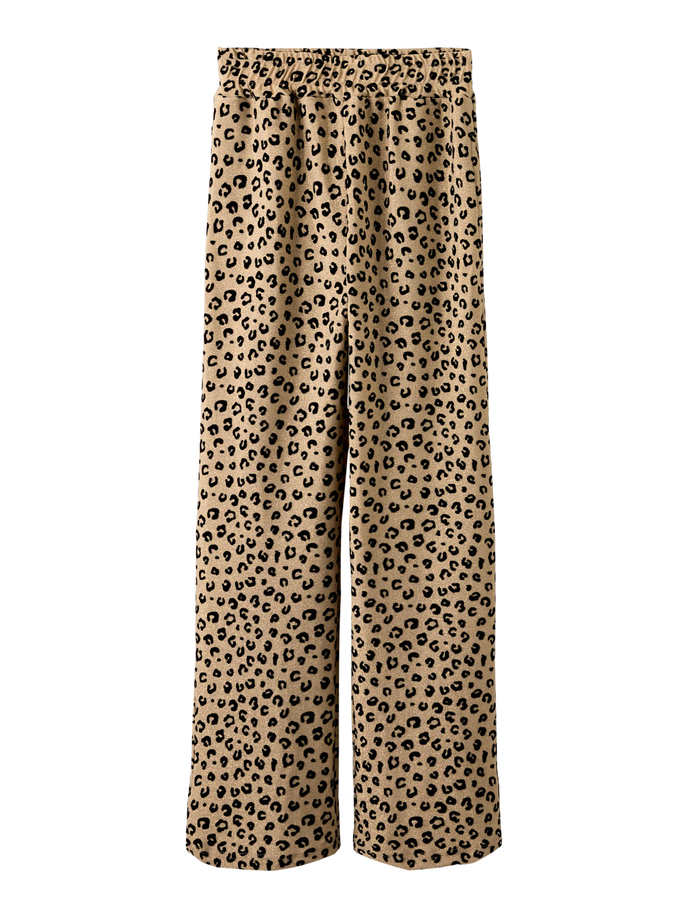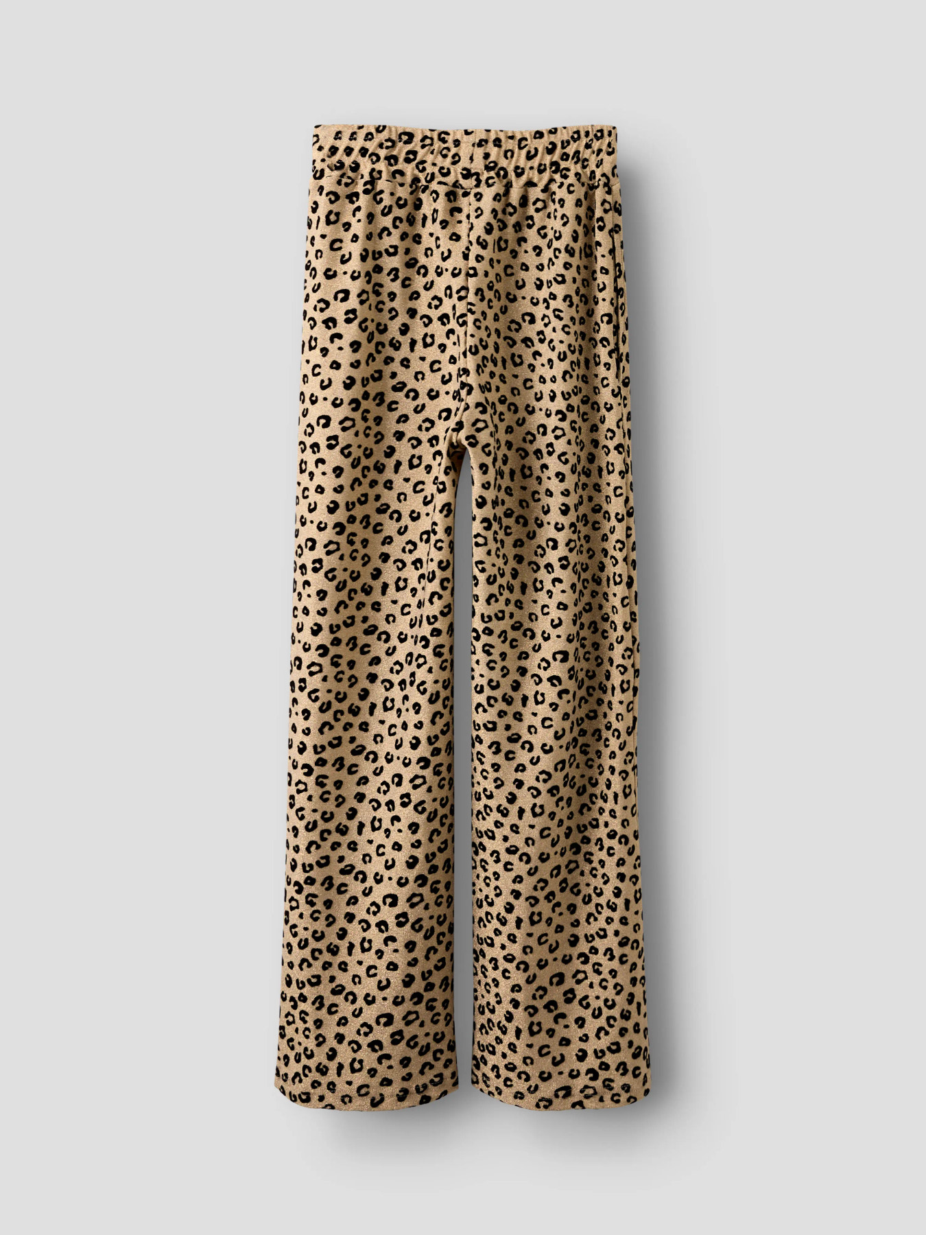 Super fine bukser fra Name it med brede ben. De er i super blød kvalitet og flot leo mønster med glimmer tråd i. De er med elastikkant i livet og størrelsen kan justeres indvendig.