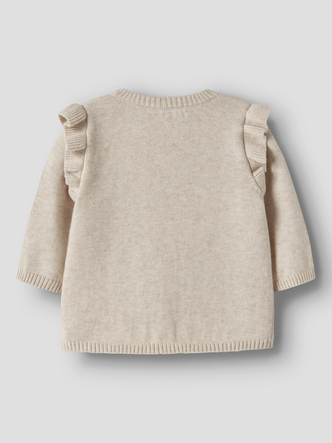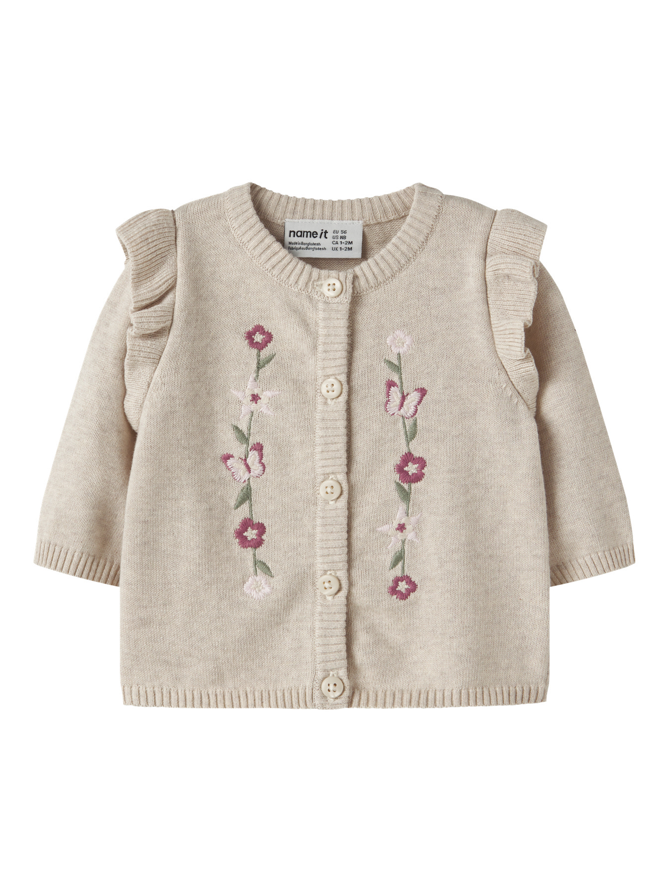 Fin cardigan i fladstrik med rund hals og lange ærmer. Cardiganen har knaplukning, ribkanter, flæsedetaljer og broderi, der giver et sødt og stilfuldt look. Med regular fit og blød strik er den perfekt til forår og sommer.