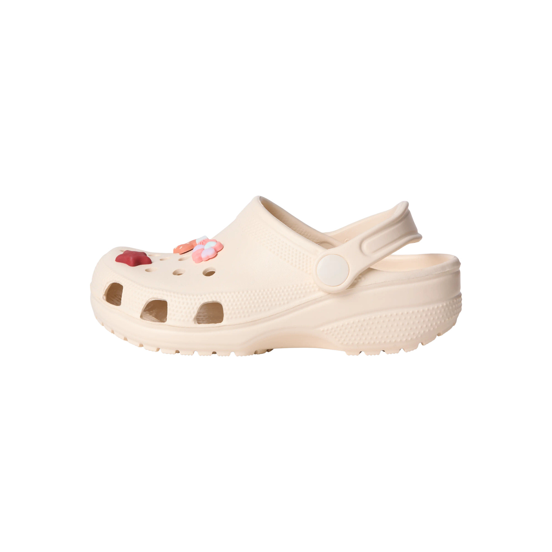 Disse lette og behagelige clogs har en praktisk rem, der kan flyttes frem og tilbage. De er dekoreret med små, aftagelige charms på oversiden, som giver et legende udtryk. Huller på overdelen sikrer god ventilation, og den bløde EVA-kvalitet gør dem ideelle til både inde- og udebrug.