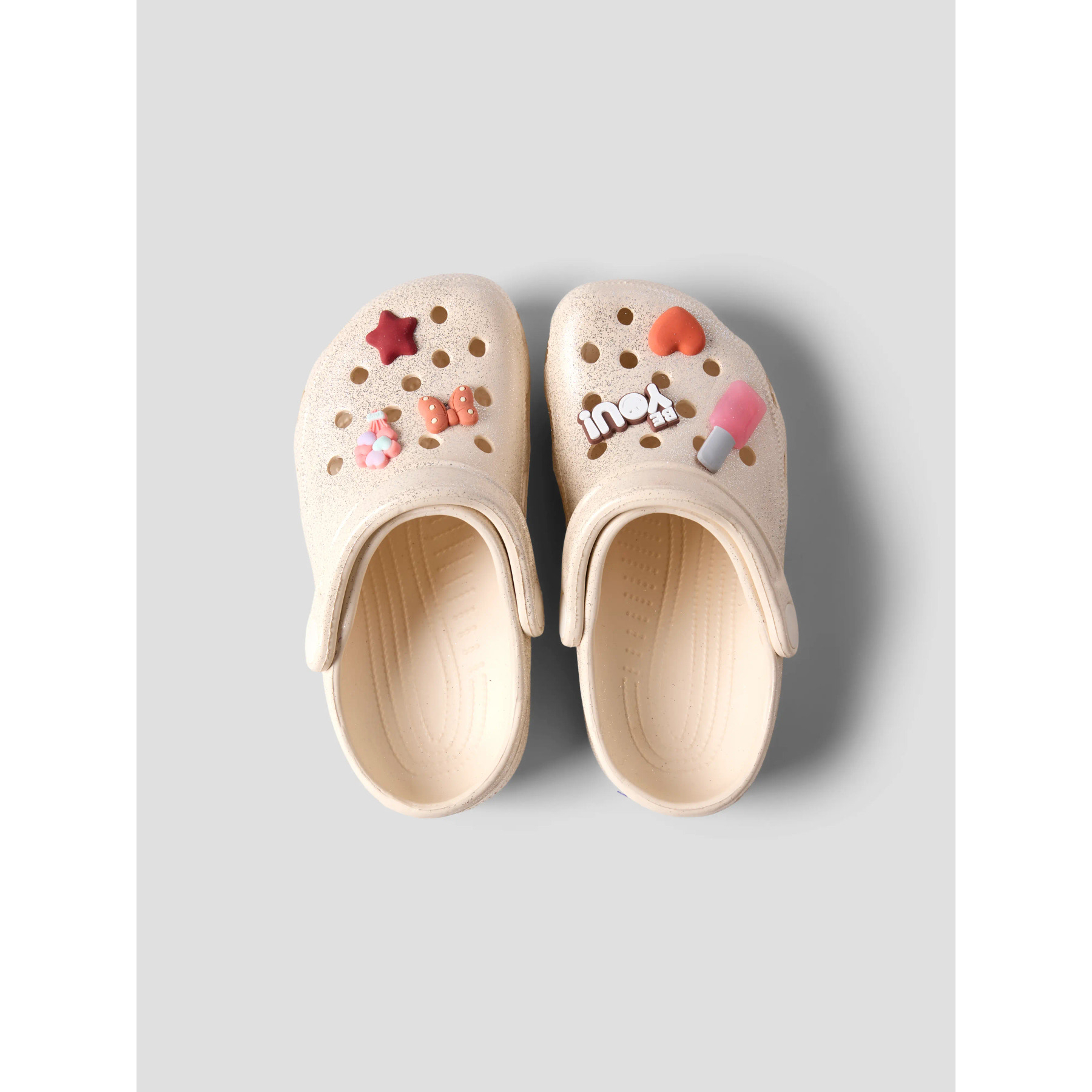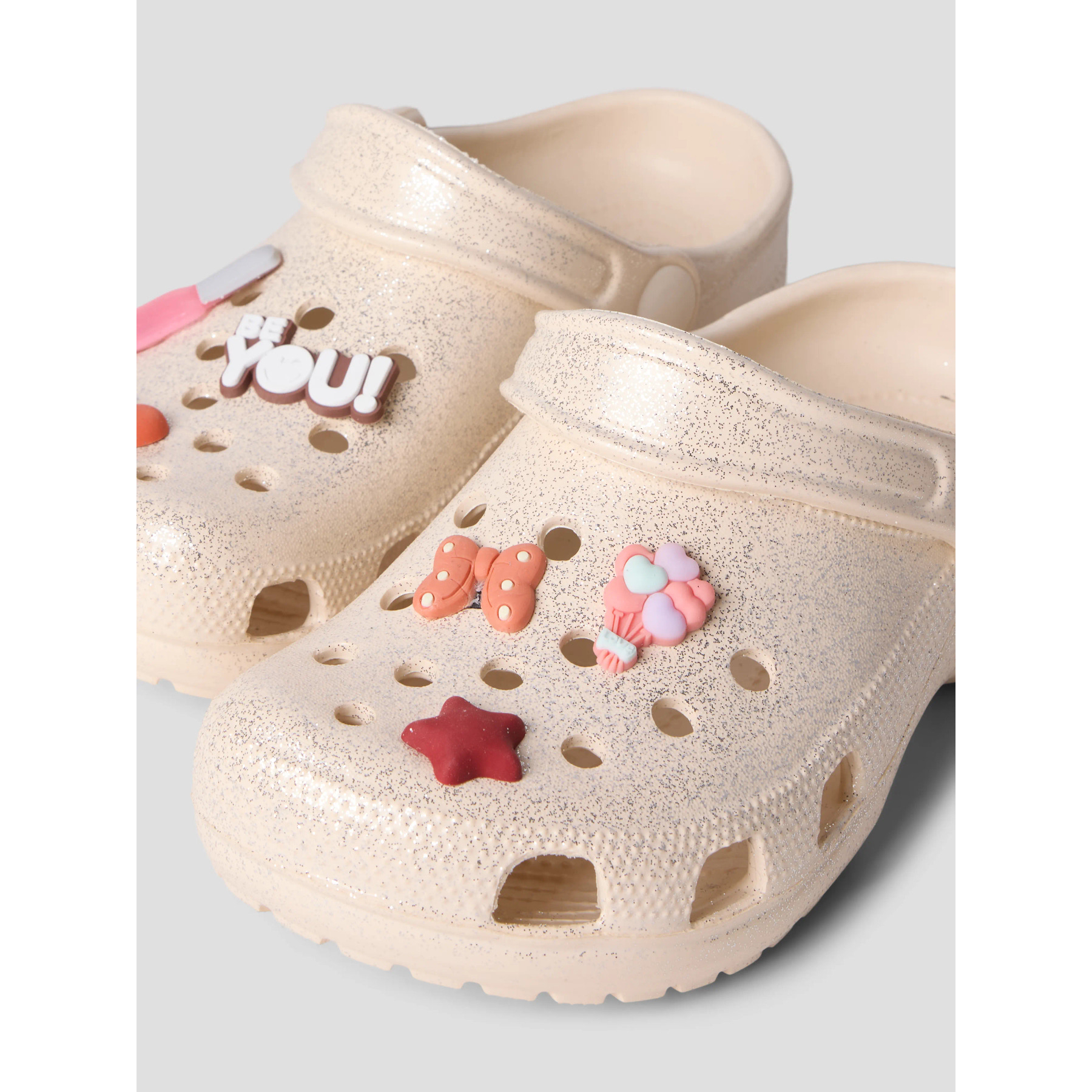 Disse glittery clogs har en justerbar hælrem og fine, aftagelige charms på fronten, der giver et legende udtryk. De er ideelle som behageligt fodtøj både inde og ude og er fremstillet i letvægts EVA-materiale for optimal komfort.
