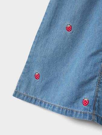 Mega sød denim spencer kjole fra name it. Den er i lækker denim kvalitet og med jordbær over det hele. Den har den stropper der kan knappes foran.