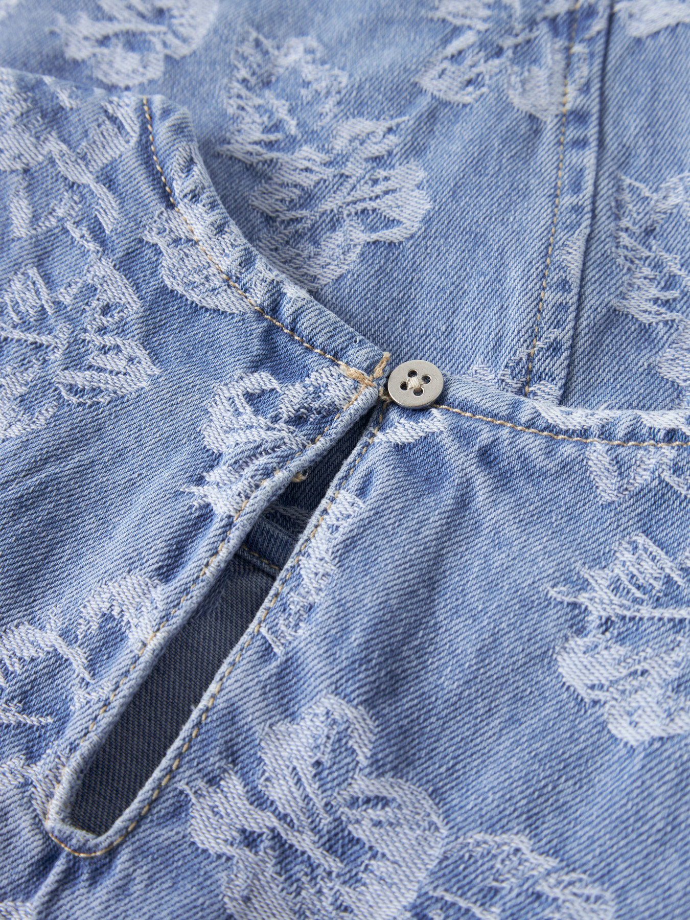 Cool top i jacquard med elegant vævet mønster og et let vasket denim-look. Den har U-hals, er ærmeløs og lukkes med knap og loop. Jacquard-detaljen giver et stilfuldt udtryk, mens regular fit sikrer god komfort til både hverdag og særlige lejligheder.