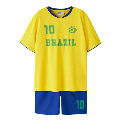 Fodboldtrøje og shorts-sæt med nummer 10 og 'BRAZIL' tryk foran på trøjen samt et fodboldlogo. Sættet har en rund hals og korte ærmer med kontrastfarvede kanter. Fremstillet i let og strækbart jerseystof af genanvendt polyester, der føles blødt mod huden og giver god bevægelsesfrihed.