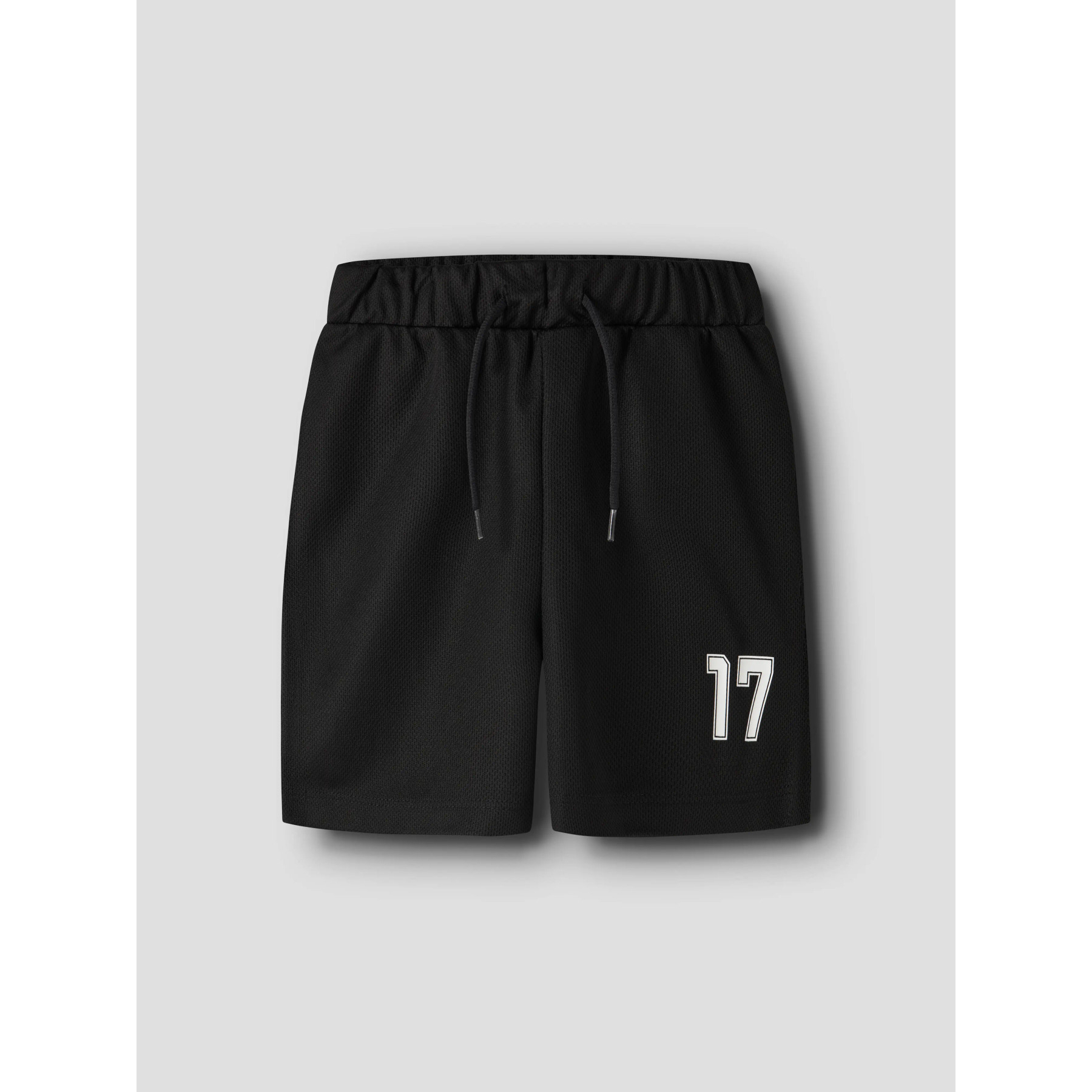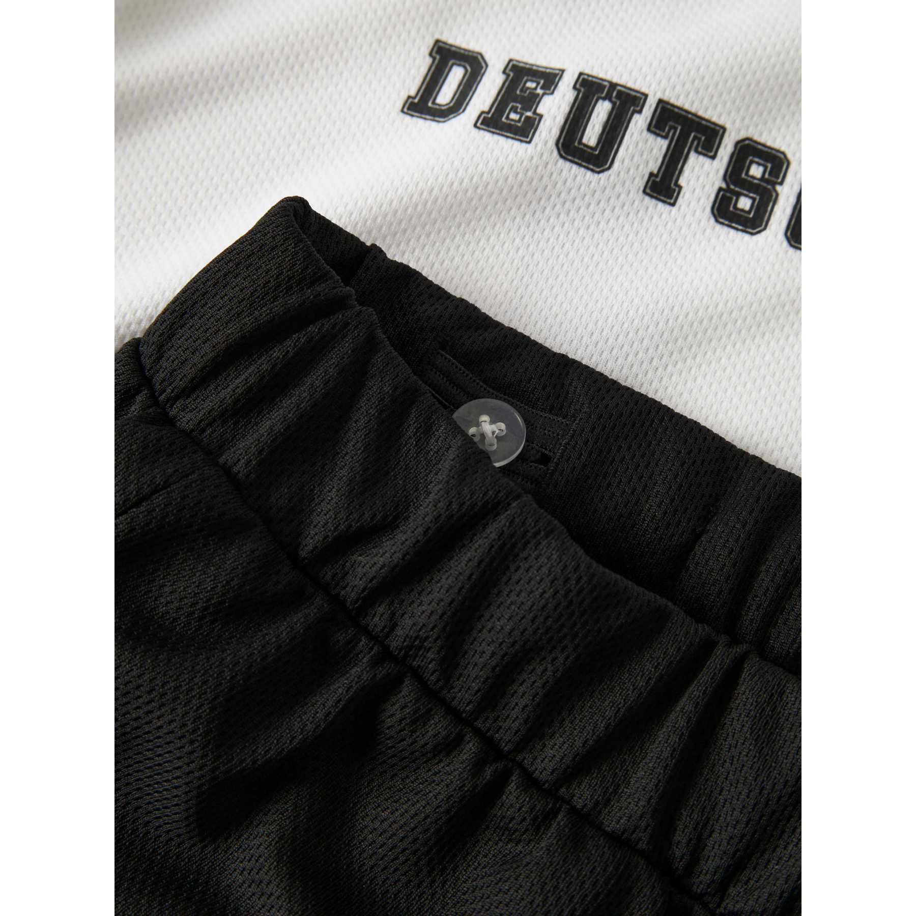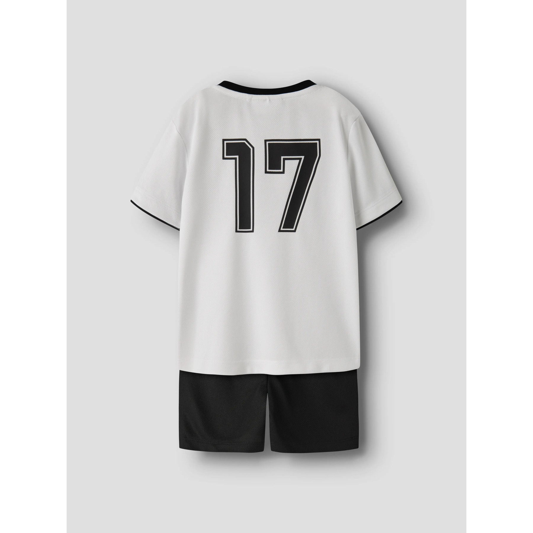 Fodboldinspireret sæt bestående af en hvid T-shirt med sort ribkant i halsen og ved ærmerne samt matchende sorte shorts. T-shirten har et stort sort '17'-tal og 'DEUTSCHLAND'-tekst på fronten sammen med et fodboldmotiv, mens shortsene prydes af et hvidt '17'-tal på det ene ben. Sættet er fremstillet i et let og strækbart jerseymateriale, der sikrer god bevægelsesfrihed og en blød fornemmelse, og indeholder genanvendt polyester.