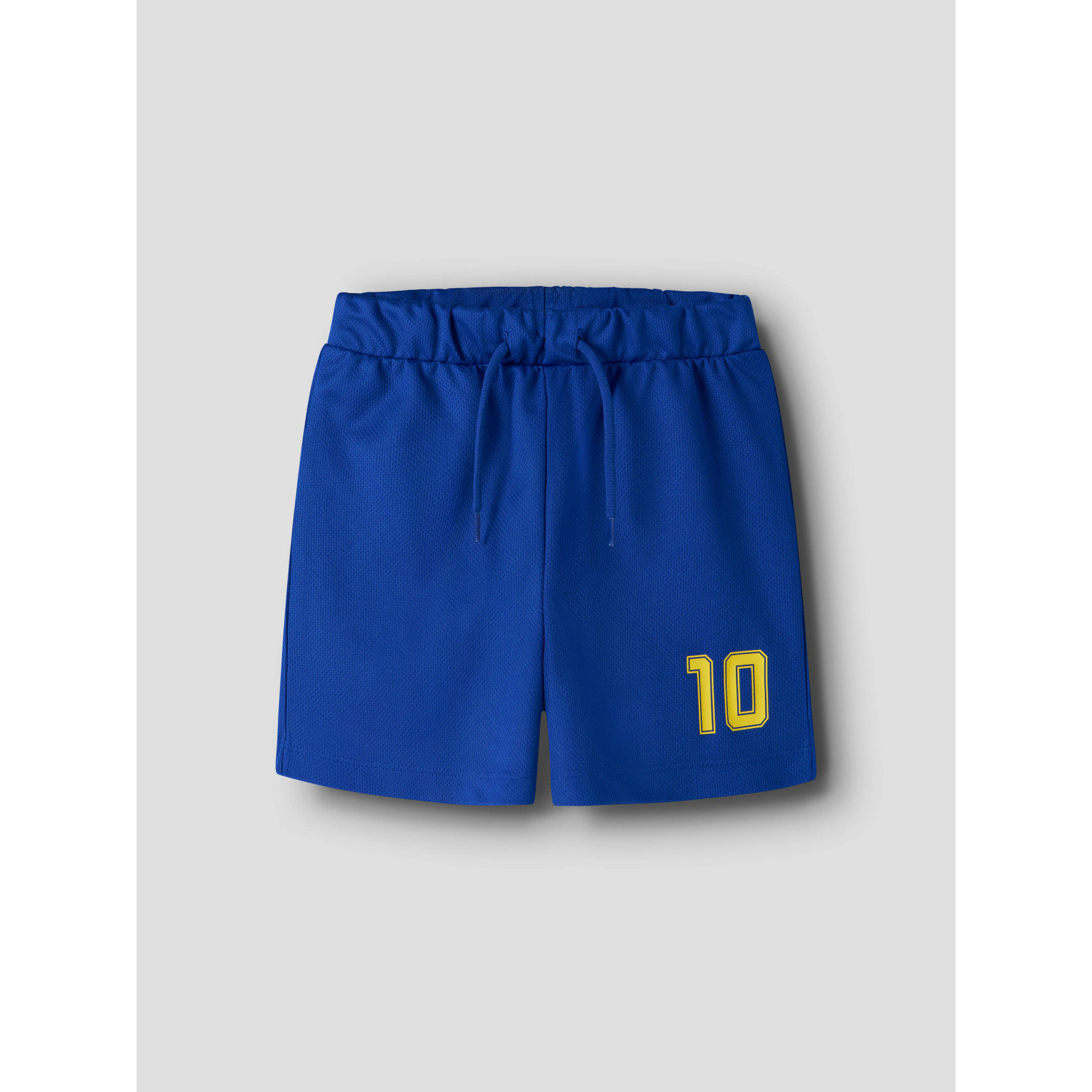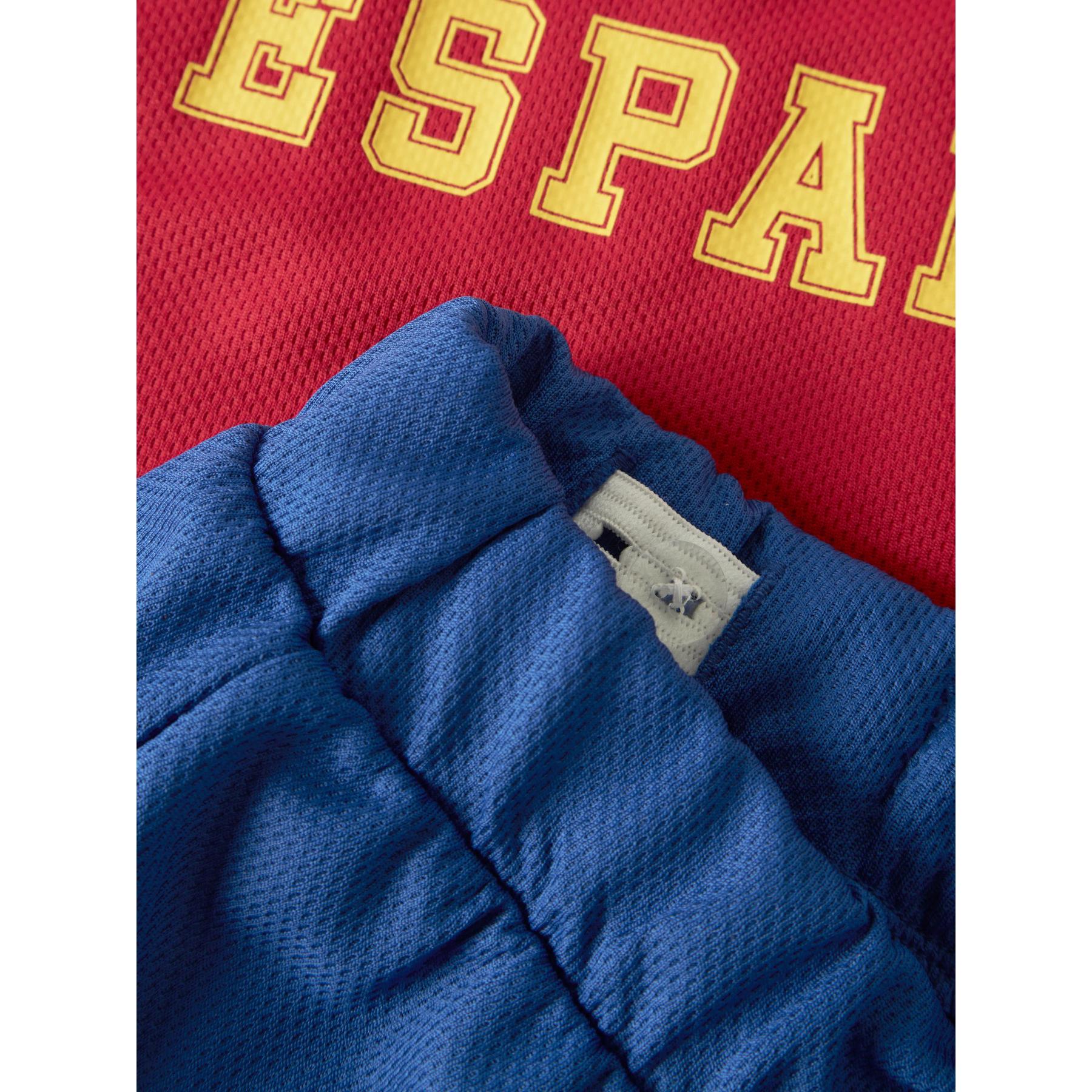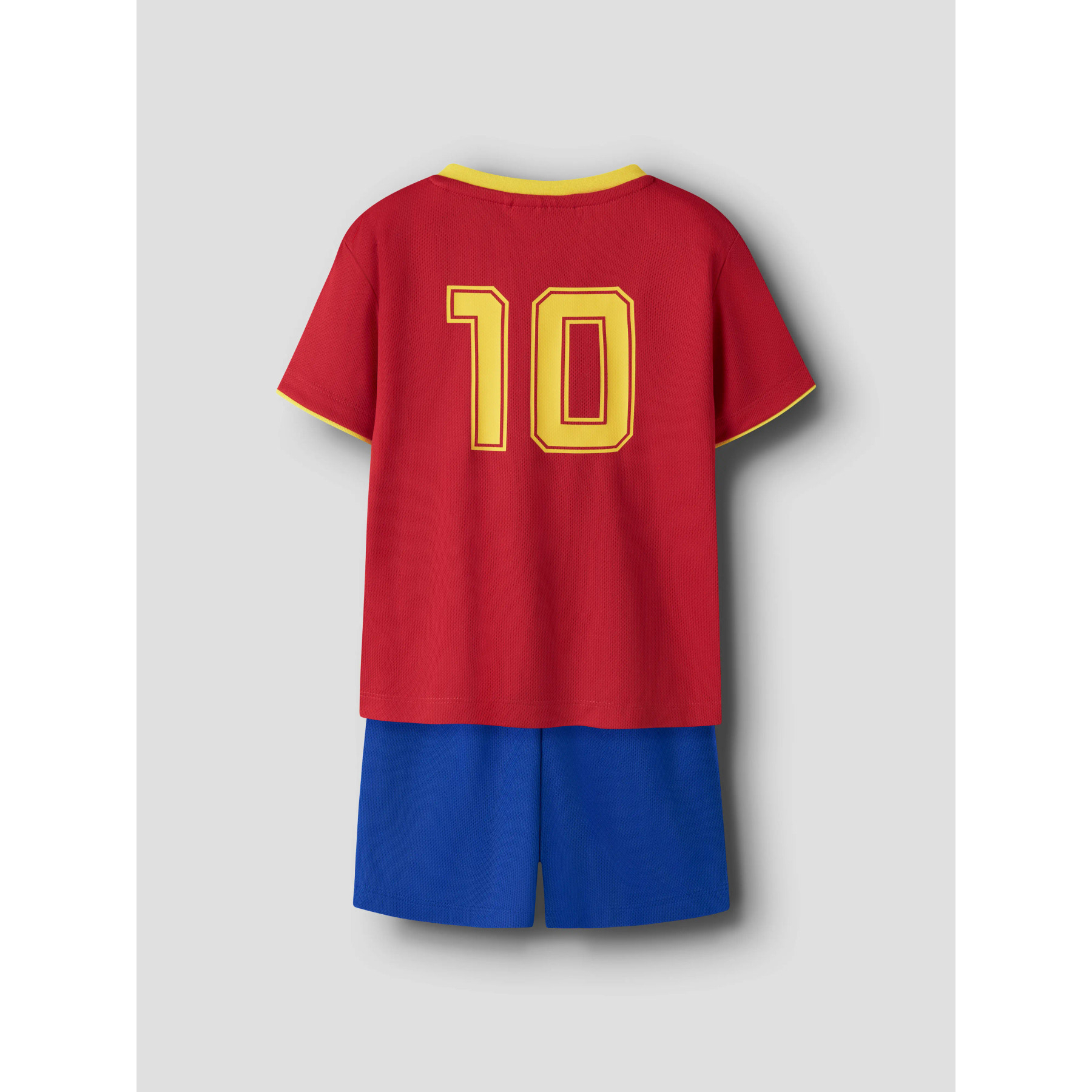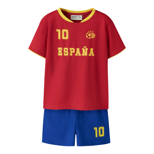 Fodboldspillesæt bestående af en kortærmet trøje og matchende shorts. Trøjen har gule kanter ved hals og ærmer samt et print med '10 ESPAÑA' og et fodboldmotiv på fronten. De tilhørende shorts er designet med et '10'-print på benet. Sættet er fremstillet i et let og strækbart jerseymateriale af genanvendt polyester, som giver en blød fornemmelse og god bevægelsesfrihed.
