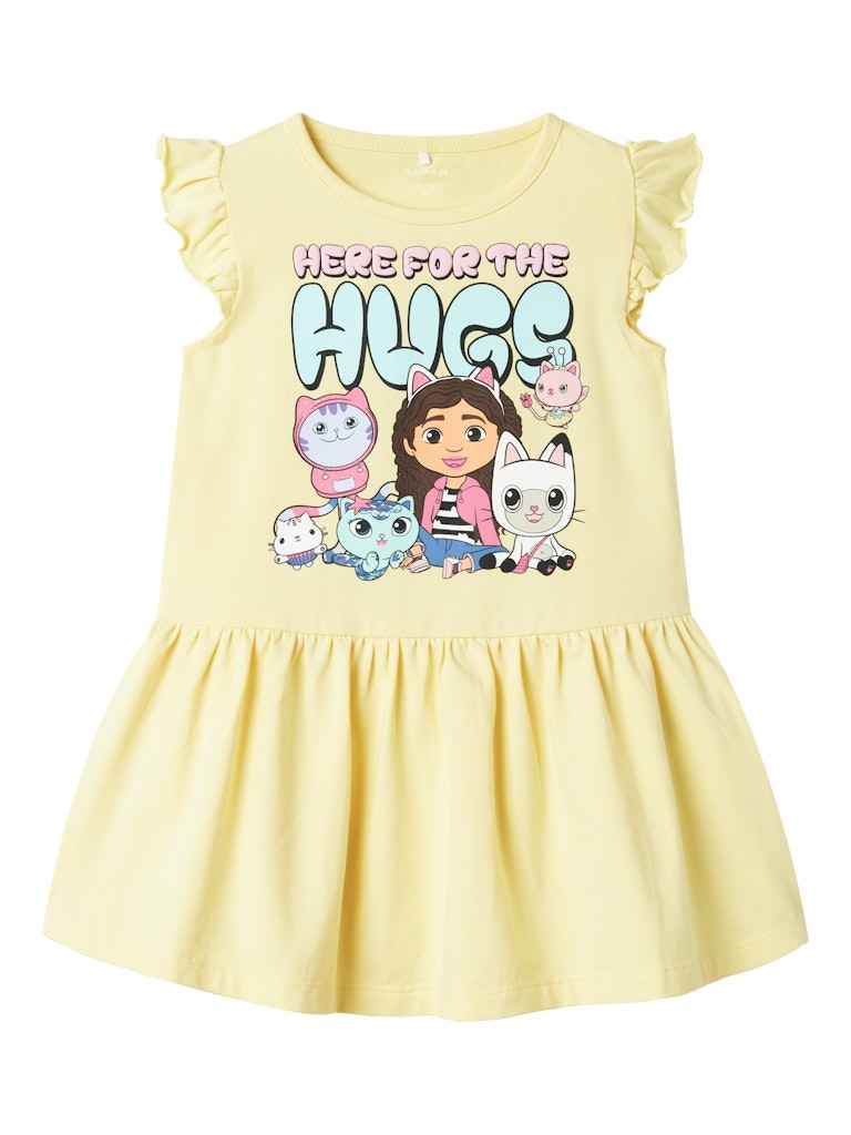 De sødeste kjole fra Name it med Gabby cat og tekstprint på maven. Små flæseærmer i og et yndigt snit.