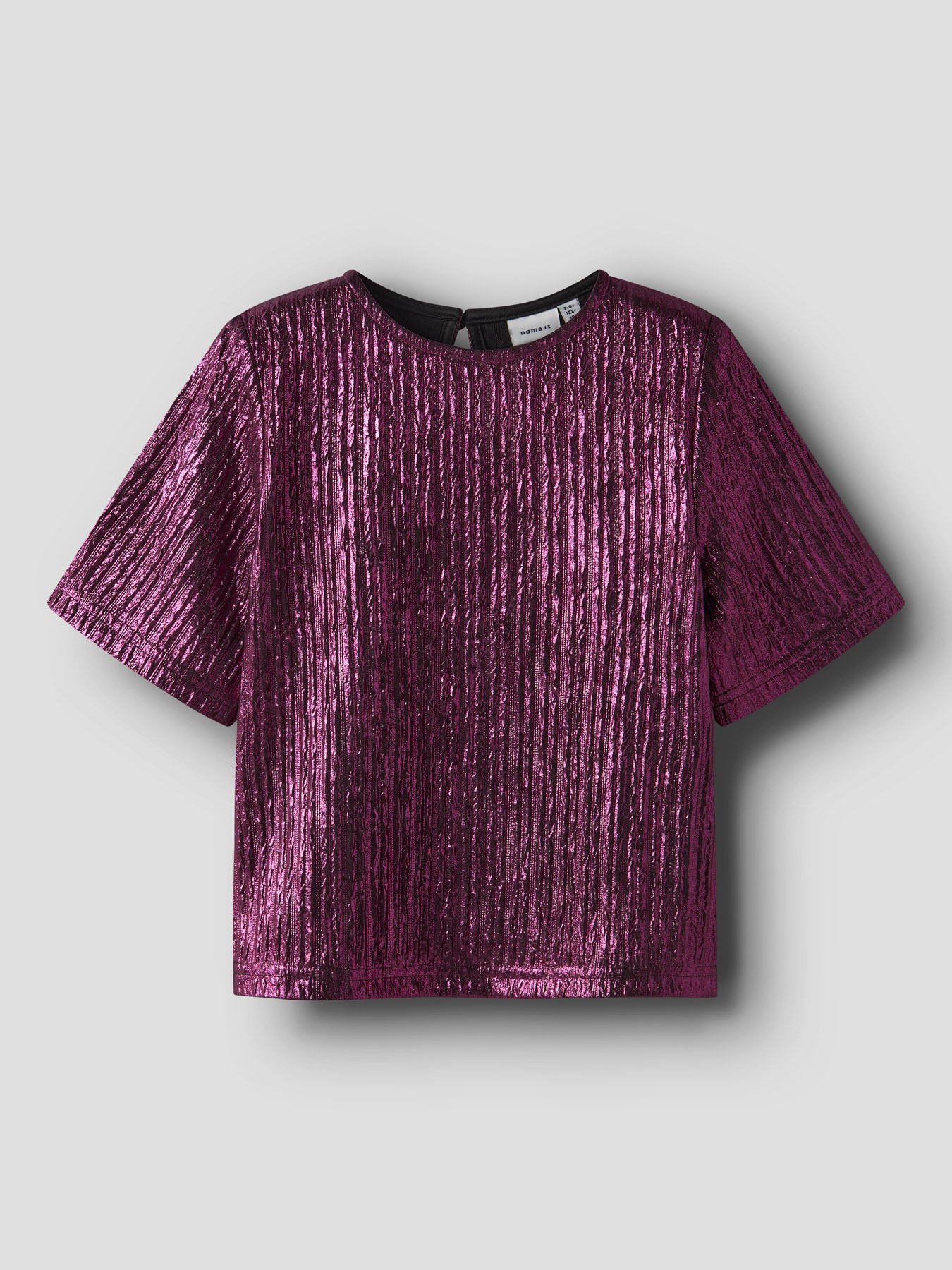 Smuk top fra Name It. Toppen har en let tekstureret overflade og et skinnende look. Kvaliteten er meget blød og lækker. Den har rund hals og en lille knaplukning i nakken.