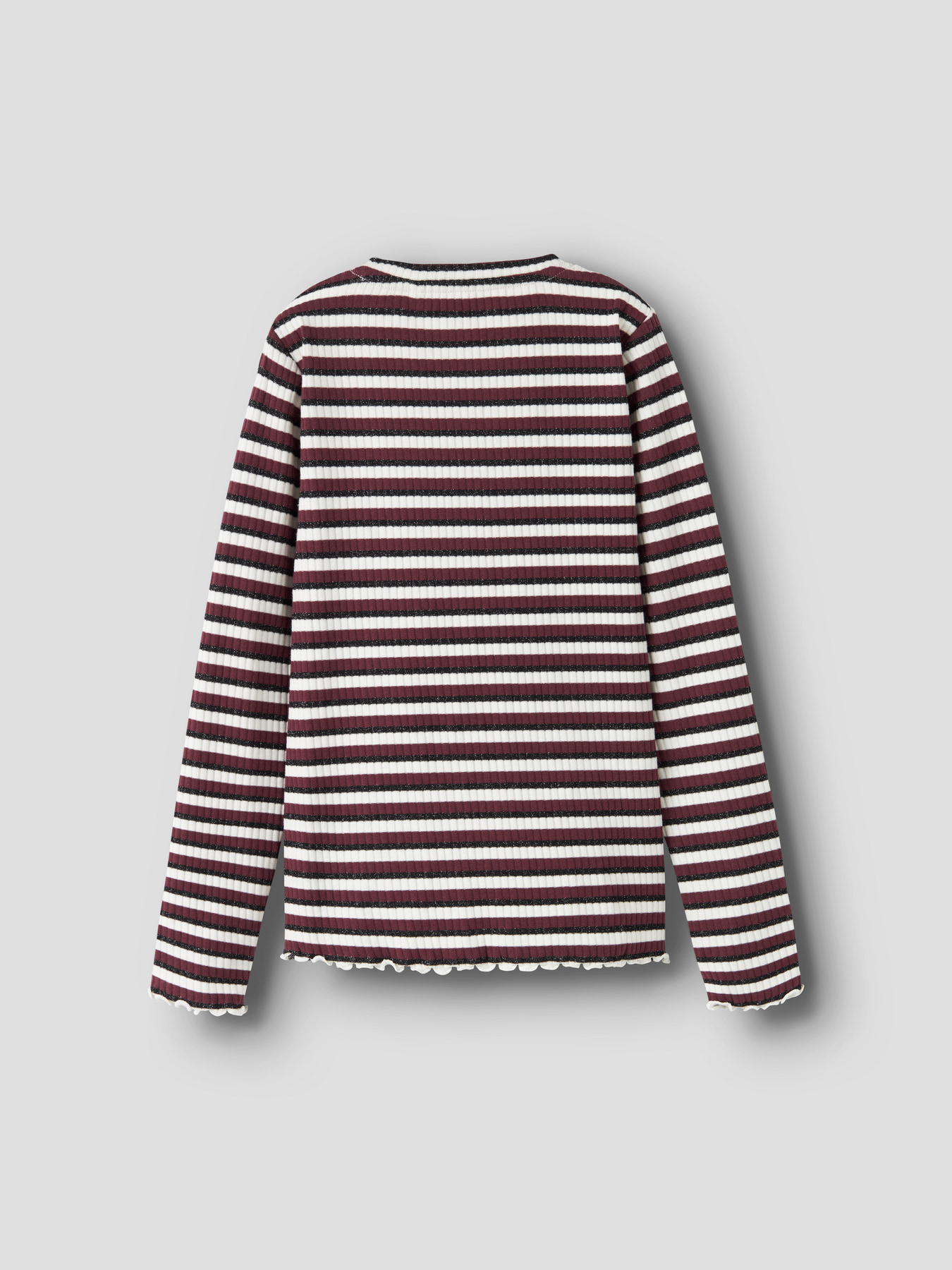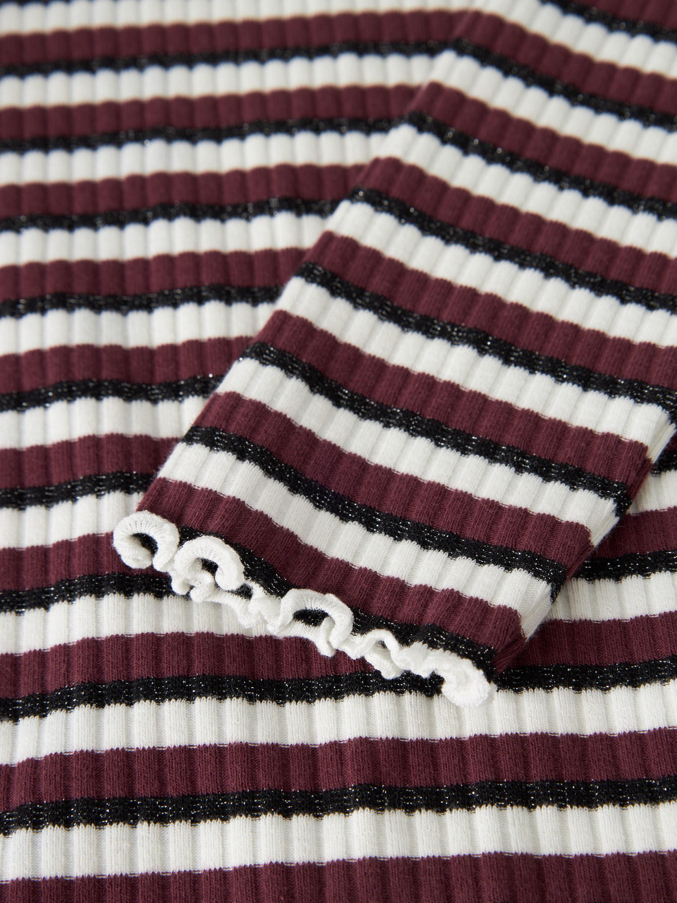 Mega lækker blød og strechy rib bluse med lange ærmer fra Name it. Blusen er med striber i fine farver med glimmer og små bølgekanter ved ærmerne og maven.