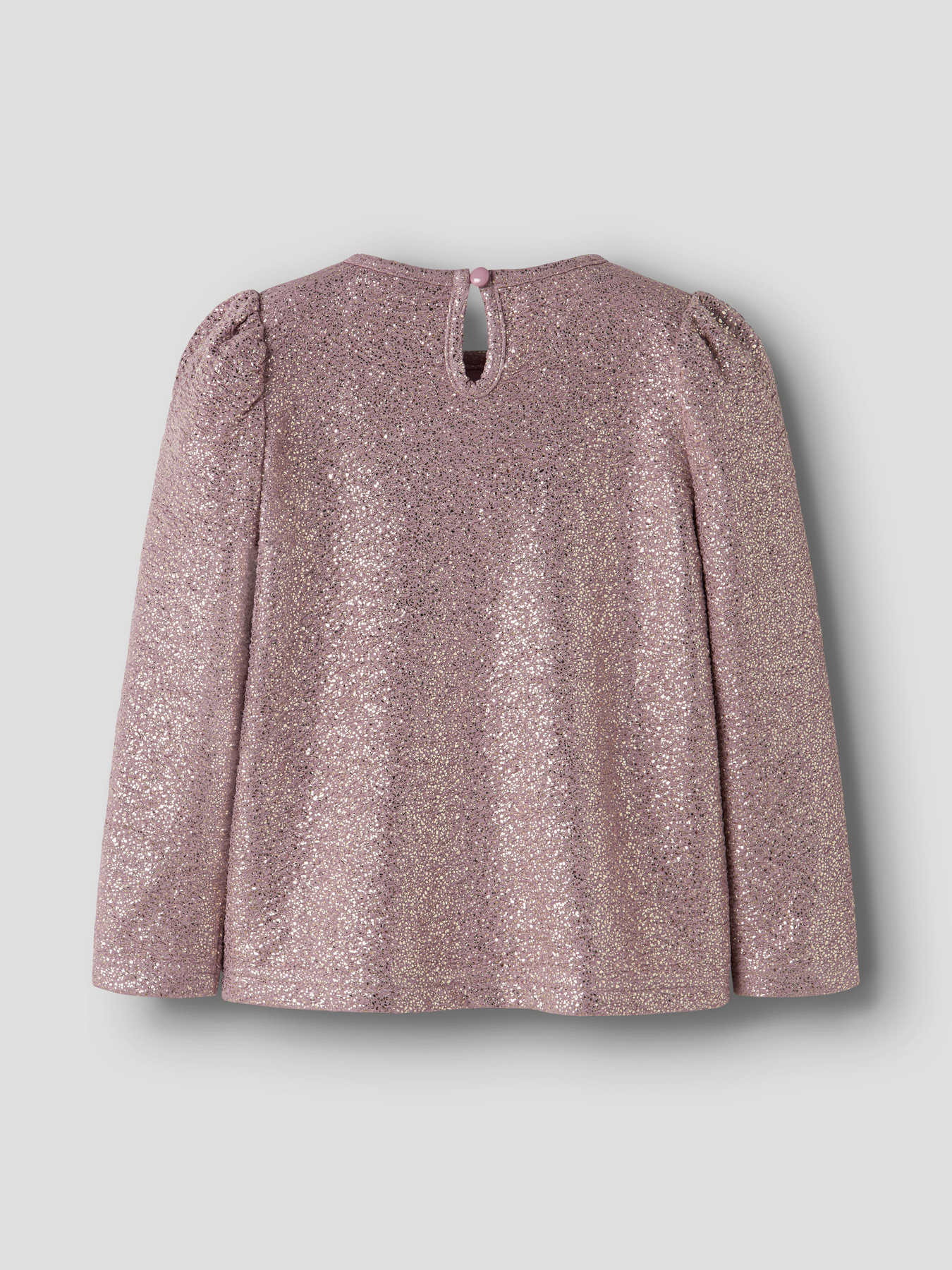Den smukkeste glimmer bluse fra name it. Blusen er i en smuk rosa farve med guld glimmer, et let puf ved skulderen.