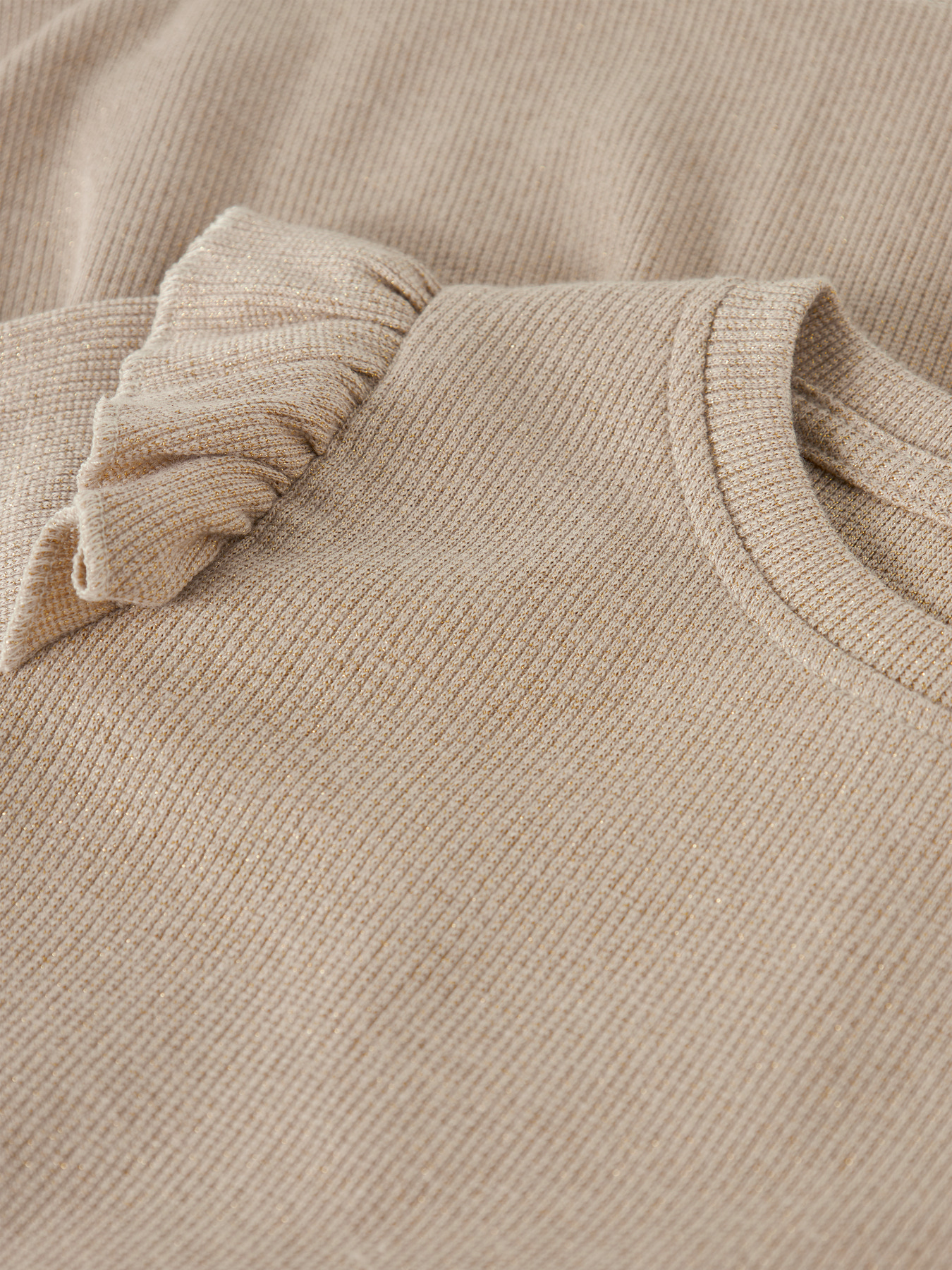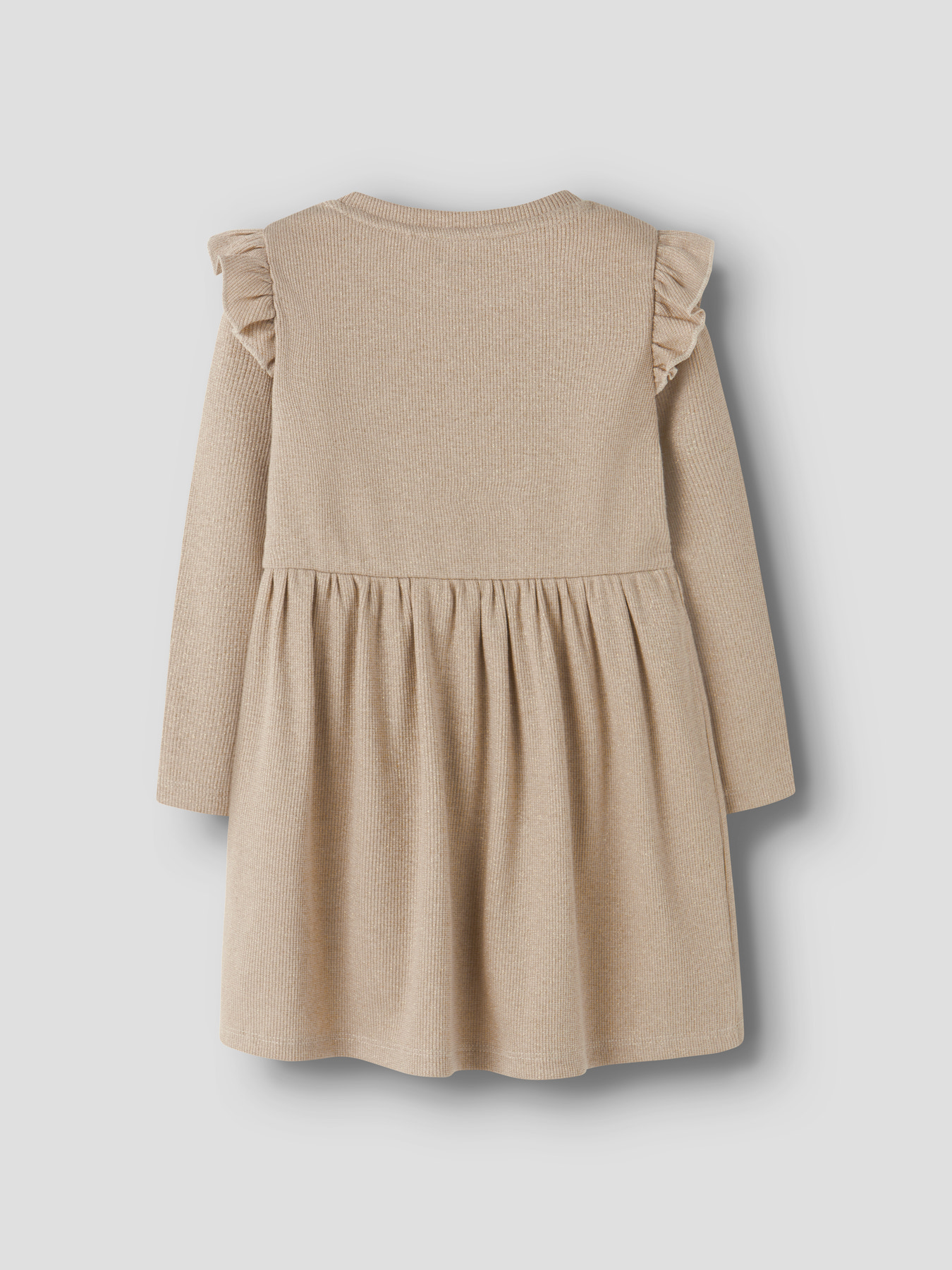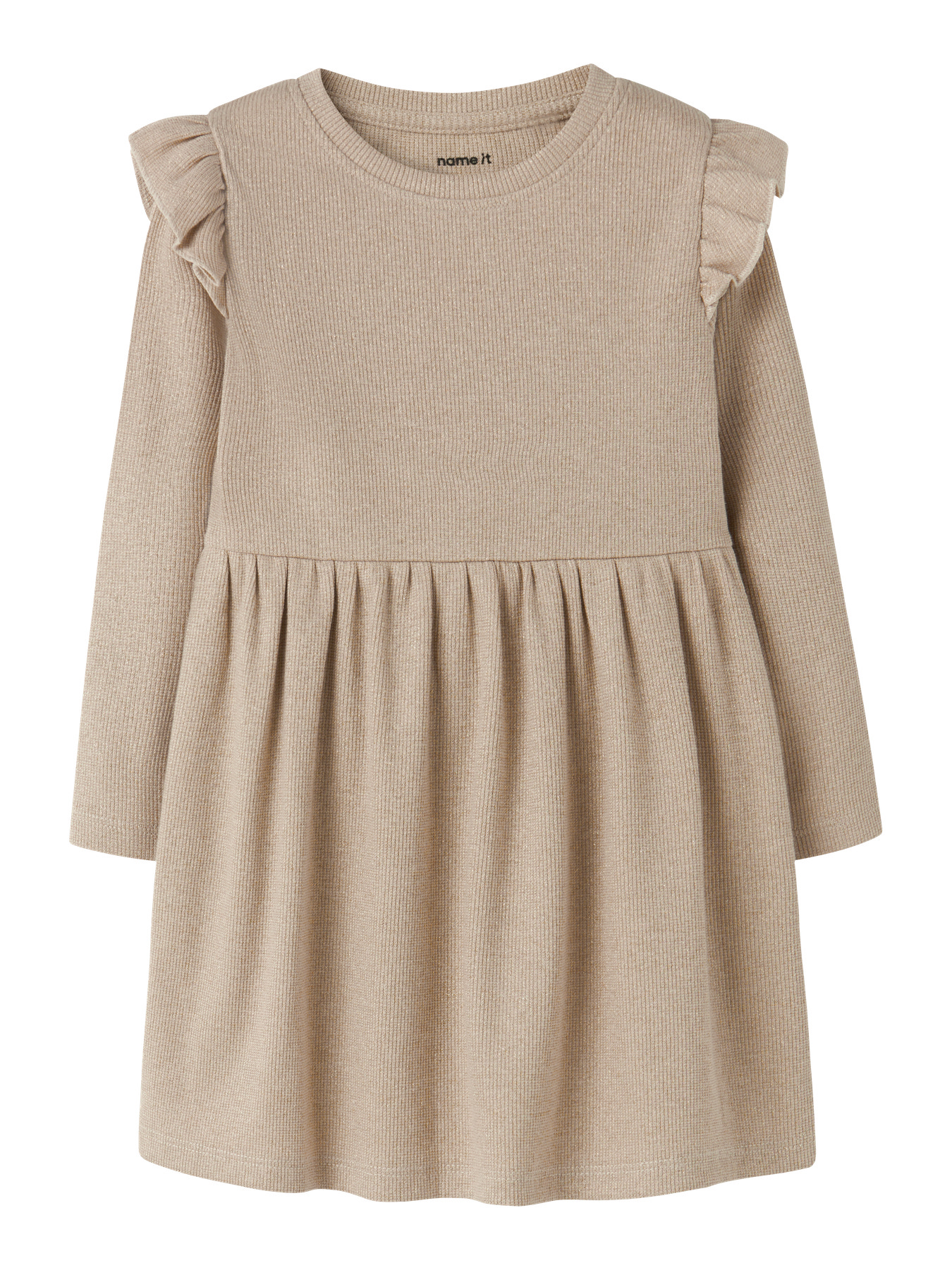 Super flot rib kjole fra Name It med glimmer detaljer i stoffet. Flæser ved skuldrene, rund hals og lange ærmer. Længde til lige omkring knæene.