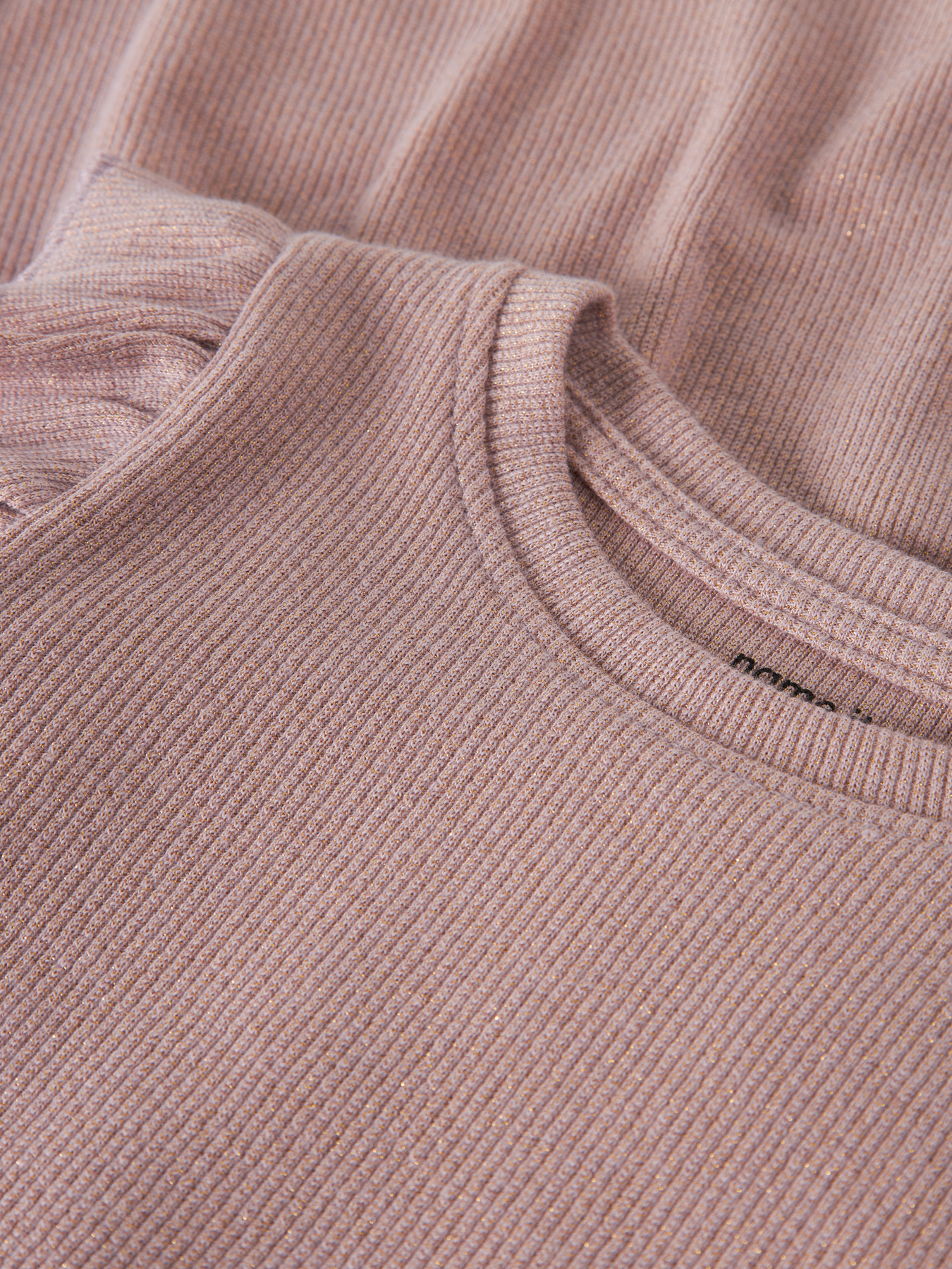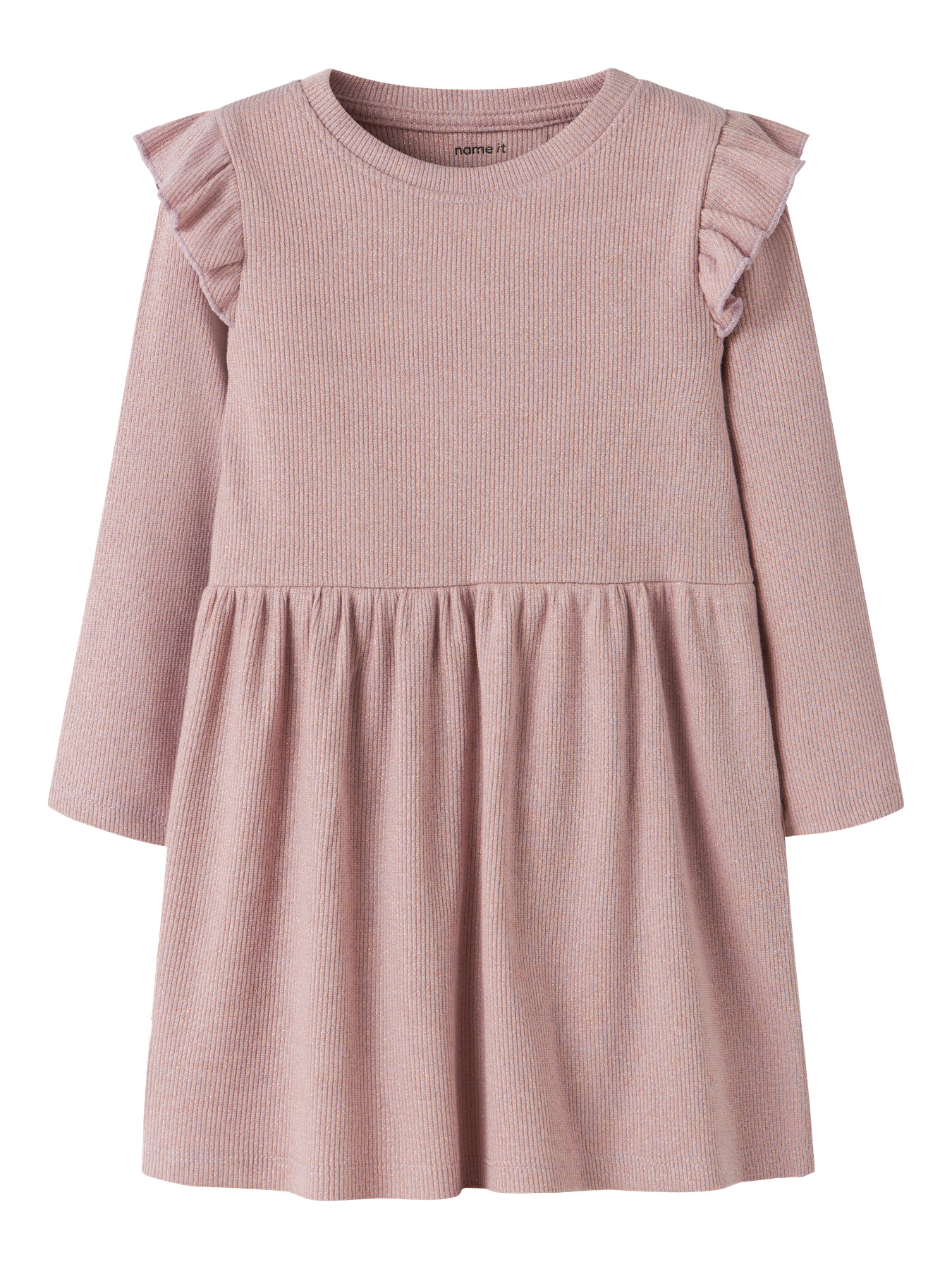 Super flot rib kjole fra Name It med glimmer detaljer i stoffet. Flæser ved skuldrene, rund hals og lange ærmer. Længde til lige omkring knæene.