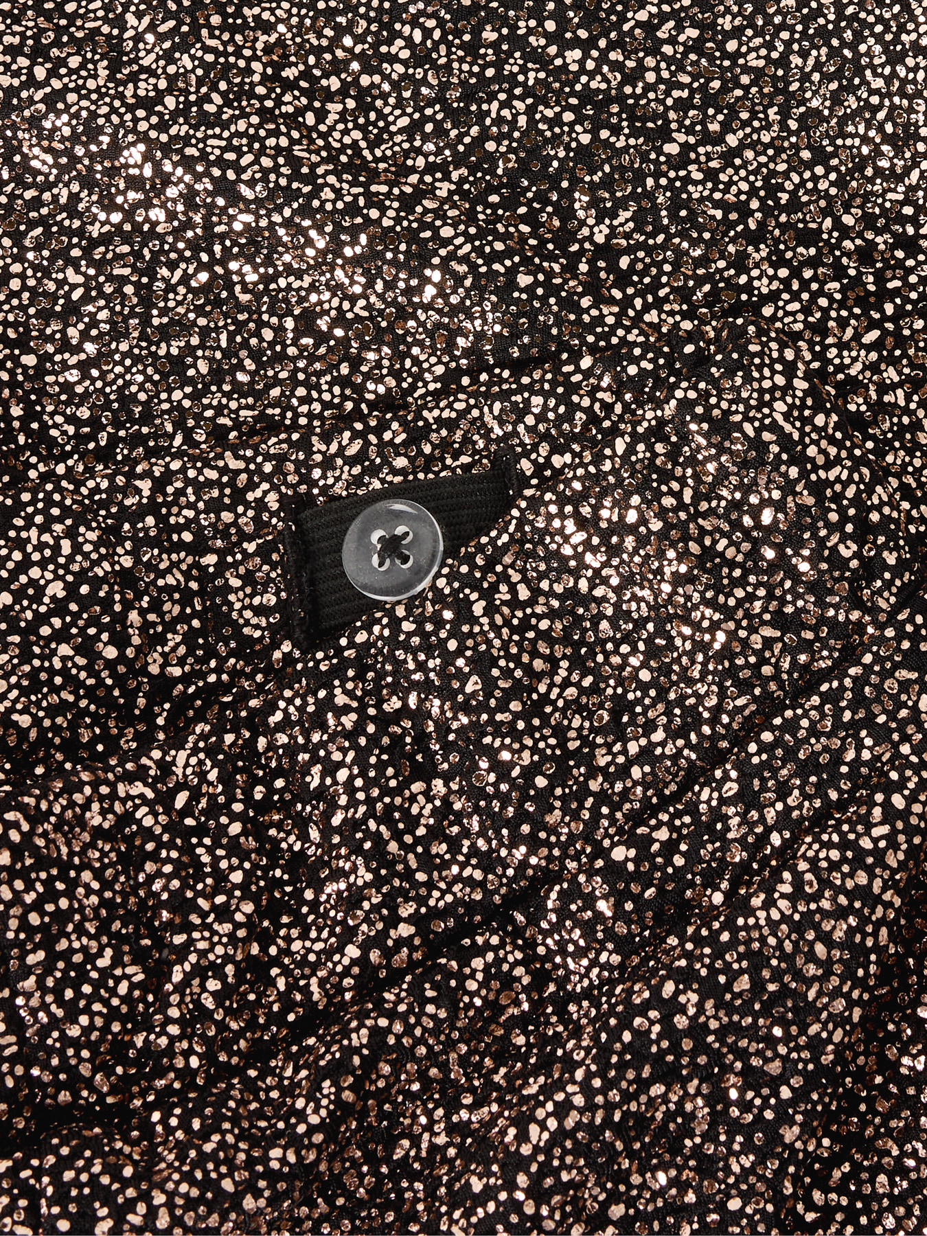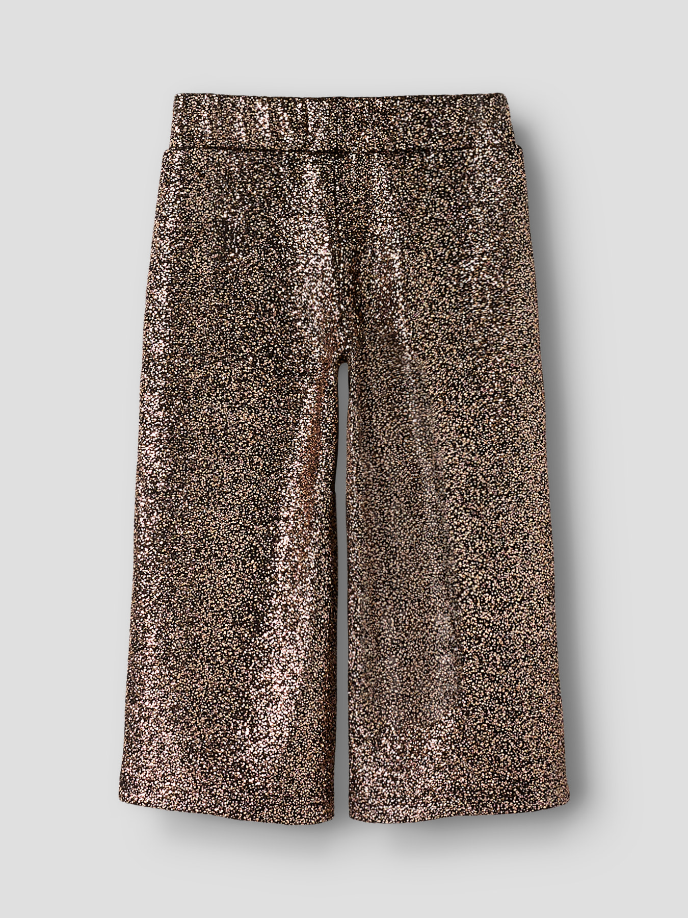 Smukkeste glimmer bukser fra Name it. De er med brede ben og elastikkant i livet samt størrelsen kan justeres indvendig i livet. De er med sort baggrund og fyldt med flot skinnende glimmer.