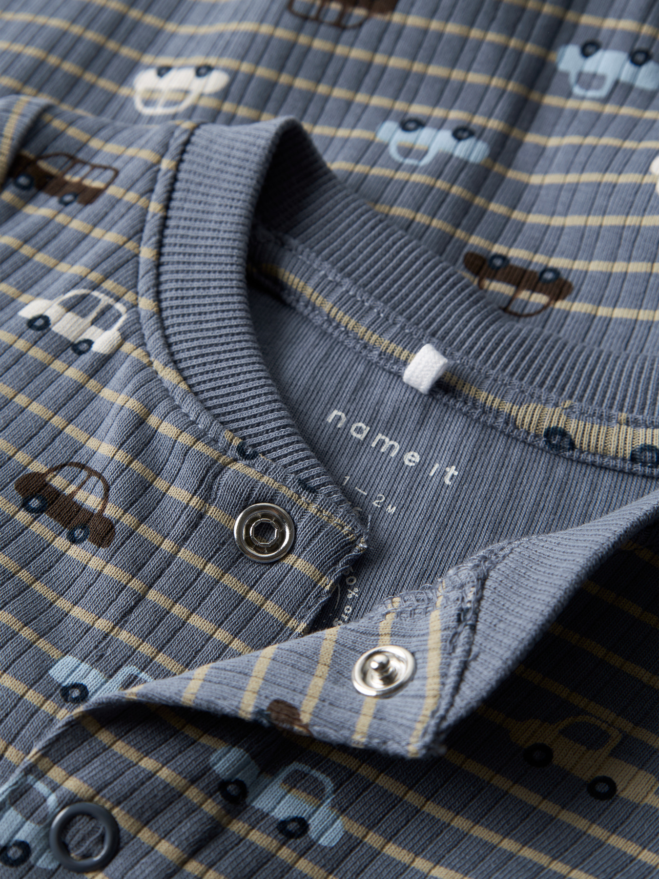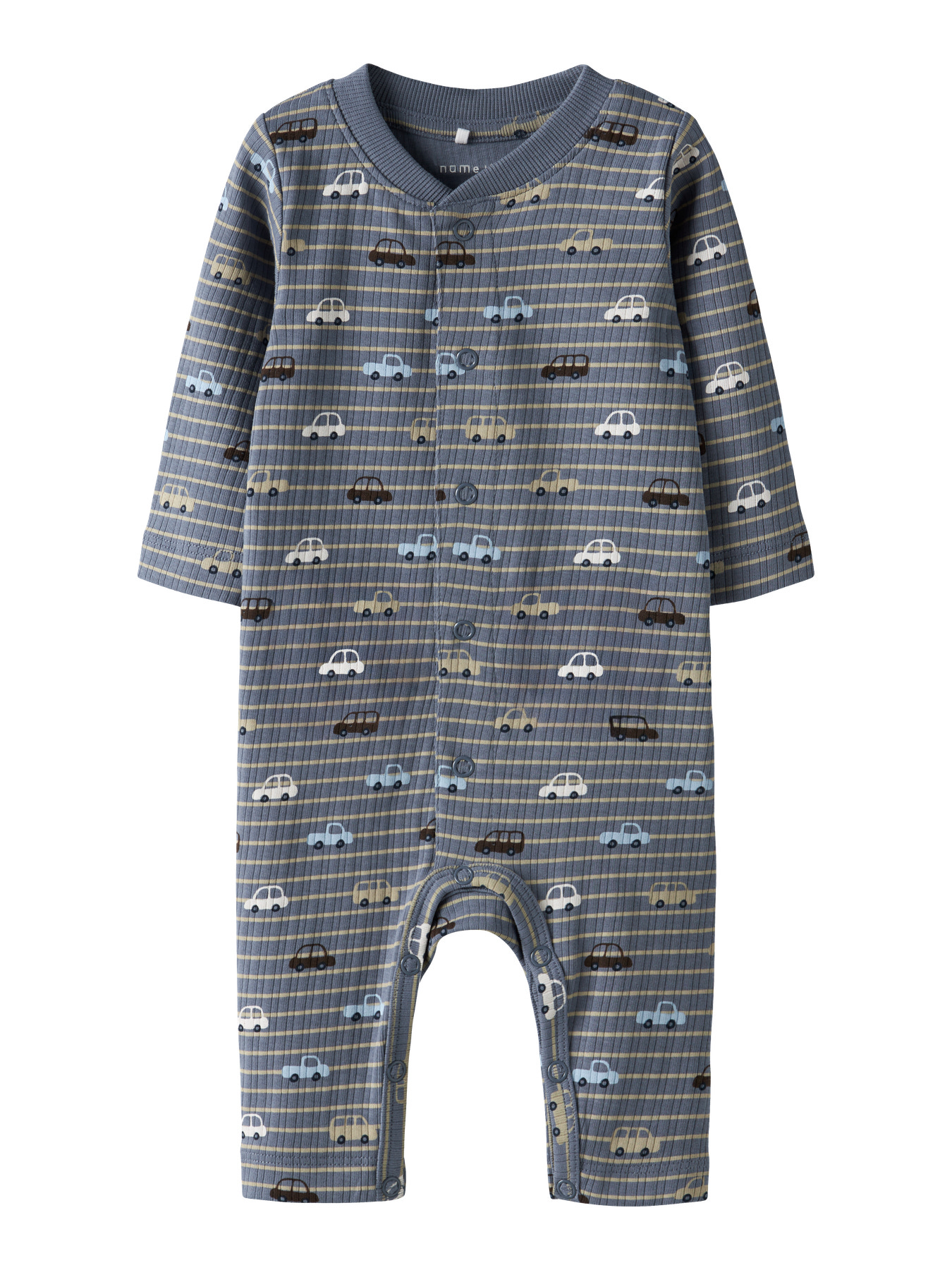 Mega sød heldragt fra name it. Den er i en skøn farve med biler på. Dragten har knapper hele vejen ned.