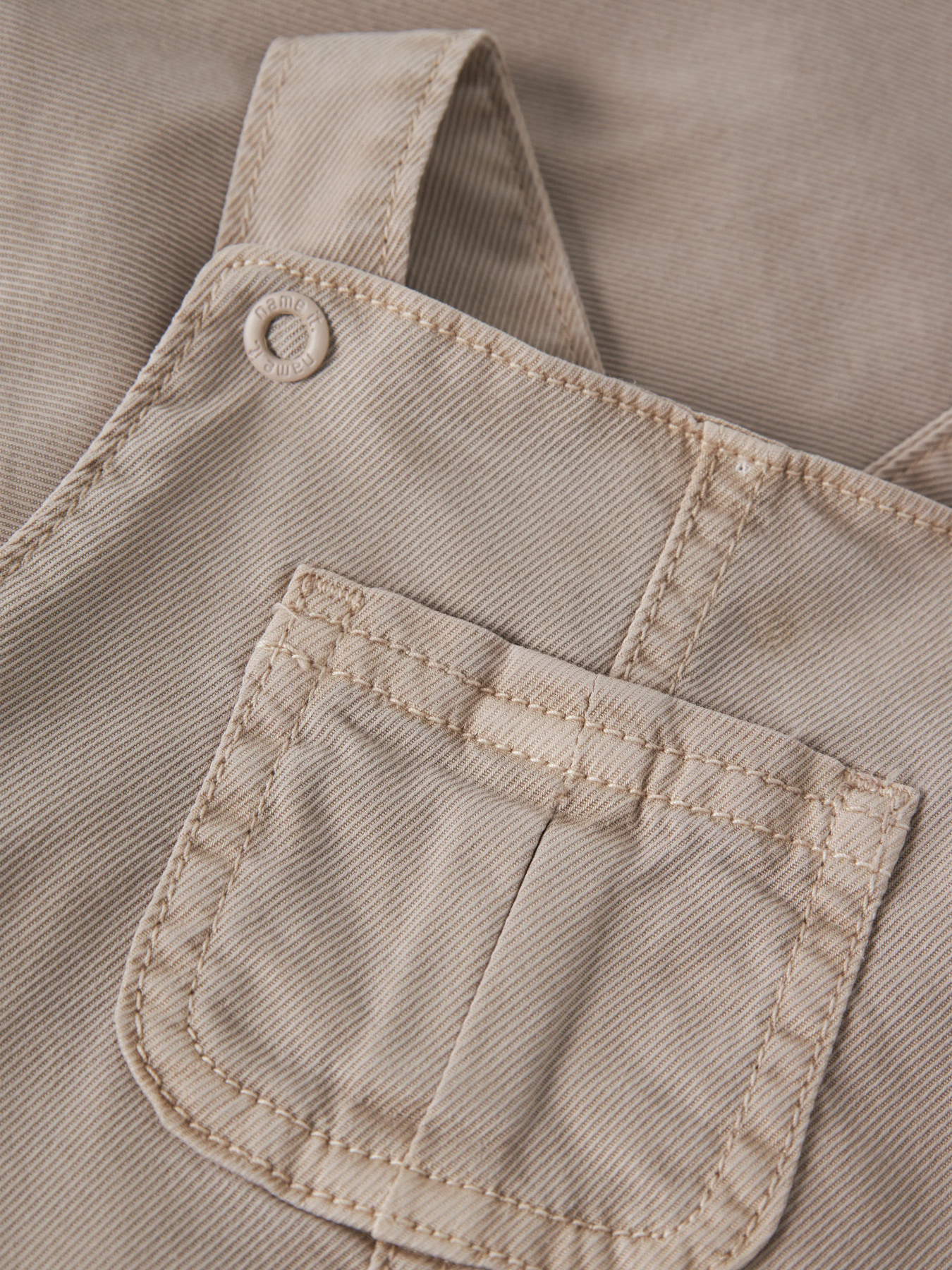 Babyjumpsuit i slidstærk twill med klassisk diagonal struktur og et stilrent look. Den har justerbare stropper, brystlomme og frontlommer samt elastiske kanter ved benene for en behagelig pasform. Barrel fit giver god komfort og bevægelsesfrihed til de mindste.