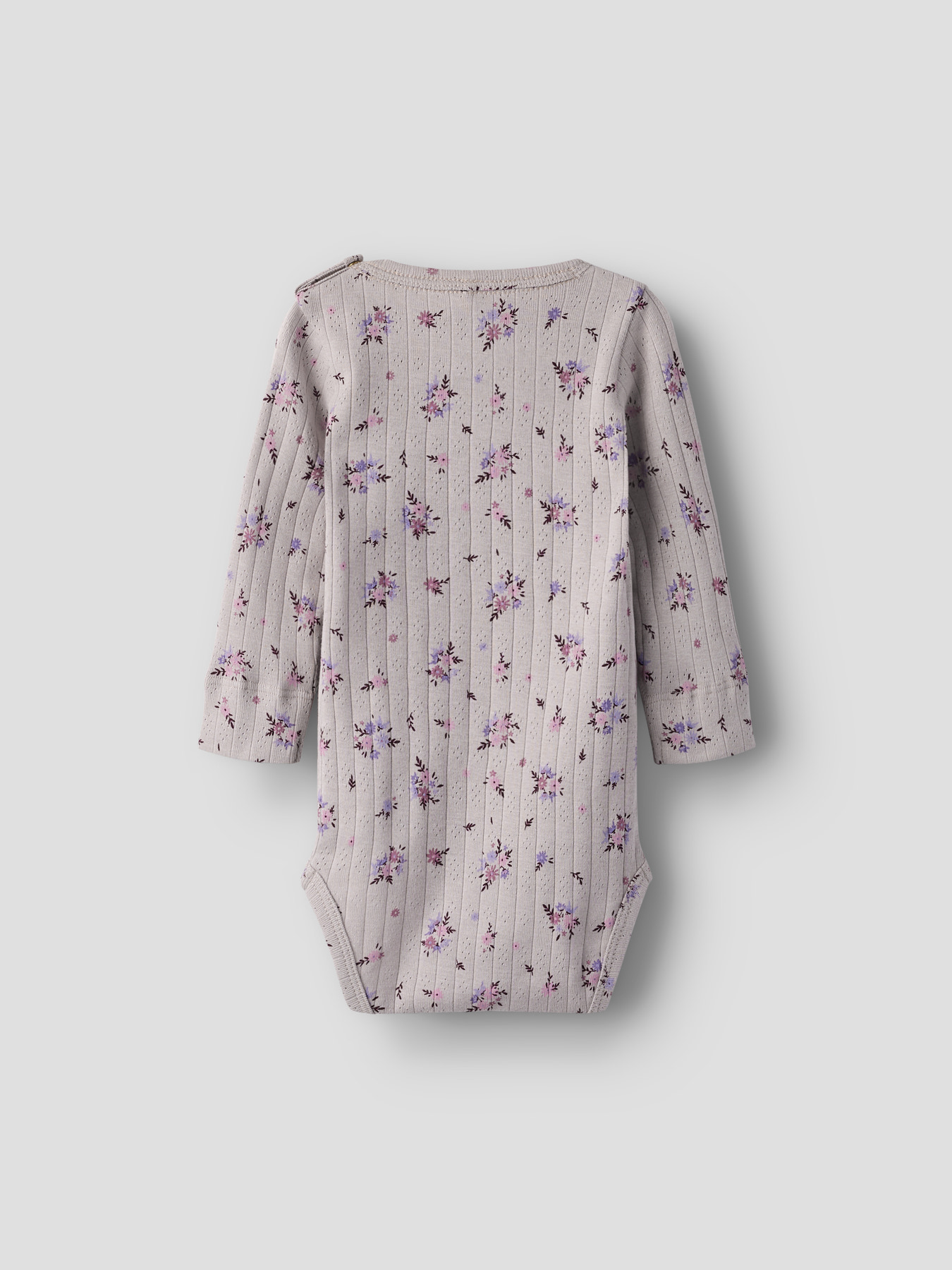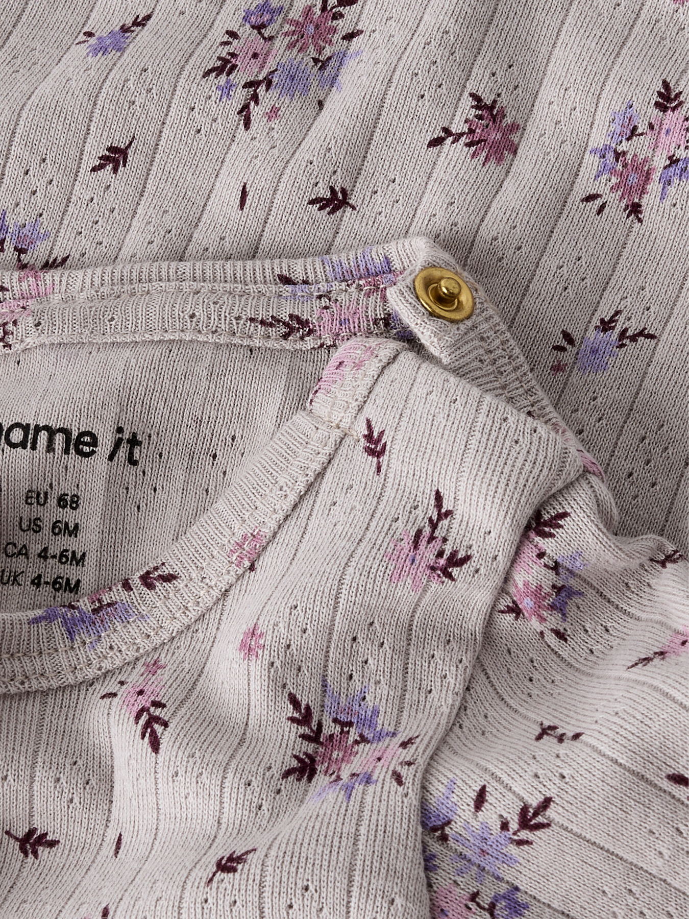 Fineste body fra Name it i lækker ribbet hulmønster kvalitet. Den er i de fineste farver og med skønt blomster print. Den lukkes med trykknapper i skulderen og ved bleen.