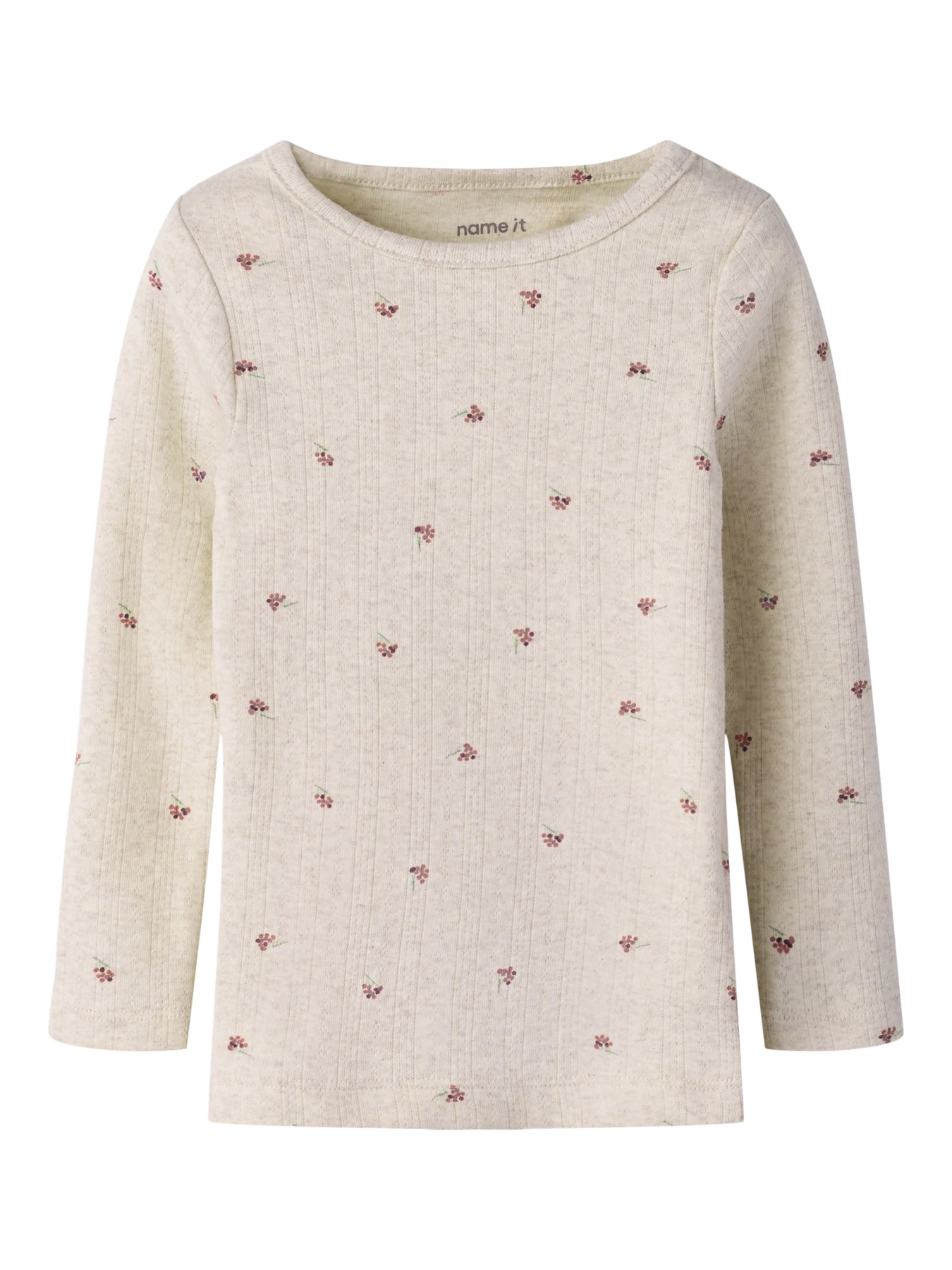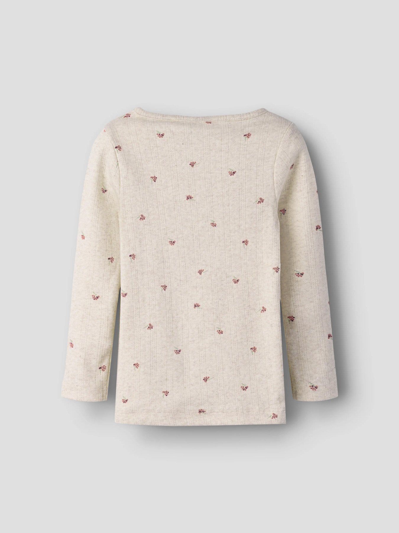 En yndig bluse med lange ærmer fra Name it i en helt lys beige farve og med bærprint. Blusen er i det smukkeste hulmønster.