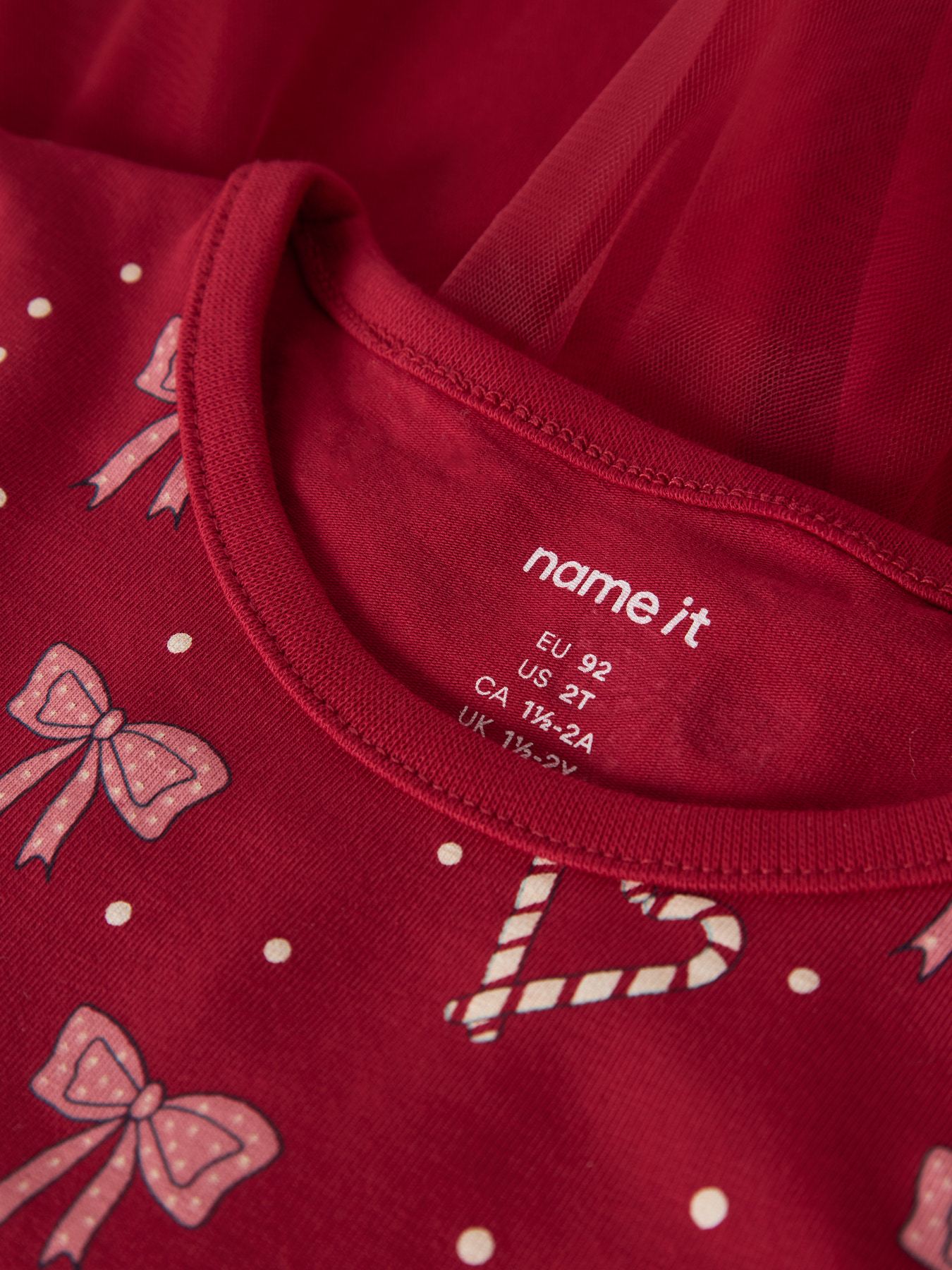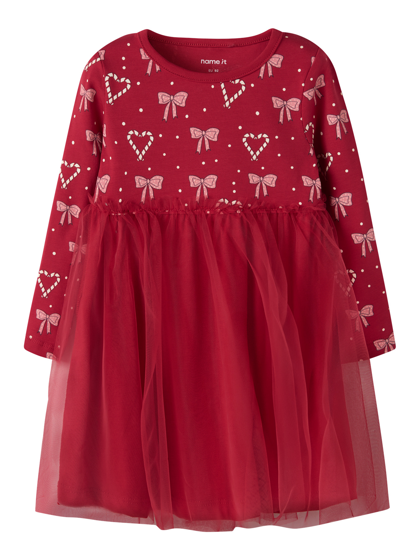 Smuk jule kjole fra Name It med tyl nederst og et smukt allover print øverst.