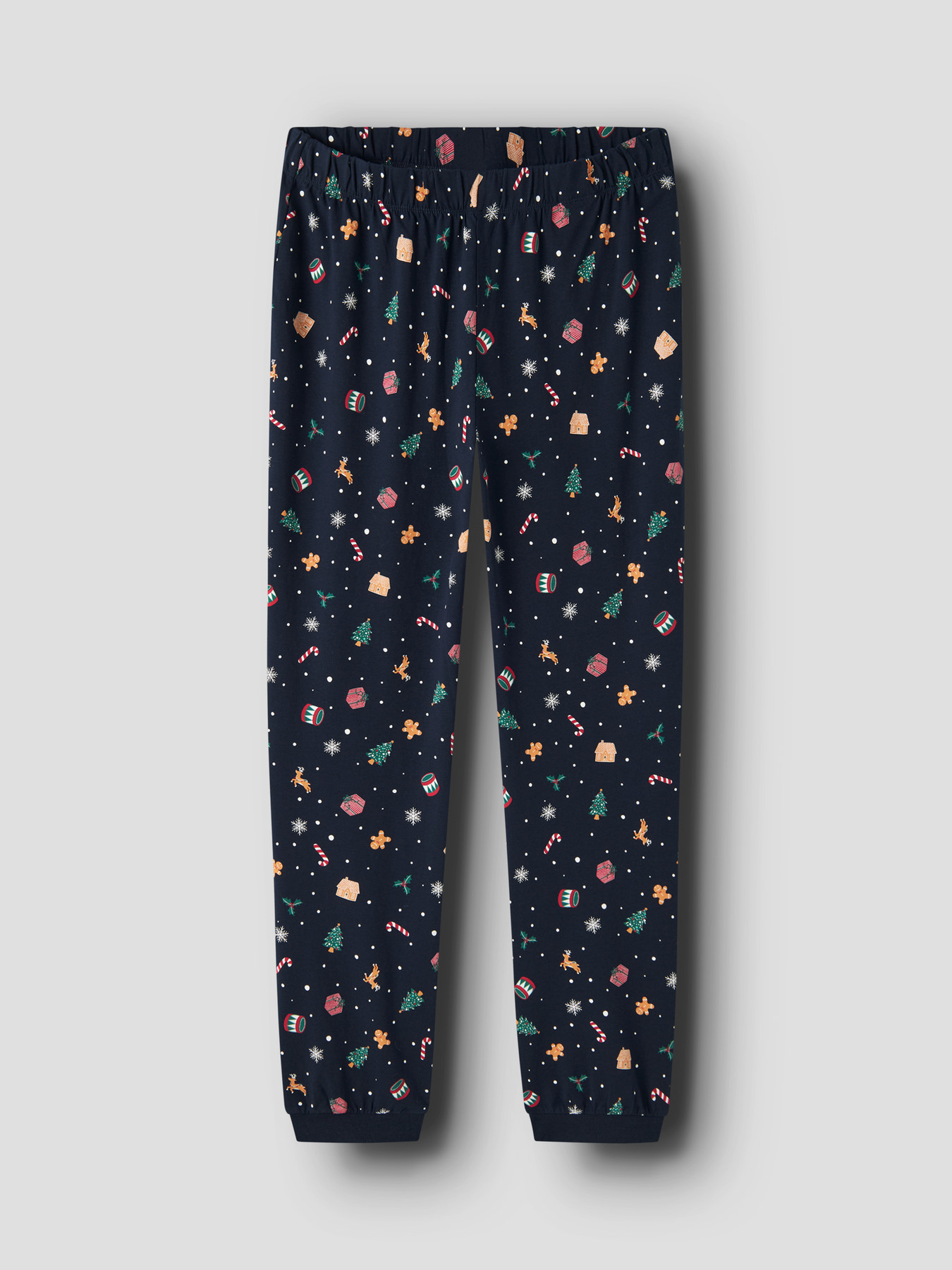 Mega fint jule natsæt fra Name it med bukser og bluse. Sættet er i flot mørk blå farve med skønt print af forskellige juleting. Blusen er med lange ærmer og sættet er unisex.