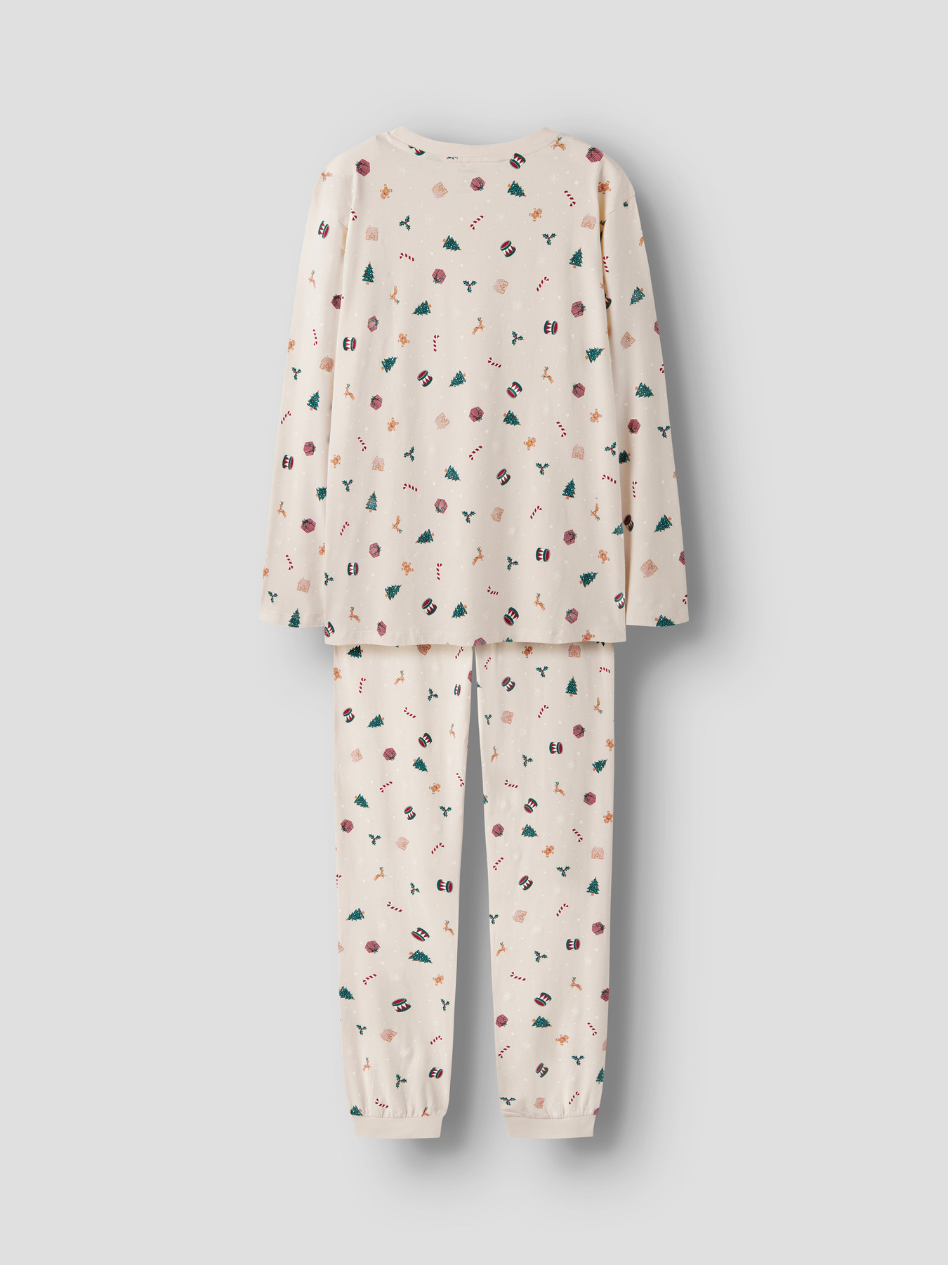 Mega fint jule natsæt fra Name it med bukser og bluse. Sættet er i flot lys farve med skønt print af forskellige juleting. Blusen er med lange ærmer og sættet er unisex.