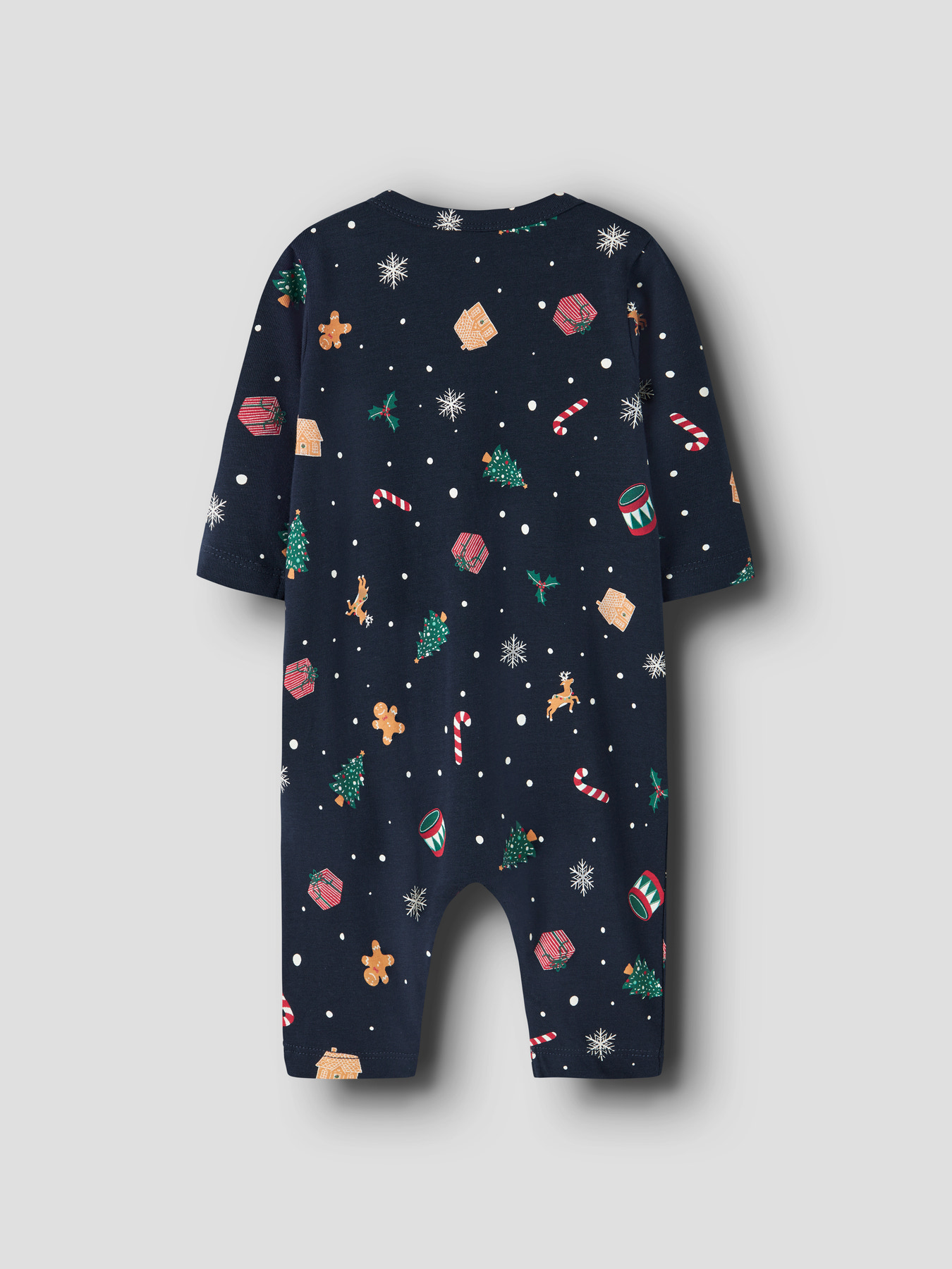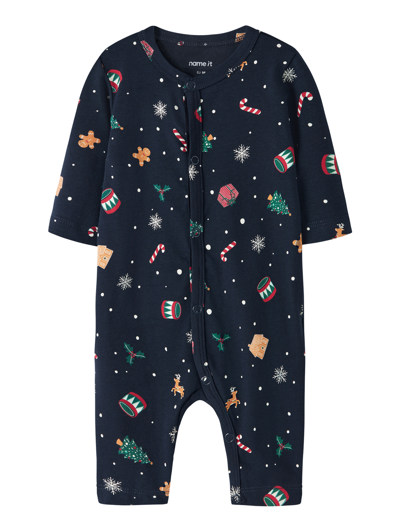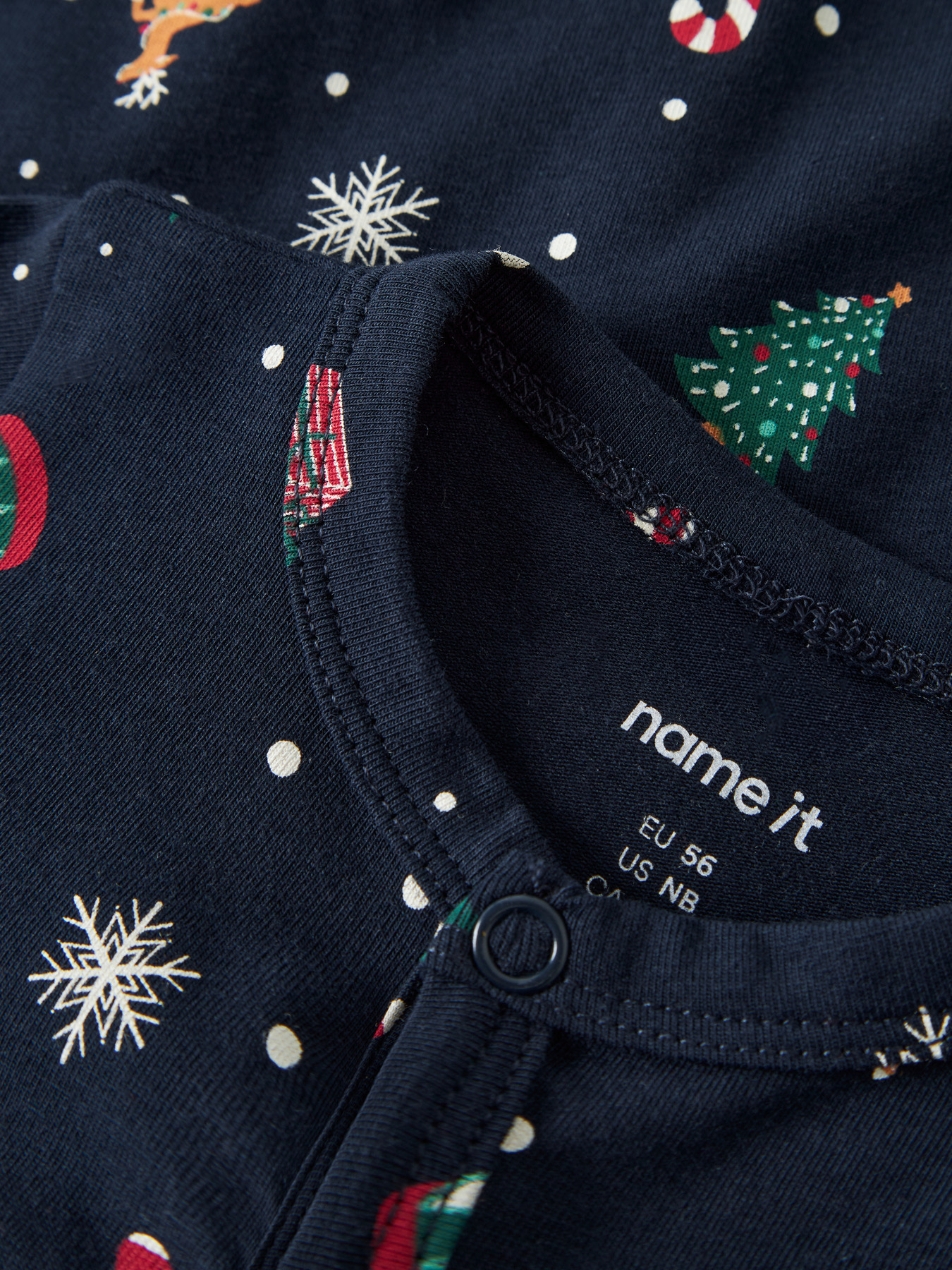 Sødeste natdragt fra Name it i flot mørk blå farve med forskellige jule motiver. Dragten er med trykknapper hele vejen ned så den er nem at få af og på. Den er unisex.