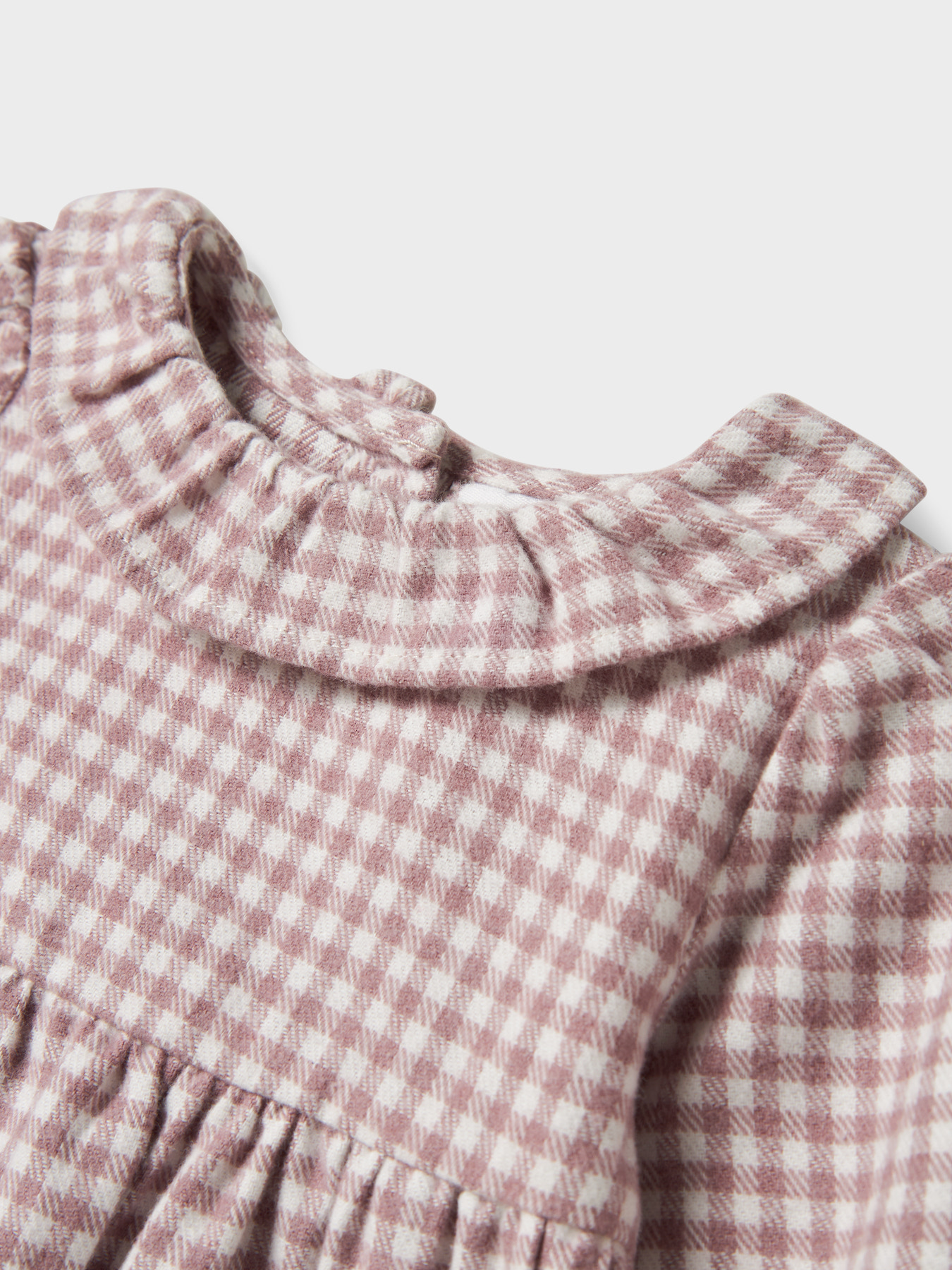 Den sødeste kjole fra name it. Kjolen er i en sød farve med tern. Flæse krave og elastik flæsekant ved ærmet. Kjolen har knapper i ryggen.