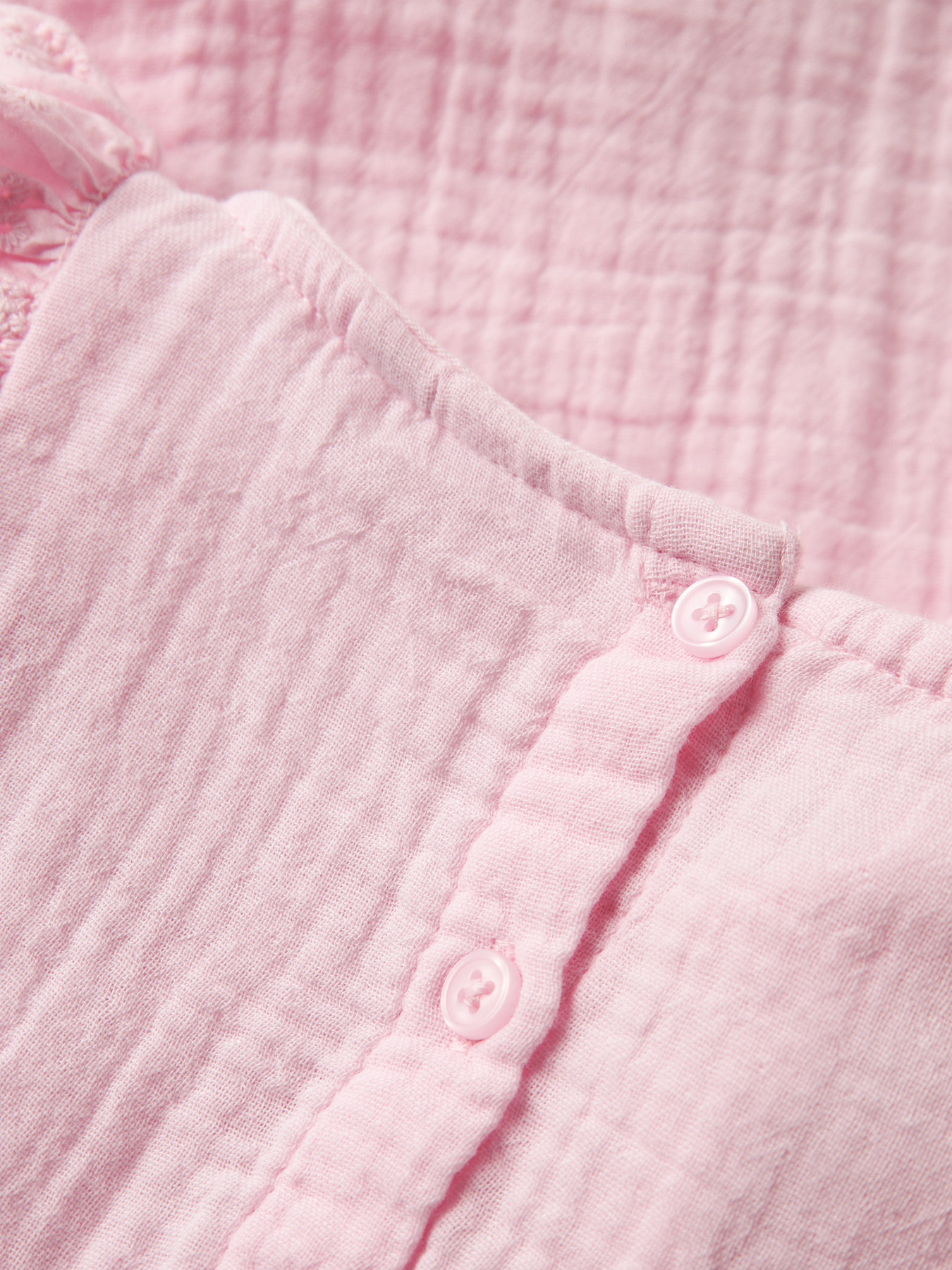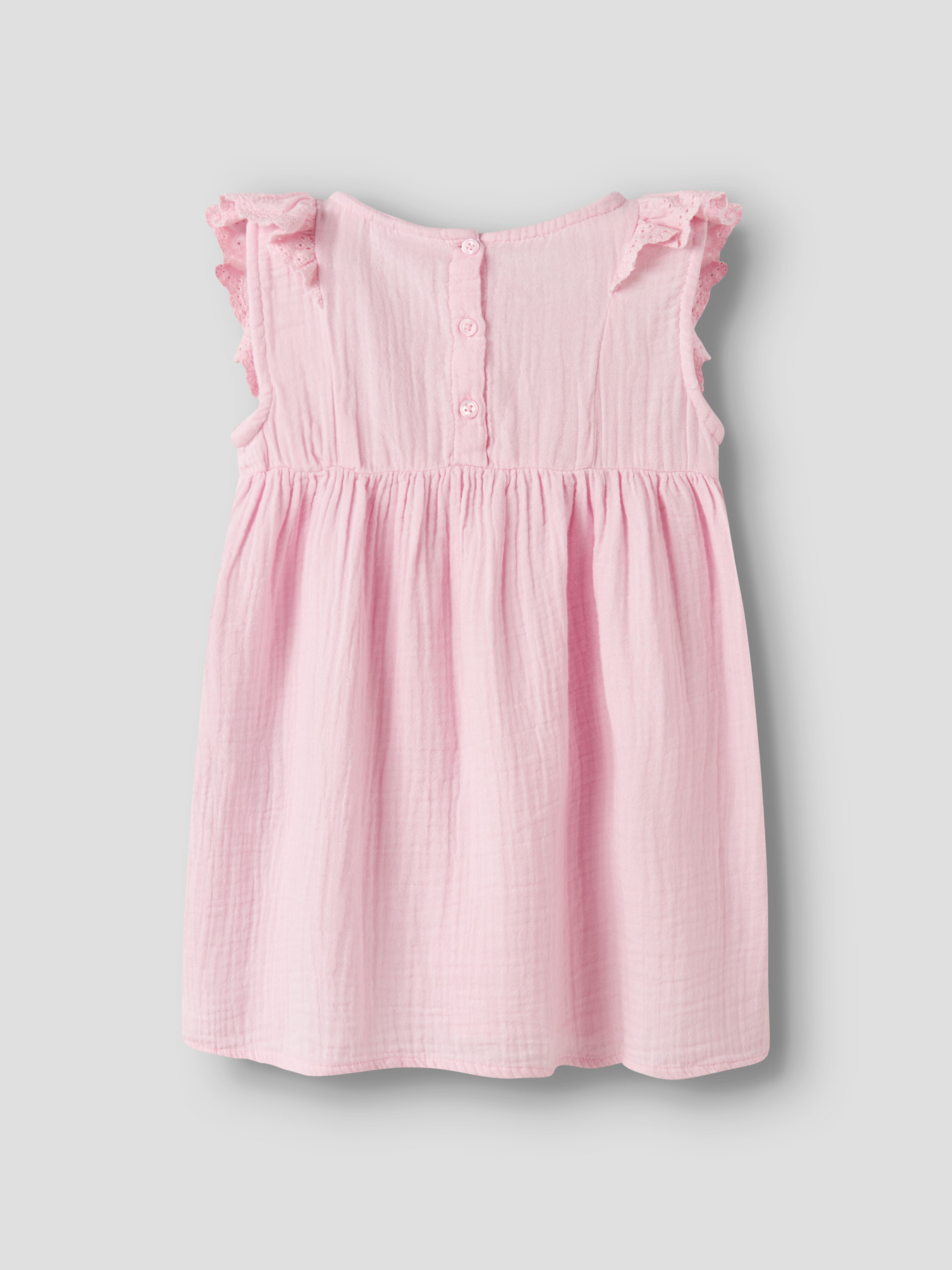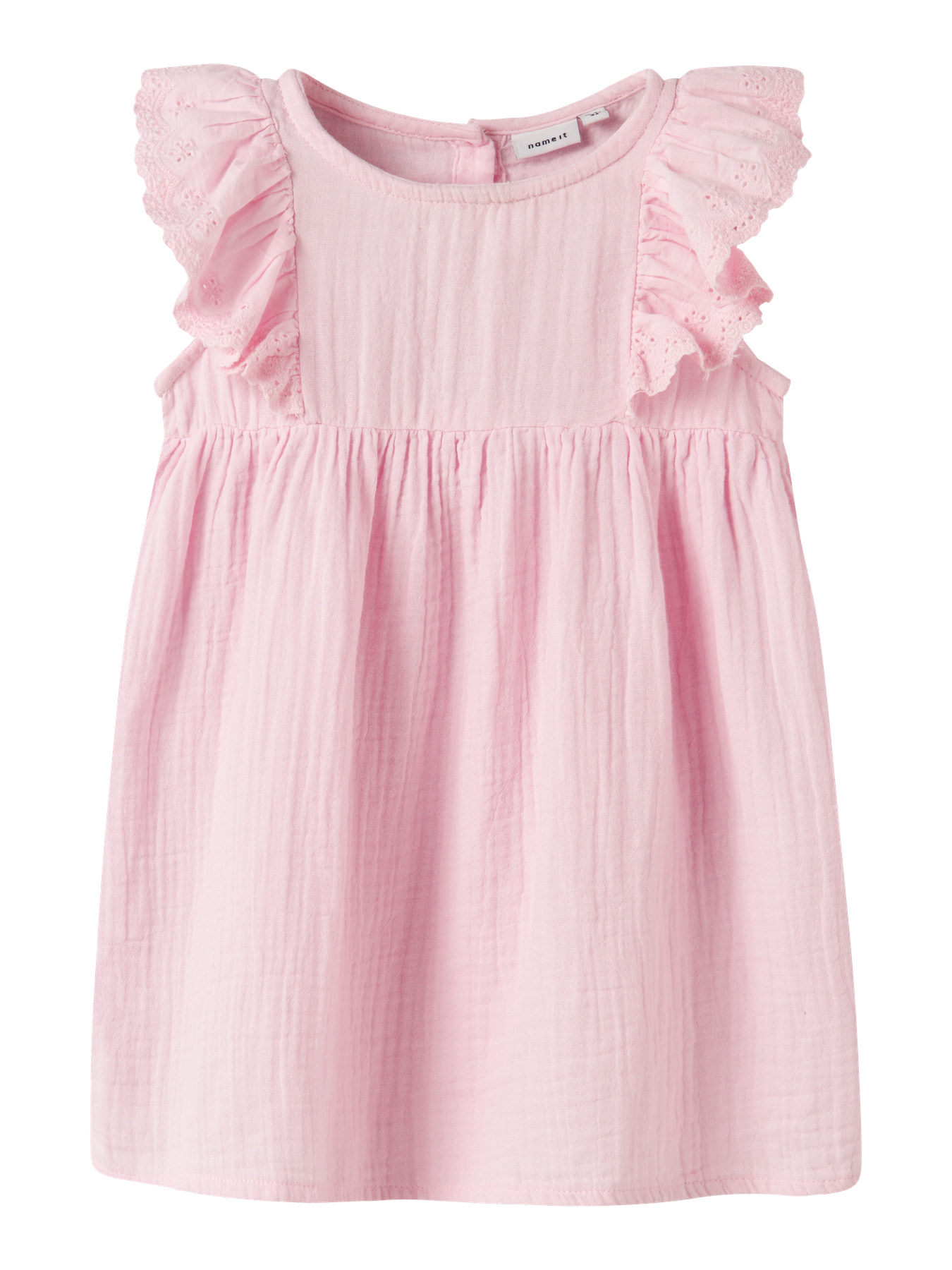 Den sødeste kjole fra name it. Kjolen er i en flot farve, med de fineste blondeflæser ved skulderen, den har korte ærmer og med 3 små knapper i ryggen.