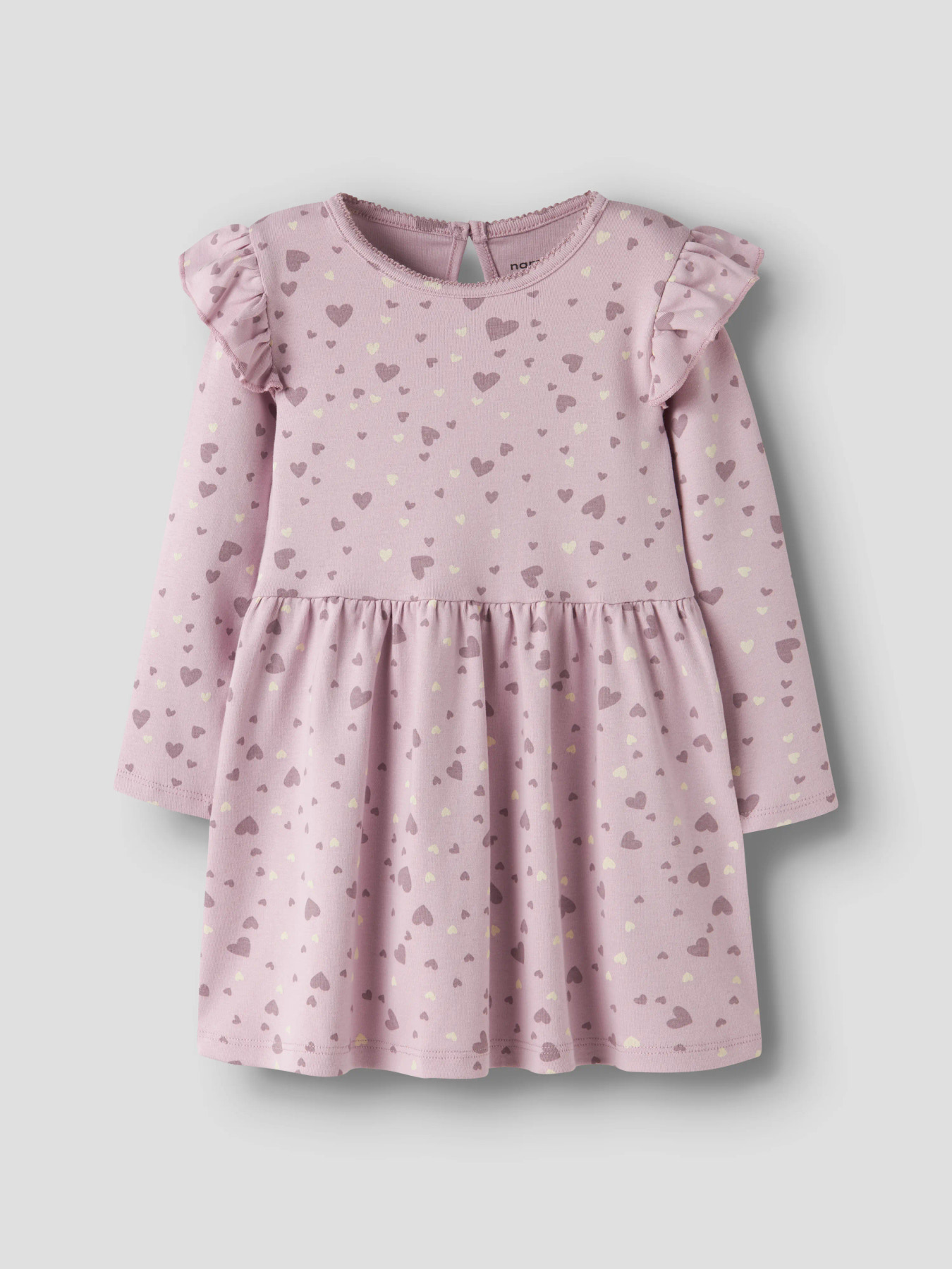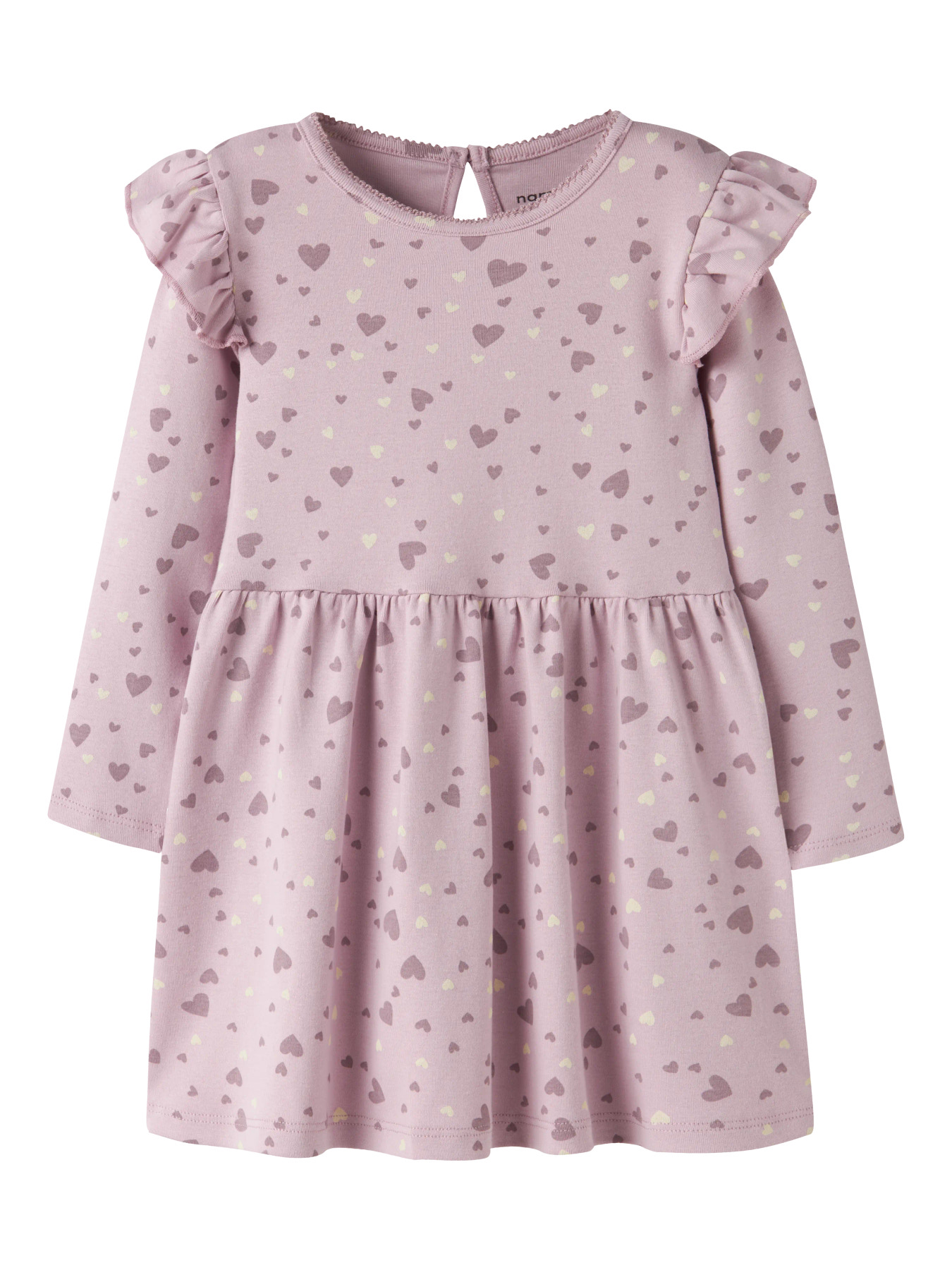 Den fineste, lyserøde kjole med små hjerter på fra Name it. Kjolen har trykknapper ved den ene skulder, rund halsåbning, flæser på skuldrene og lange ærmer.