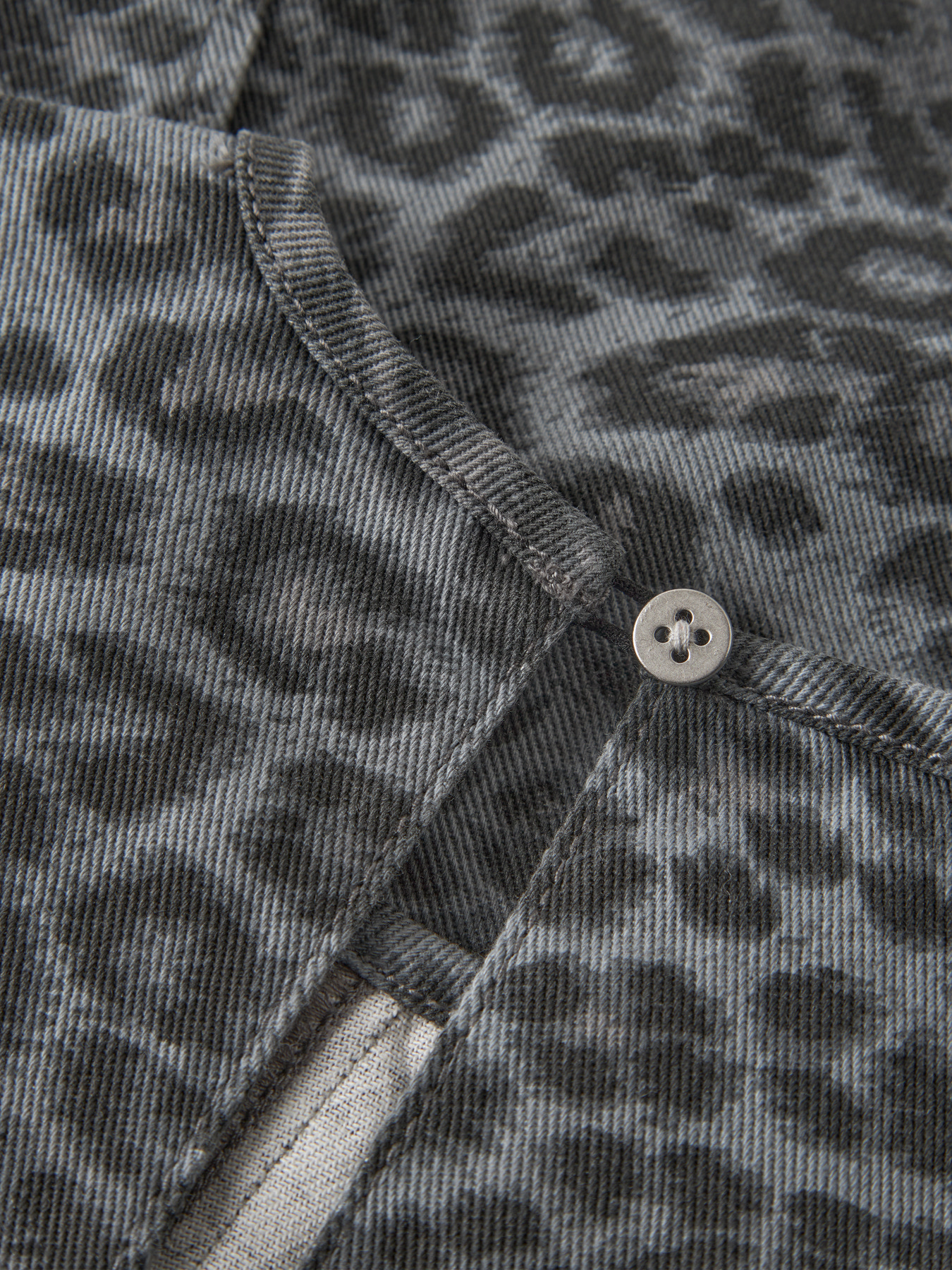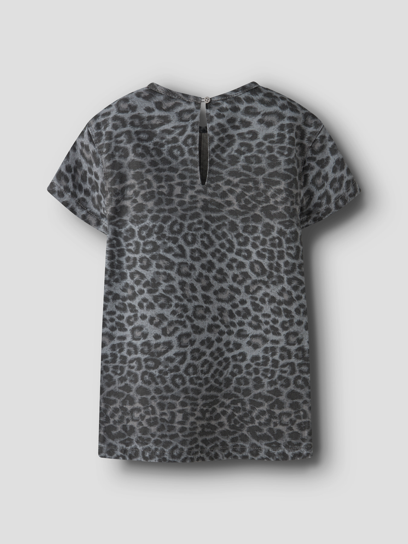 Sødeste søde denim kjole fra Name it. Den er med møg sejt leo print i forvaskede farver. Den er i lige fit, med korte ærmer og rund hals. Den er med hul knap lukning i nakken.