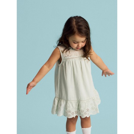 Opfrisk dit barns garderobe med en smuk og cool kjole, der passer til både hverdag og særlige lejligheder året rundt. Kjolen er lavet i vævet stof med klassisk struktur og et elegant udtryk. Designet med høj hals, uden ærmer, knaplukning, fine blondedetaljer og en behagelig regular fit.