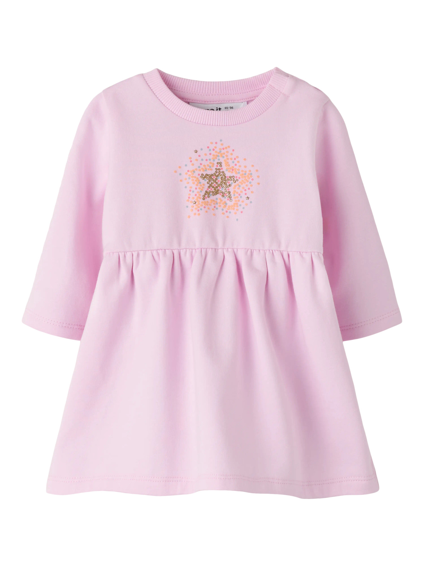 Smukke og cool kjole, perfekt til alle sæsoner og lejligheder. Kjolen er lavet i blødt børstet sweatstof med en dejlig blød inderside for komfort hele dagen. Den har rund hals, lange ærmer og et glimmerprint, der giver et funklende og moderne look. Klassisk pasform.