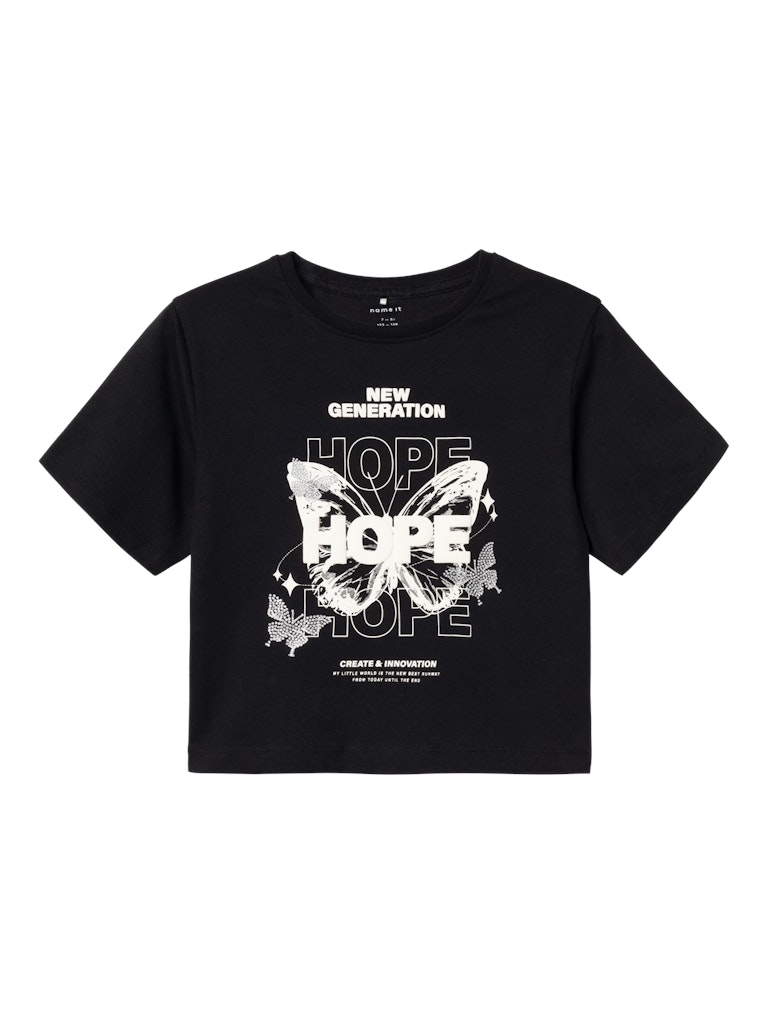 Super cool t-shirt fra name it. Den er med korte ærmer, er rund i halsen og er lavet i en blød og lækker kvalitet. Trøjen er lavet i en lidt kort model og så er den med et sejt print med sommerfugle på maven.