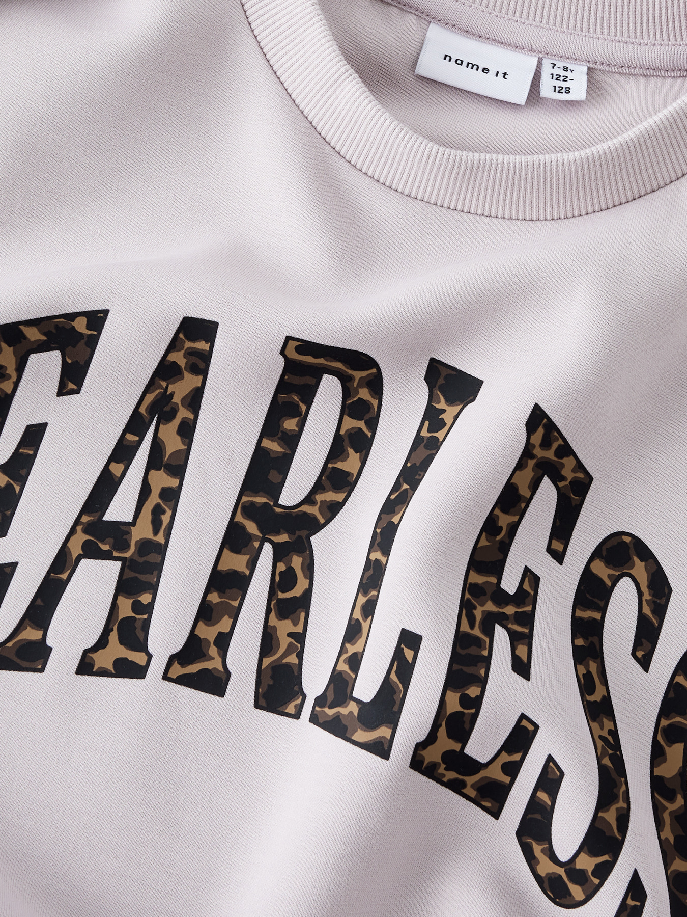 Super sej kort sweatshirt fra name it. Den er i en svag lilla farve med tekst på foran.
