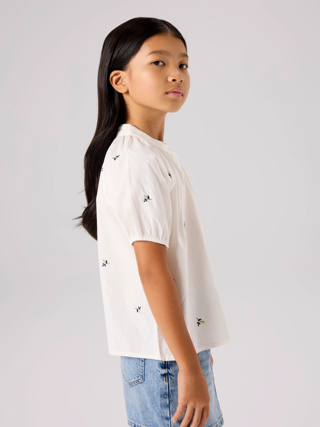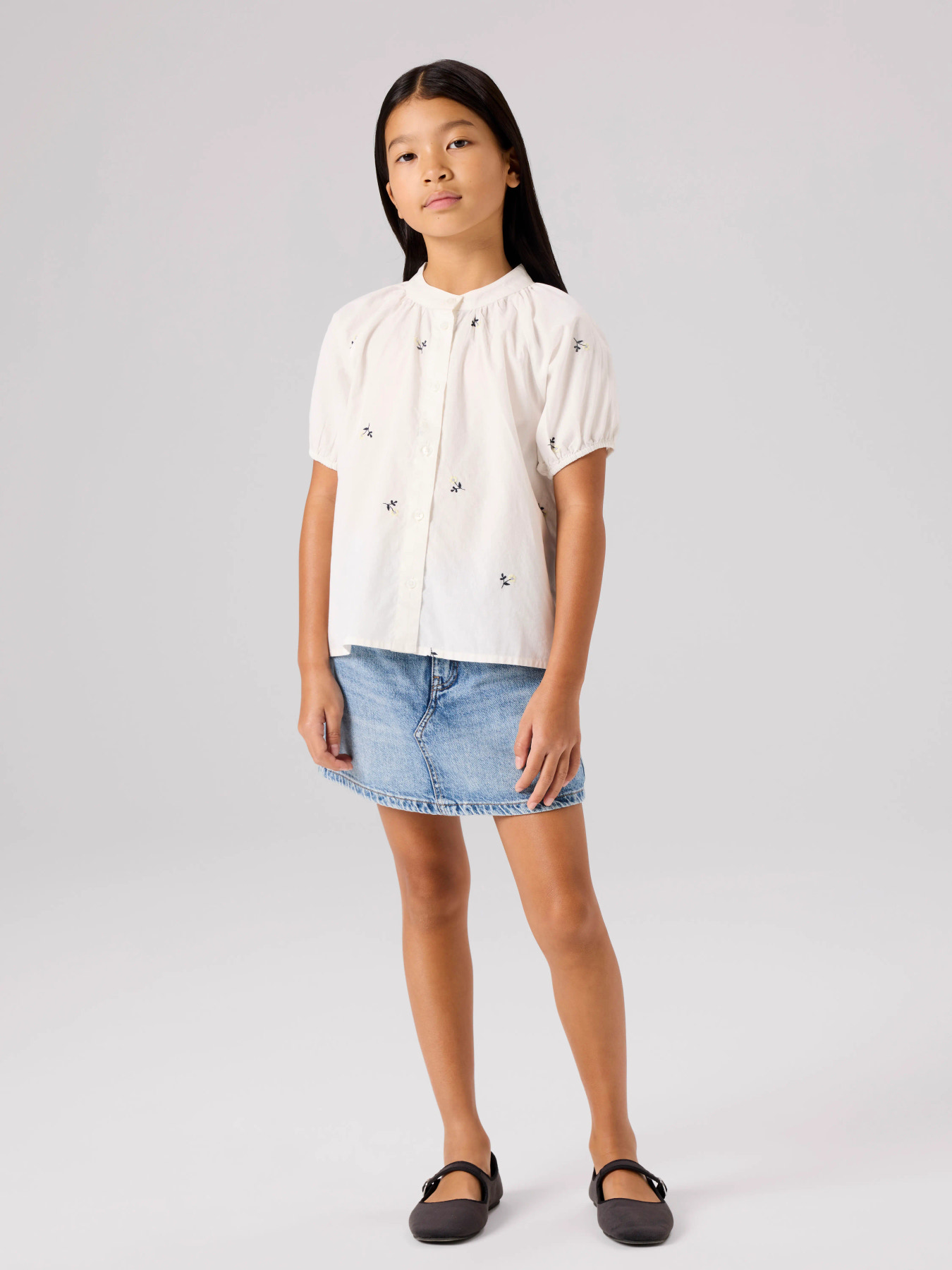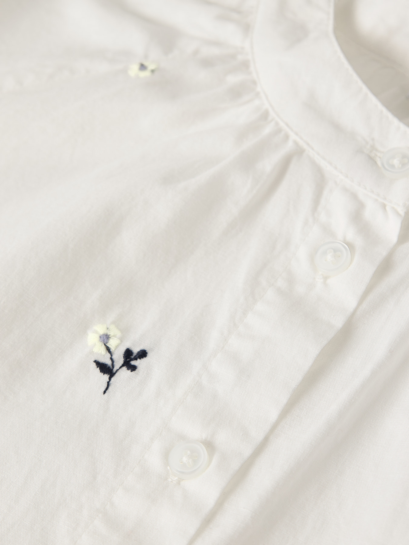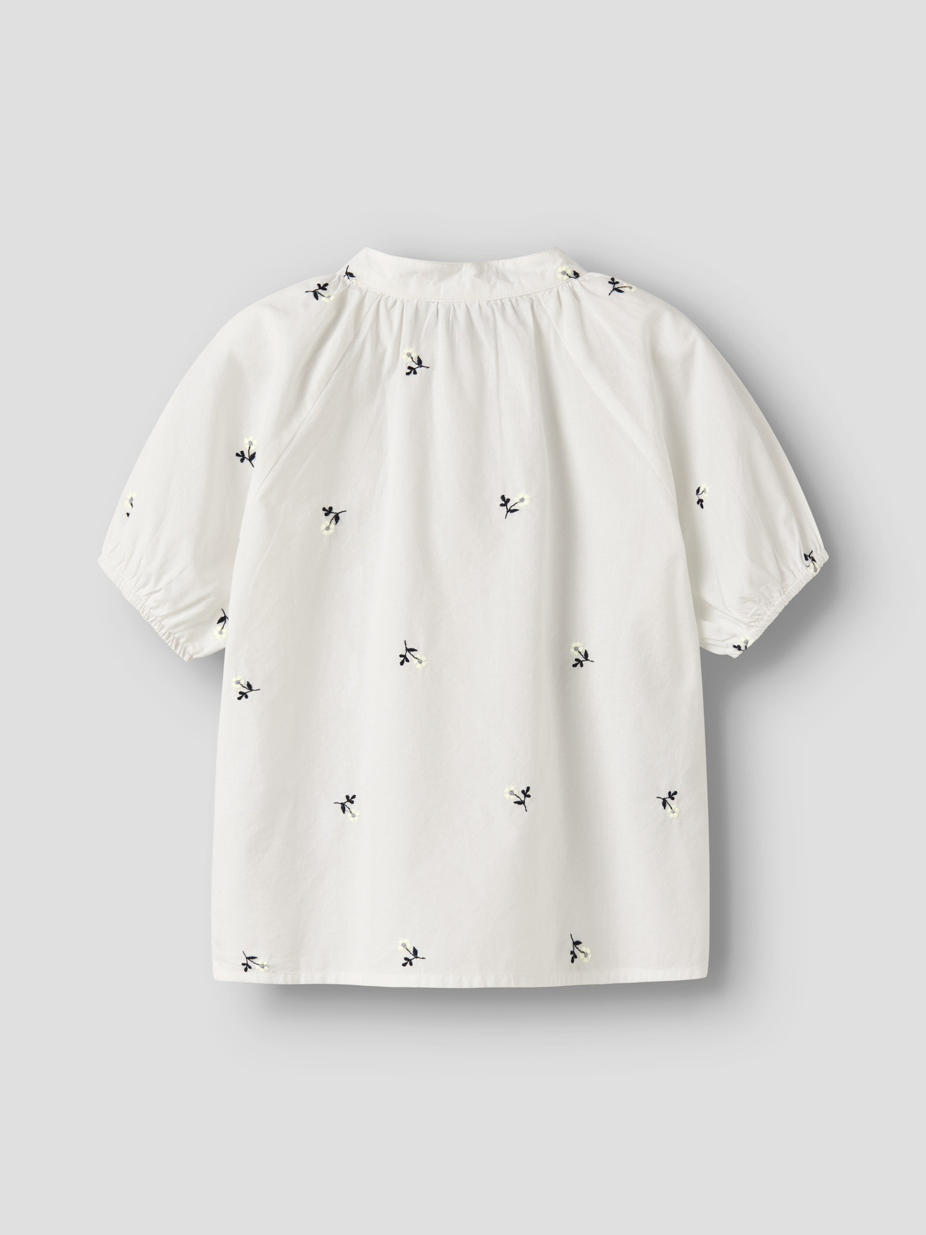 Skjorten er lavet i let poplin med en glat og ensartet overflade, som giver et skarpt og stilrent udtryk. Den har kina-krave, korte ærmer og knaplukning foran. Den løse pasform sikrer god komfort, mens fine broderidetaljer tilfører et ekstra stilfuldt touch.