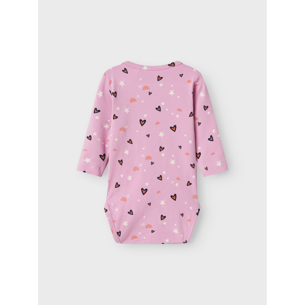 Mega sød langærmet body fra Name it med skønt print af små hjerter, stjerner og regnbuer i fine farver. Bodyen lukkes med trykknapper.
