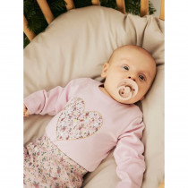 Den sødeste body fra Name it. Den er med lange ærmer, er rund i halsen og er lavet i en blød og lækker kvalitet. Bodyen er med trykknapper ved bleen og ved halsen og så har den det sødeste hjerte med blomsterprint på maven.