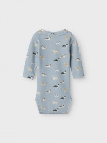 Super fin body fra Name it. Den er med lange ærmer, er rund i halsen og er lavet i en blød og lækker modal kvalitet. Bodyen er i det lækreste rib og er i en fin farve med print af små dyremotiver. Bodyen er med trykknapper ved bleen og med en knappebjælke med tre knapper ved halsen.