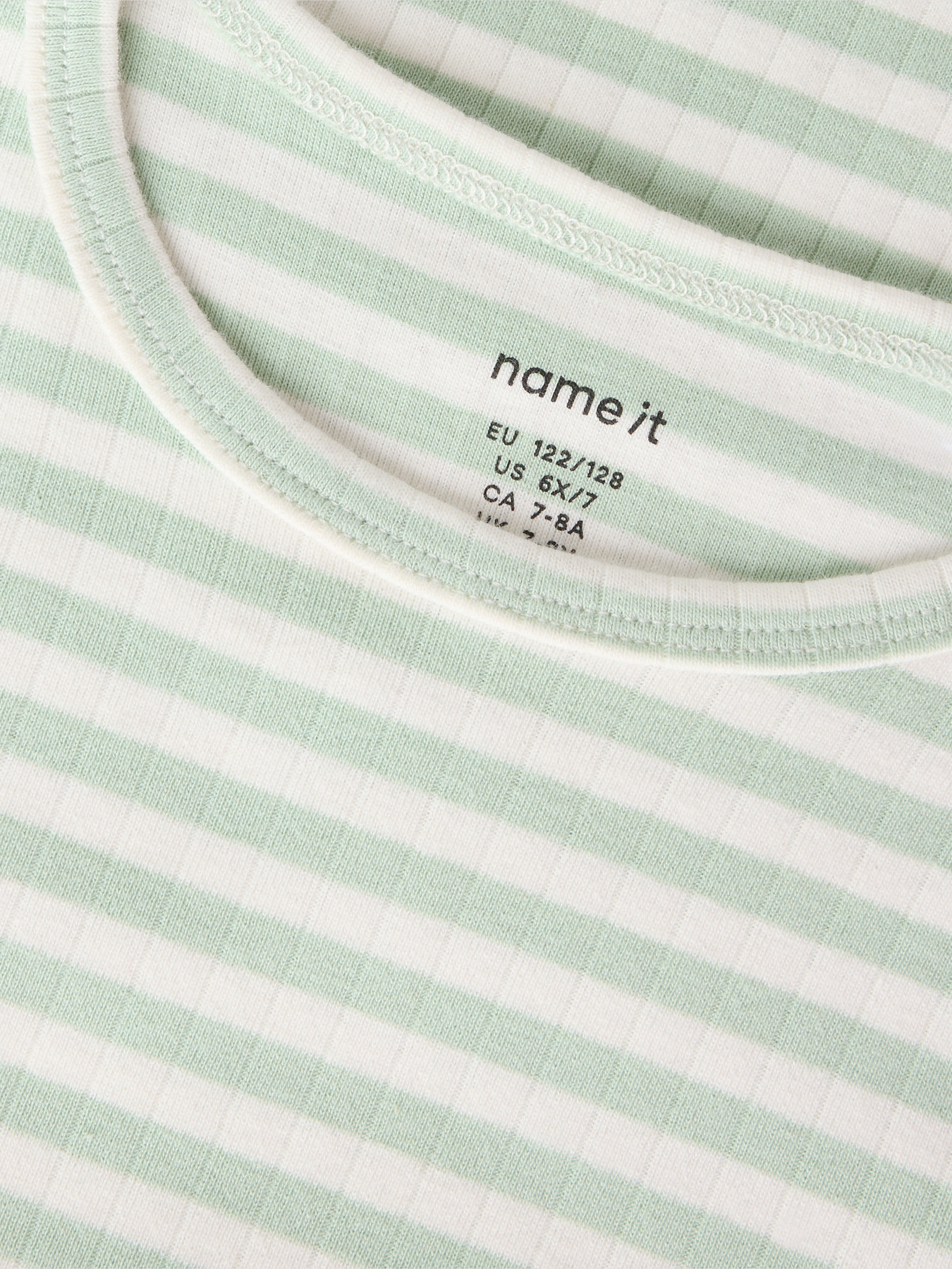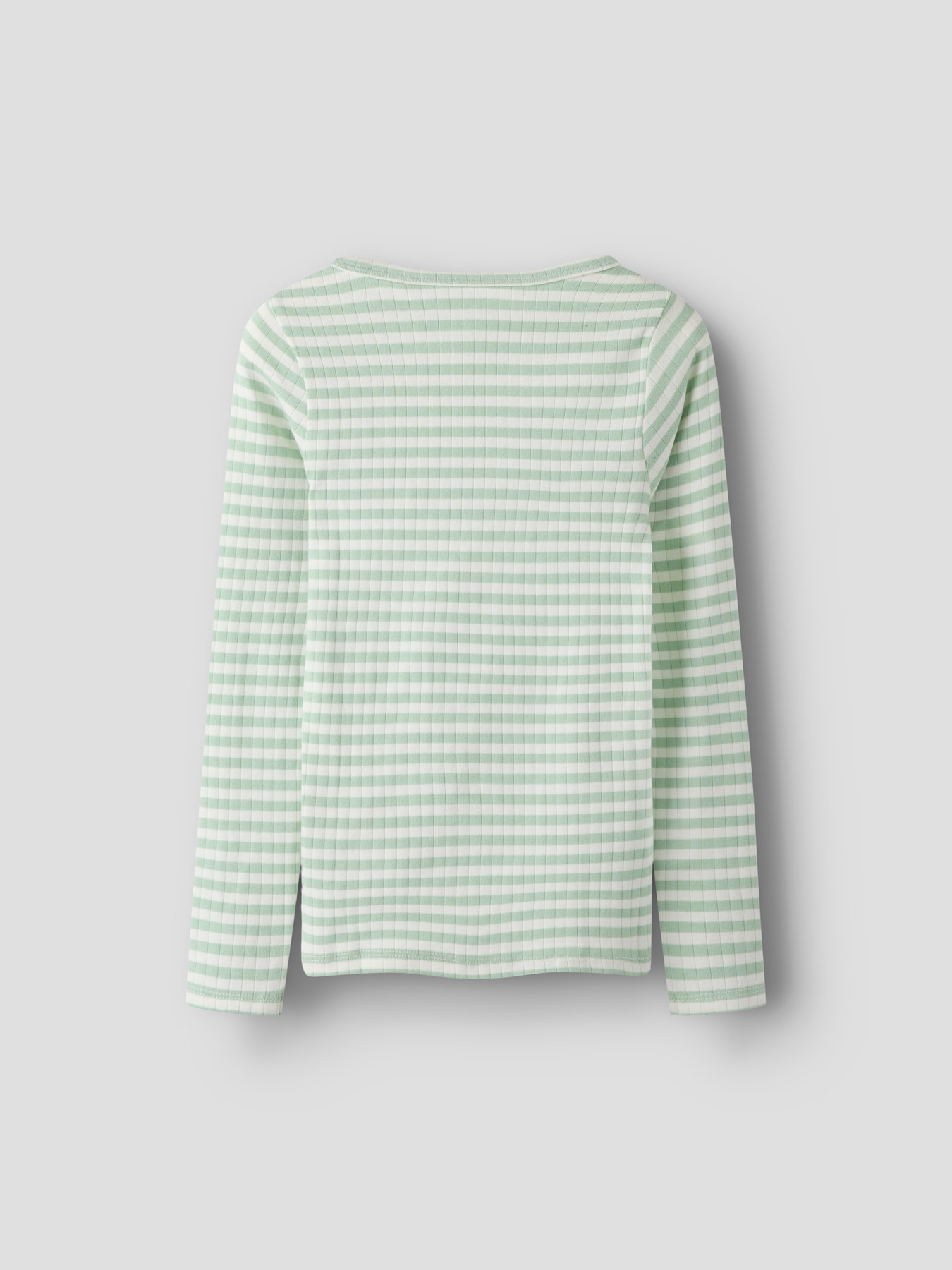 Lækreste, stribede rib basis bluse fra Name It og med lange ærmer. Blusen har rund halsåbning og i en lækker elastisk bomuldskvalitet.