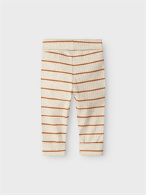 Mega søde leggings fra Name it. Bukserne er i blødt rib stof og fint stribet print. De er med foldekant i livet og ved fødderne.