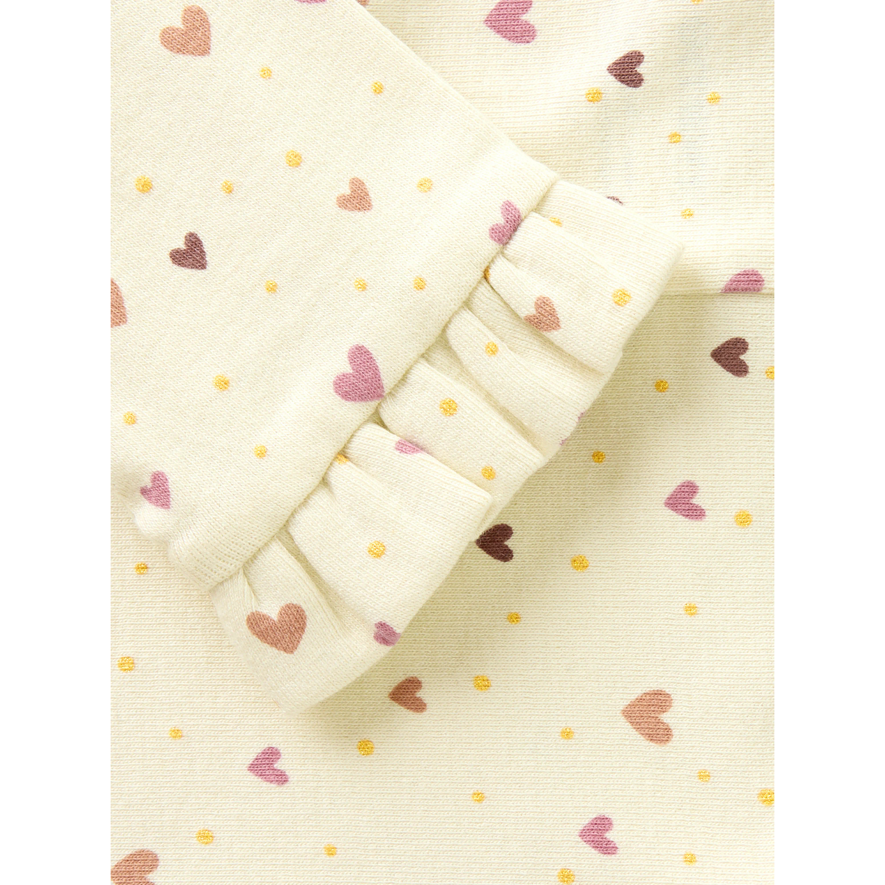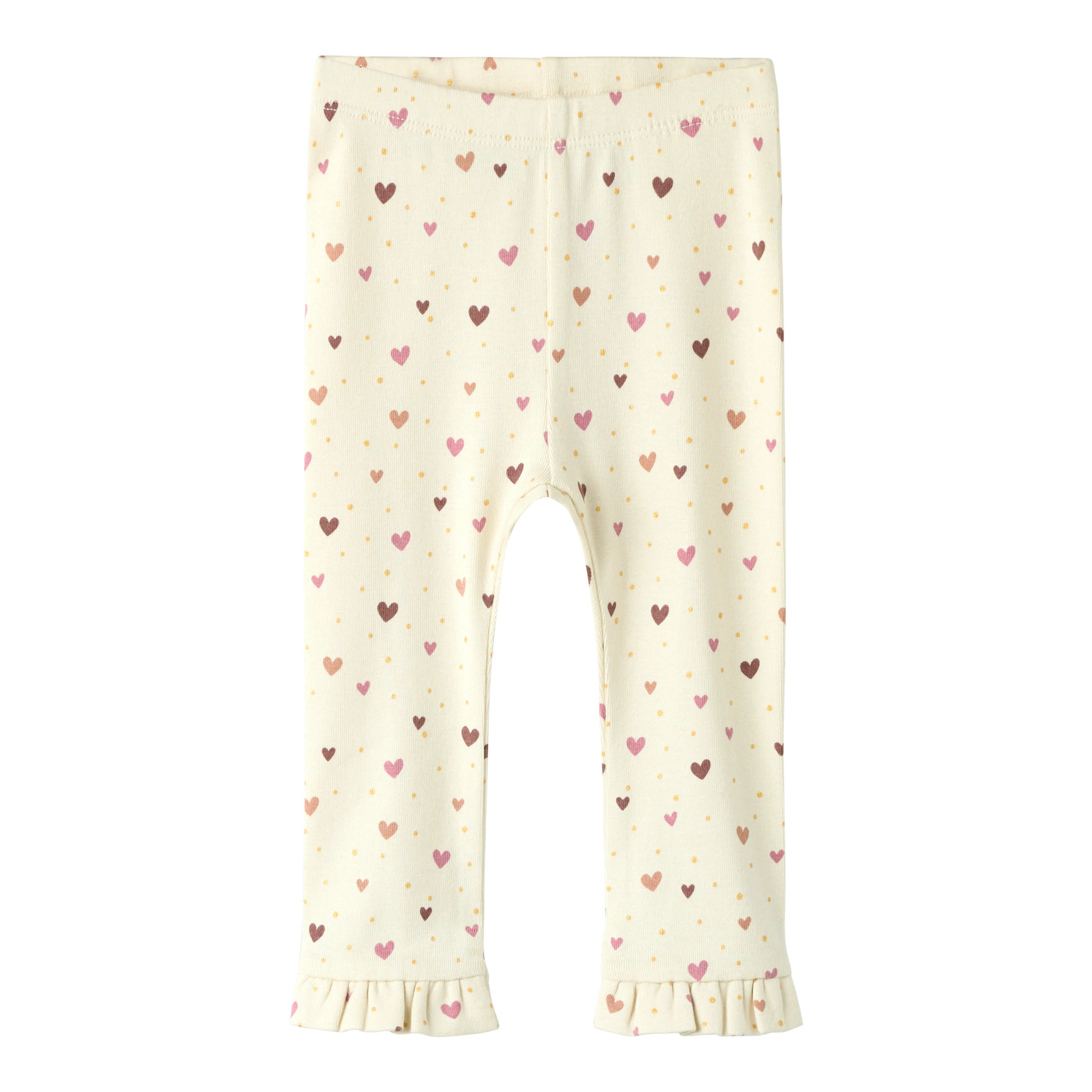 Disse leggings har et sødt print af hjerter og prikker over det hele. De er designet med fine flæser ved benåbningerne og er fremstillet i en blød ribkvalitet, der giver god strækbarhed. Den behagelige pasform gør dem ideelle til leg og bevægelse.